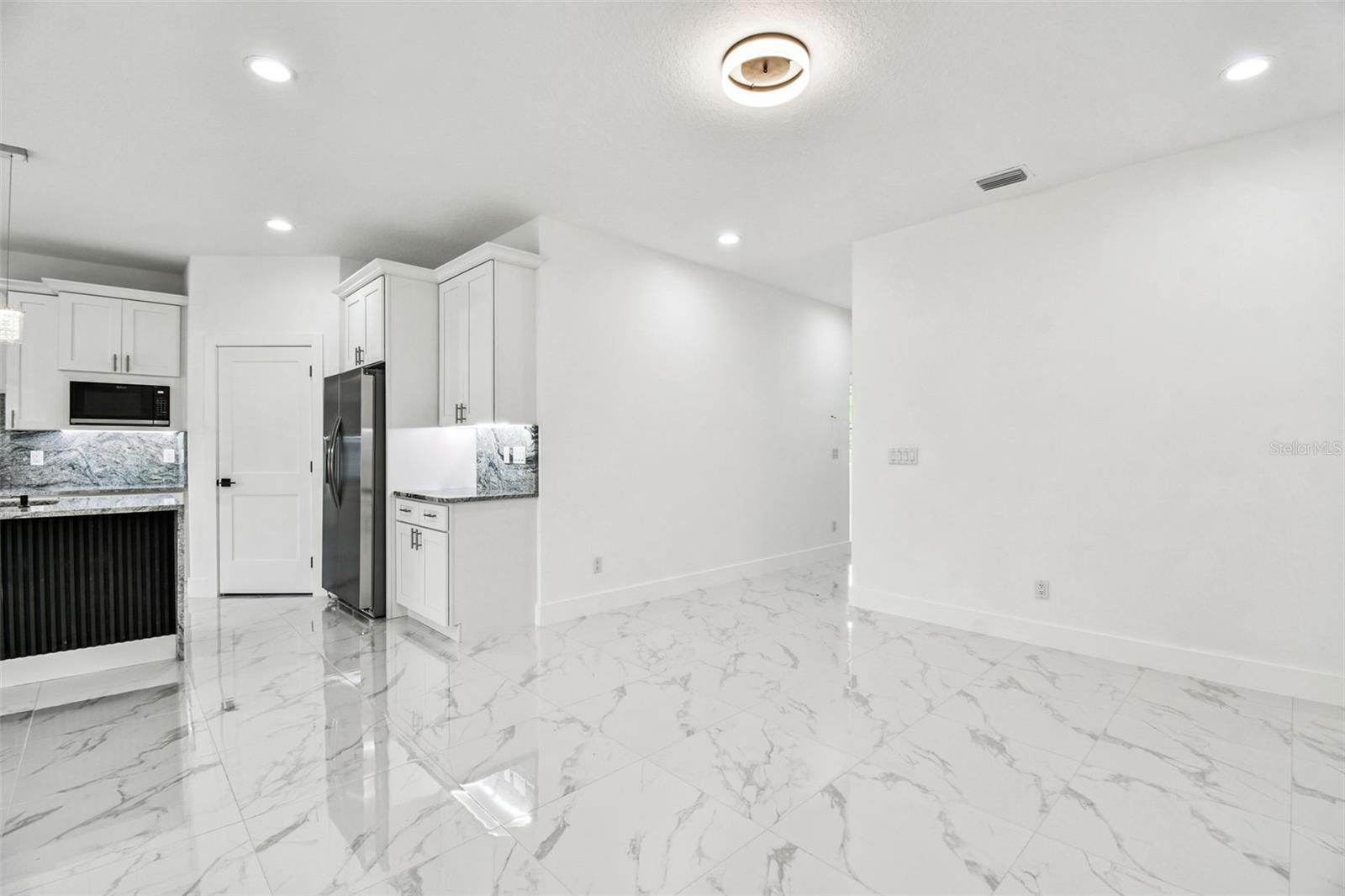 Beautiful and spacious 3-bedroom, 2-bath home! You’ll be impressed from the moment you step inside. Features include 9.4-ft ceilings, 42-inch wood cabinets with soft-close doors and drawers, full backsplash, and porcelain tile floors throughout. Enjoy impact-resistant windows, beautiful baseboards, and an interior laundry room. The open-concept kitchen overlooks the living area and includes Frigidaire stainless steel appliances — refrigerator, range, dishwasher, and microwave — plus a large granite island perfect for entertaining. Other highlights include French doors with internal blinds, ceiling fans in every room, and a covered back porch leading to a fully fenced backyard.