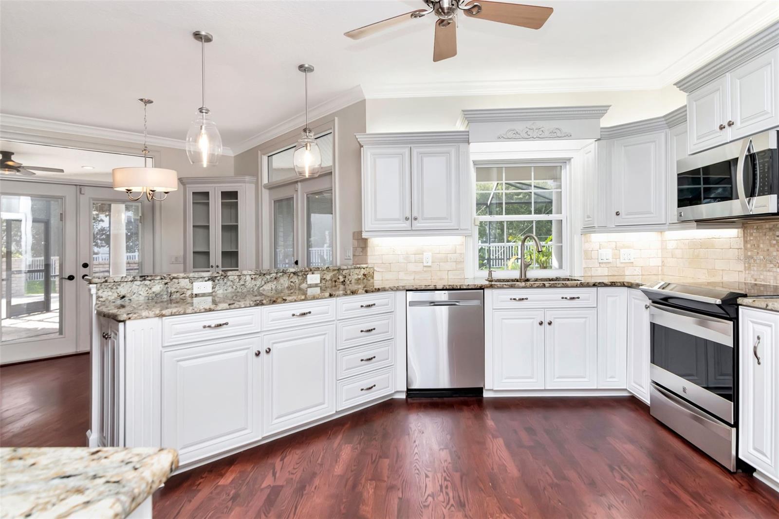Welcome to your storybook Southern home in the highly coveted, gated community of The Village at Scott Lake. This stunning 3-story, 6-bedroom, 3.5-bath pool home offers 3,364 sq. ft. of heated space (4,162 total) and sits on a beautifully landscaped .33-acre lot — perfect for entertaining and outdoor living. From the moment you arrive, this classic Southern-style home captures attention with its large covered front porch, stately columns, high-pitched roof, and three gabled dormer windows that flood the home with natural light. The perfect symmetry, lush landscaping, and welcoming oversized front yard create incredible curb appeal. A side-entry 3-car garage with an extended driveway (complete with basketball hoop!) offers plenty of parking and play space. Inside, the first floor features wood flooring throughout, a dedicated home office/ study, formal dining room, spacious living room with a cozy wood burning fireplace and a beautiful kitchen with granite countertops, island bar, and breakfast nook. Three French doors open out to the massive screened lanai with pool/spa — the perfect place for weekend barbecues, Sunday football, or quiet evenings. Beyond the screen enclosure, you’ll find the brick-pavers continue making a large sitting area perfect for a firepit. The yard is fully fenced with tropical landscaping, and plenty of yard space to play. On the second floor, the primary suite boasts a completely renovated spa-like bath with stand-alone soaking tub, tiled shower, and walk-in closet. Four additional bedrooms and a convenient laundry room complete the second level. The third floor offers a spacious bonus room with balcony and another en suite bedroom, ideal for guests, teens, or a media/game room. Additional improvements include 2 new HVAC's with a 10 year warranty (2025), new interior paint (2025), wood floors sanded and stained (2025), new primary bath shower with all work under warranty. The Village at Scott Lake provides resort-style amenities including a clubhouse, tennis courts, and private boat ramp to Scott Lake. Club house is free for all residents to reserve for events. This prime location is central to everything — dining, shopping, schools, and major highways — while still offering the privacy and security of a gated community. This home is a rare find, combining classic Southern architecture, modern updates, and a spacious floor plan — truly a one-of-a-kind opportunity in one of Lakeland’s most coveted neighborhoods.