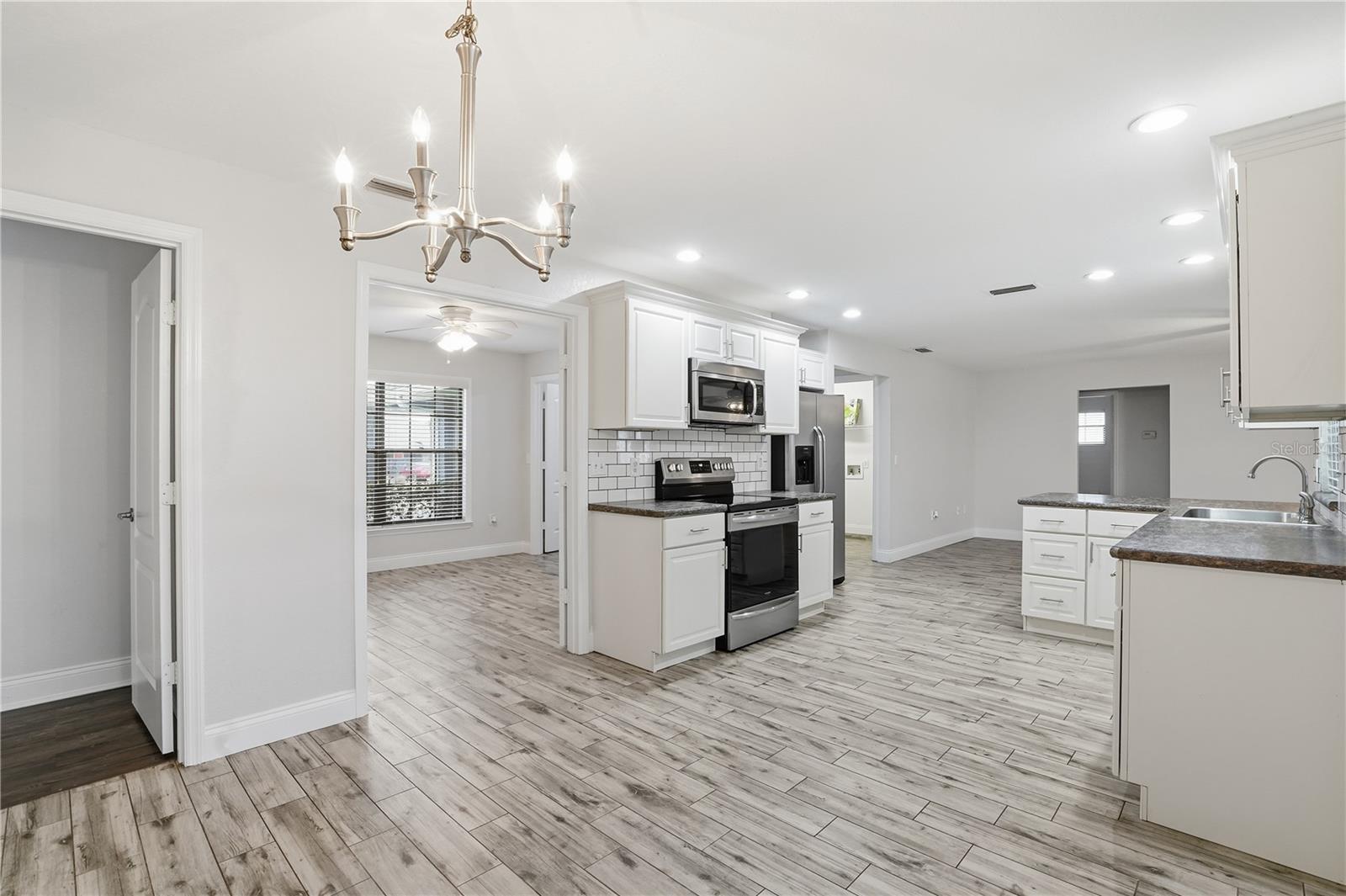 This inviting 3-bedroom, 2-bath ranch-style home features fresh interior paint, new carpet, and an open floorplan designed for easy living. The beautiful kitchen showcases painted cabinets, a breakfast bar, and subway tile backsplash, while tile floors and a stone fireplace add warmth and character to the living area. Step outside to a sparkling backyard pool, perfect for relaxing or entertaining.