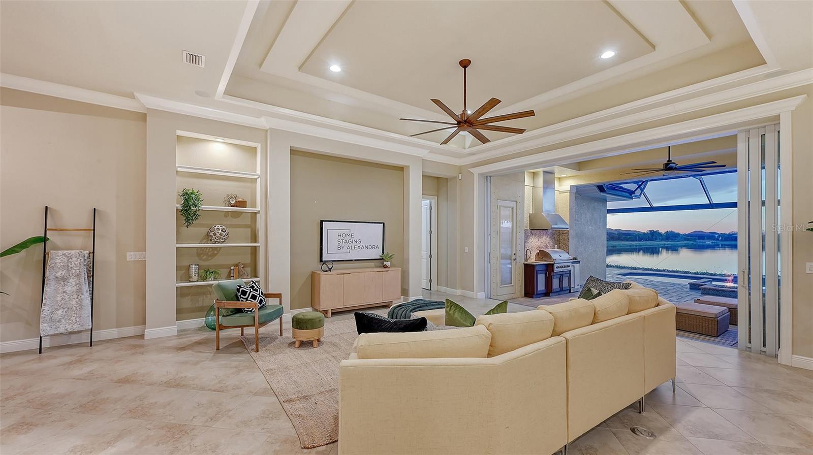 Welcome to your oasis in Country Club East! This exquisite West Indies style residence, custom designed by Lee Wetherington in 2016, offers a luxurious retreat nestled amidst lush, meticulously maintained landscaping with breathtaking long lake views. Boasting over 2,800 square feet of meticulously crafted living space, this home features 3 bedrooms, 3 full baths, a convenient half bath, and a versatile office/den. The expansive great room impresses with a detailed tray ceiling, custom shelving, and 10’ sliding doors that seamlessly blend indoor and outdoor living. The chef's kitchen is a culinary haven, showcasing granite counters, light cabinetry, stainless steel appliances, a 5-burner gas cooktop with vented hood, hidden pantry, and a generous island with a wine fridge, seating, and storage. Retreat to the sizable master suite, offering dual walk-in closets with built-ins and a spa-like bathroom complete with dual vanities, make-up vanity, granite counters, soaking tub, and a large frameless glass walk-in shower. Step outside to your stunning outdoor oasis, featuring a sparkling heated saltwater pool and spa, a cozy gas fire pit, clear view screens, a separate pool bath, and an expansive entertaining area with a fully equipped outdoor kitchen, perfect for alfresco dining and entertaining guests. Upgrades include recently added impact glass windows and shutters, whole house generator, 20 x 20 porcelain tile throughout the main living areas, extra-wide crown molding, designer fans and light fixtures, plantation shutters, window treatments, abundant closet and storage spaces, outdoor landscape lighting, iconeyne insulation, and more. Country Club East offers residents access to The Retreat Fitness and Aquatic Center, gated-community living, and easy accessibility to excellent shopping, dining, medical facilities, and I-75, providing an unparalleled lifestyle defined by relaxation and recreation. Welcome home to luxury living at its finest!