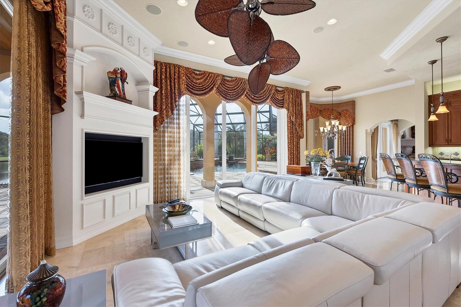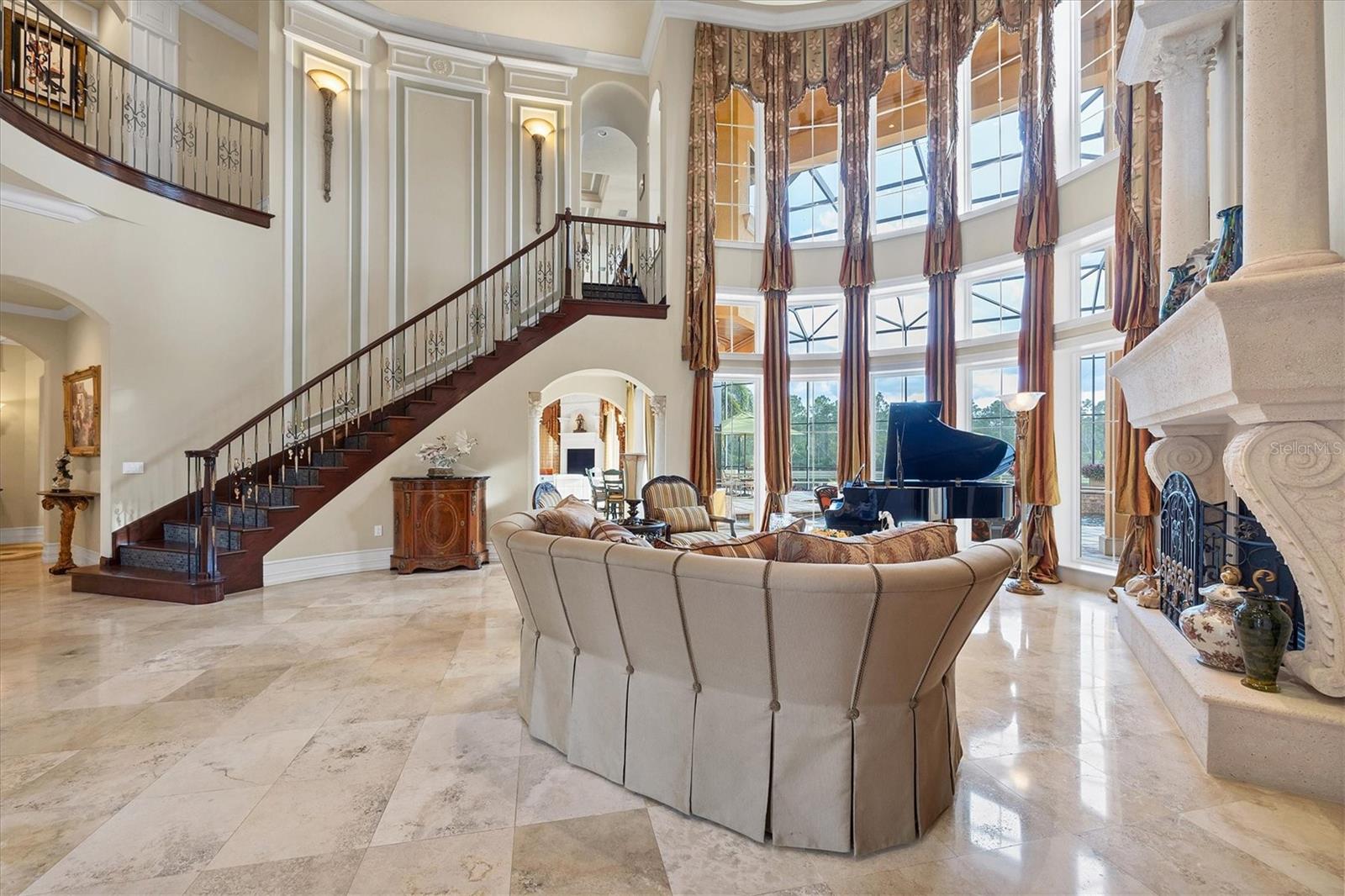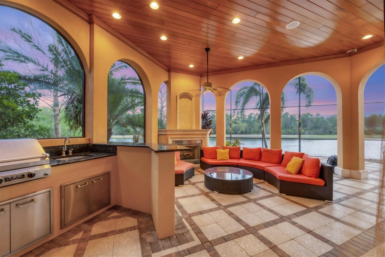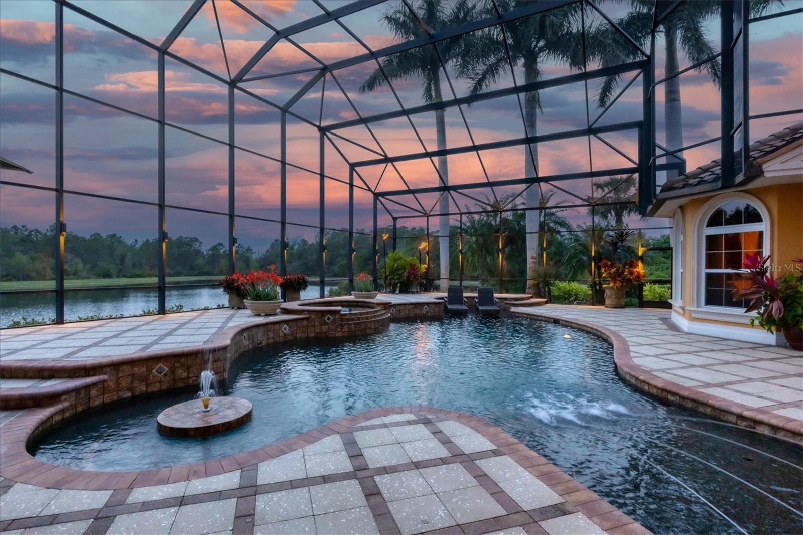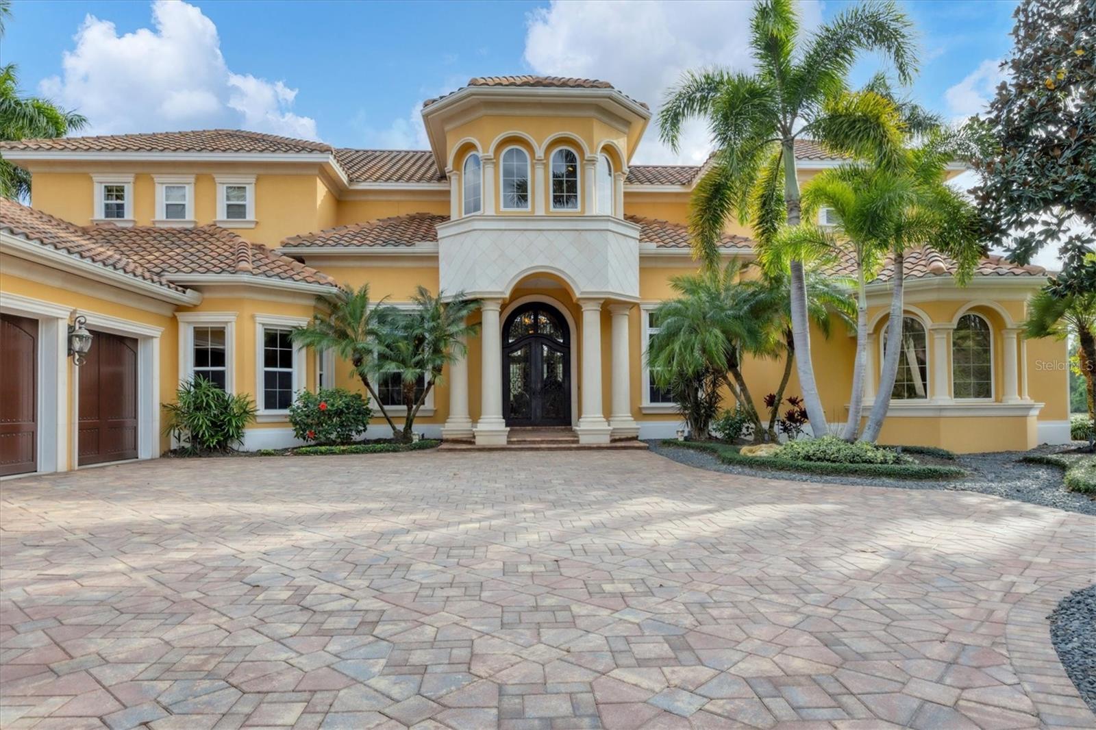 Located behind the gates of The Concession, 8341 Farrington Court embodies luxury living at its finest. This exceptional estate rests on an oversized lakefront lot, offering unparalleled water and sunset views. The residence spans over 8,000 square feet, boasting six bedrooms and six and a half baths, all meticulously crafted by Pruett Custom Homes. From the moment you step inside, a grand foyer welcomes you with a double iron door, travertine flooring, and elegant granite art shelves. The living room exudes sophistication with its arched pillared entry and intricate ironwork, and the luxurious staircase, featuring slate tile risers and a gold leaf iron and wood banister, adds a touch of grandeur. The kitchen is a culinary masterpiece, featuring custom wood cabinetry, thick granite countertops, and top-tier stainless steel appliances. Adjacent to the kitchen, the breakfast area offers a serene setting with an aquarium window overlooking the picturesque waterfront and landscape. The primary bedroom and adjacent office make a lavish retreat, boasting a raised seating area, a wall of windows with motorized shear panels, and an exceptional closet with custom wood cabinetry. The primary bath is equally inviting, featuring travertine flooring, a jacuzzi tub, and a Roman shower with multiple shower heads. The outdoor living space is a haven of relaxation, highlighted by a resort-style saltwater heated pool and spa, a covered entertainment area with a gas fireplace, and an outdoor kitchen. The lanai offers unobstructed lake views, providing a serene backdrop for outdoor gatherings. The second story of the home showcases a multitude of options for entertainment and relaxation. The bar area features travertine flooring, bar seating with a granite countertop, and elegant cabinetry. Adjacent to the bar, the bonus room is a versatile space with hardwood flooring, a coffered ceiling, and a built-in arched niche for a TV. It also boasts zero-corner sliding glass doors leading to a second-story terrace with iron rails, offering breathtaking views of the surroundings. The residence includes five guest bedrooms, as well as an upstairs office and movie theatre connected by an interior balcony with hardwood flooring, a wood and gold leaf iron railing, and custom bookcases. Other upgrades include a new roof in 2020, three new HVAC systems in 2023, upgraded garage doors, a new water heater in 2024, two new pool pumps in 2023, entire lanai re-screening in 2023 and so much more. The Concession is one of the most prestigious golf communities in the area and was the venue for the 2021 PGA Tour World Golf Championship and the 2023 PGA World Champions Cup. Truly a serene and tranquil setting for the golf enthusiast or those who enjoy a plethora of green space. With its impeccable design, attention to detail, and unparalleled location, this home is a true masterpiece that offers the ultimate luxury living experience.