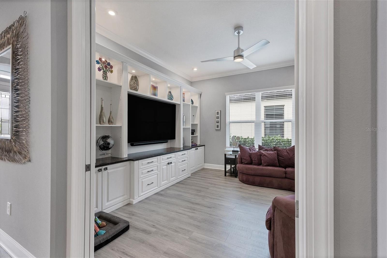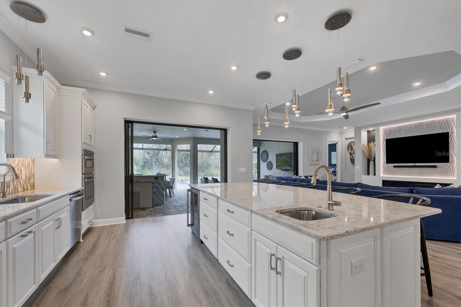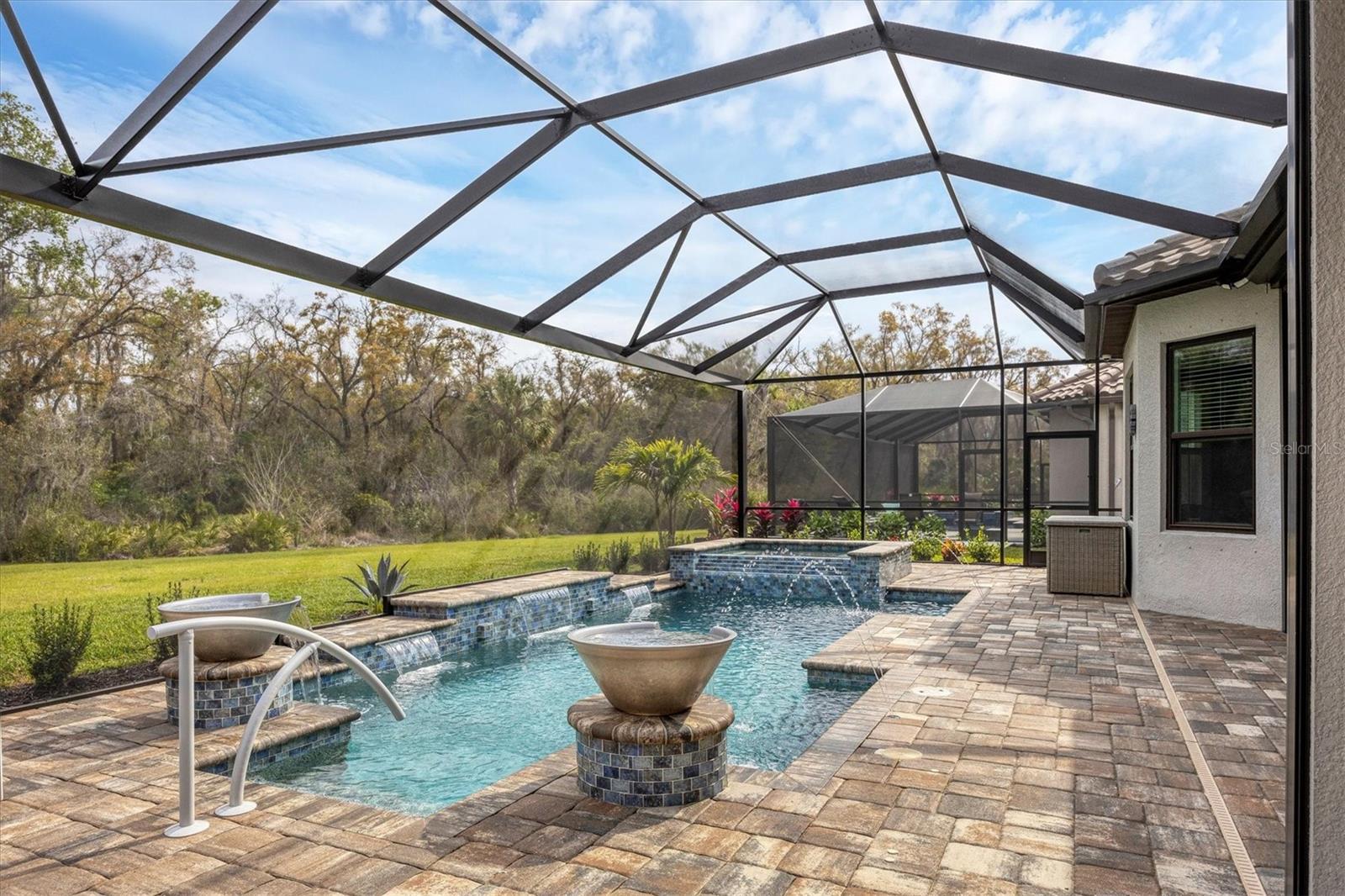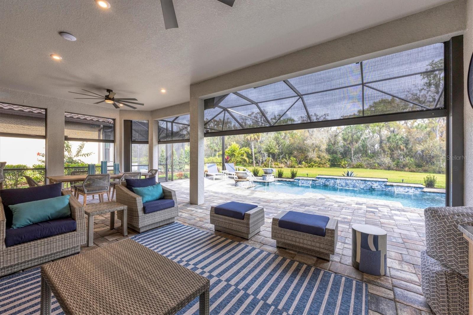 Welcome to luxury living in Esplanade at Azario. This Palazzio floorplan is a three-bedroom, three-bath residence with 3,022 square feet of living space and is filled with exquisite features and upgrades. The open and expansive living room is a showstopper with a built-in media center with lights and fireplace, seamlessly blending with the kitchen and dining room. The kitchen is a chef's dream with stainless steel GE profile appliances, an oversized center island with beverage cooler and prep sink, cabinets with pullouts, a large pantry, a custom tile backsplash and a vent hood. The den is a retreat with pocketing double doors, a built-in media center, drawers, shelves and a granite countertop. For those who appreciate indoor-outdoor living, step outside to the lanai and enjoy the outdoor kitchen with grill, vent hood, beverage cooler, bar-height seating, and a granite countertop with a waterfall edge that extends as a backsplash. Relax in the pool and spa with water bowls and waterfalls as you take in the scenic view through the extended panoramic lanai screen. The primary bedroom boasts a tray ceiling, crown molding, bay windows and an accent wall. The spa-like bath is luxurious with a double vanity, water closet, expansive shower and linen closet. The primary suite’s closet is custom-designed and well organized for maximum function and practicality. The guest suites feature custom-organized closets and en-suite baths offering a tub and shower with glass doors and a vanity with quartz countertop and storage. Additional upgrades include a whole-house water softener, lighting and fan upgrades throughout, garage storage cabinets with countertop and slatwall, upgraded landscaping with lighting, an extended driveway, a tankless water heater with recirculation pump, an alarm system, gutters with buried downspouts, whole-house generator, a combination of hurricane-impact windows and storm shutters, a home automation system and more. Esplanade at Azario spoils residents with an impressive array of resort-style amenities, including an 18-hole championship golf course, a pro shop, PGA golf professional lessons, a zero-entry heated pool and spa, a poolside Bahama tiki bar, a full-service spa, a state-of-the-art fitness center, six tennis courts, 16 pickleball courts and bocce court. Additionally, the culinary center with a teaching kitchen promises culinary delights and social gatherings. Seize the opportunity to call this exquisite residence your own, while enjoying the convenience of being just a short distance from all Lakewood Ranch and downtown Sarasota have to offer. Live every day as if you are on vacation, it's a lifestyle worth embracing!