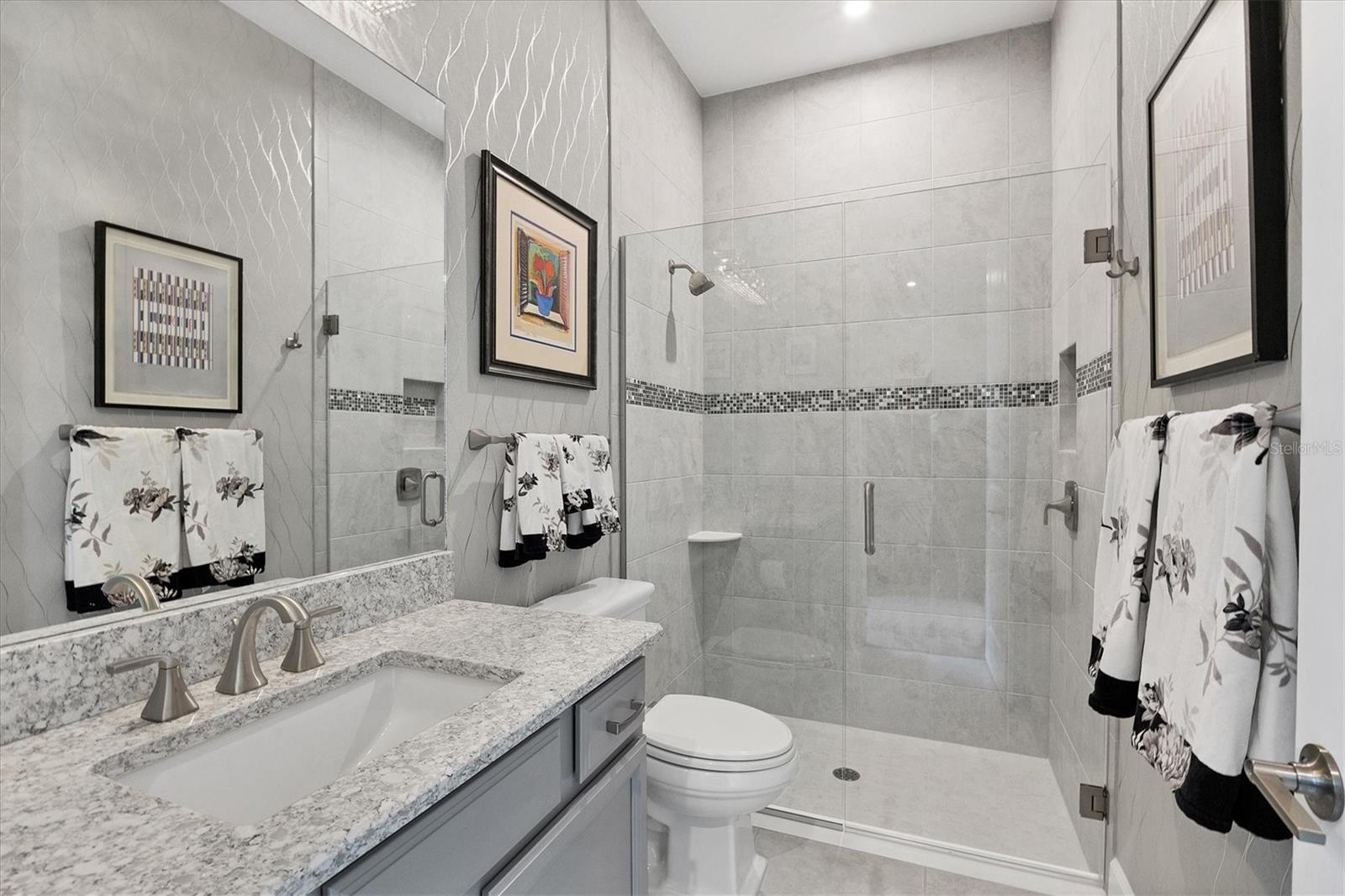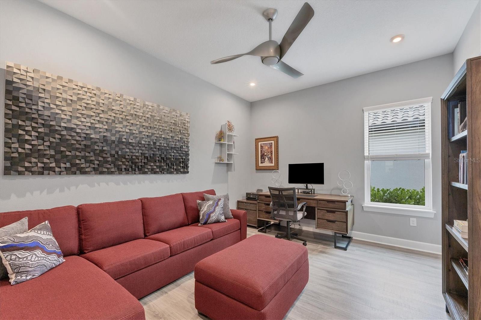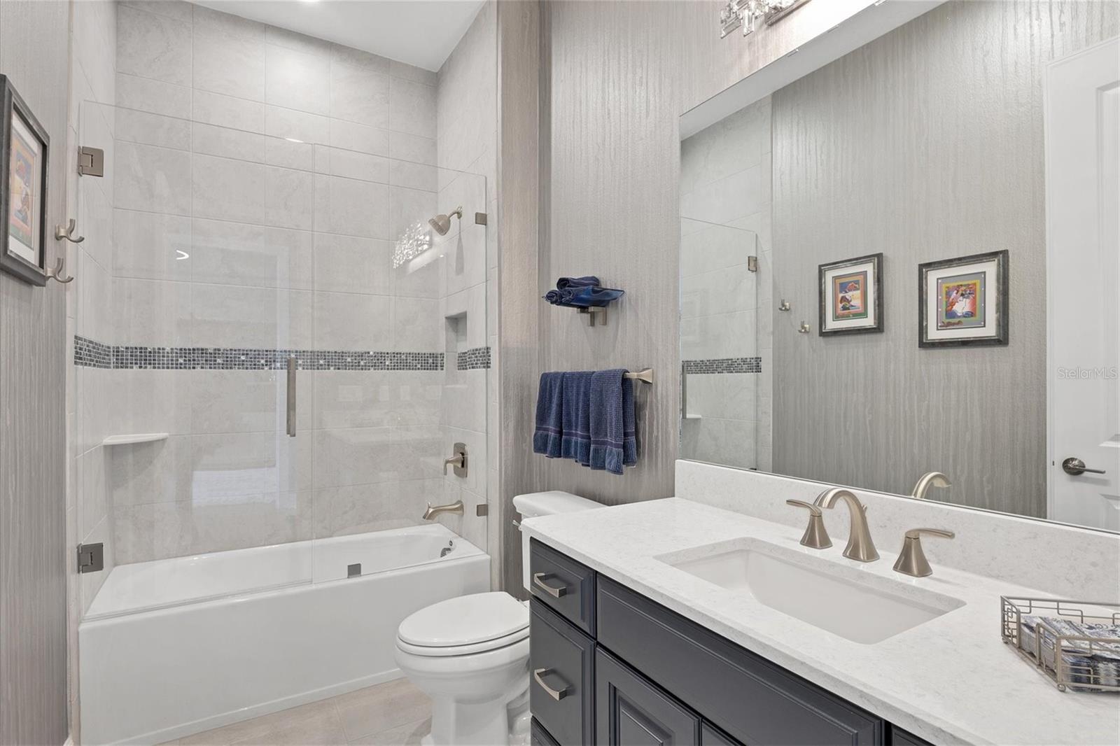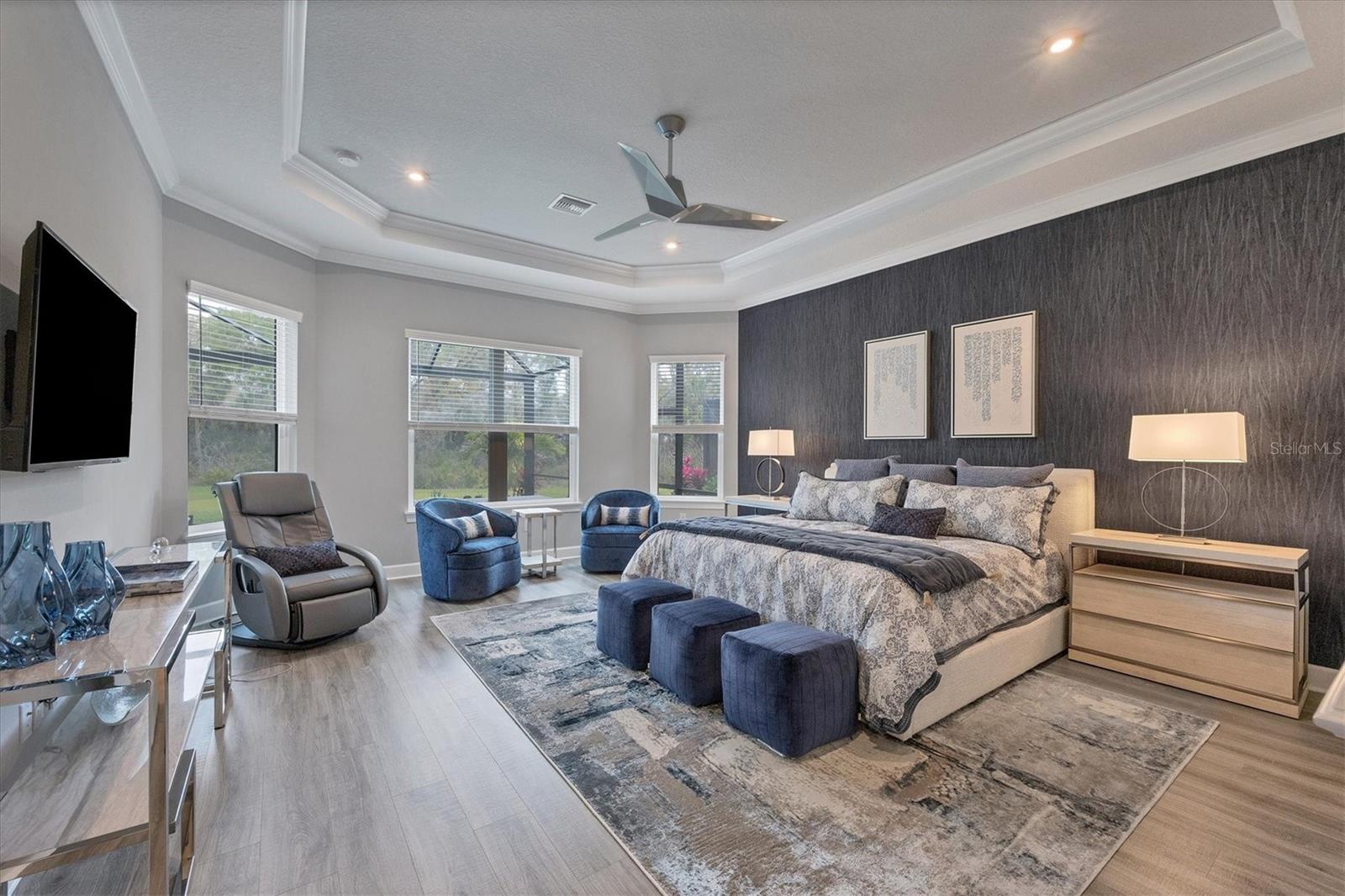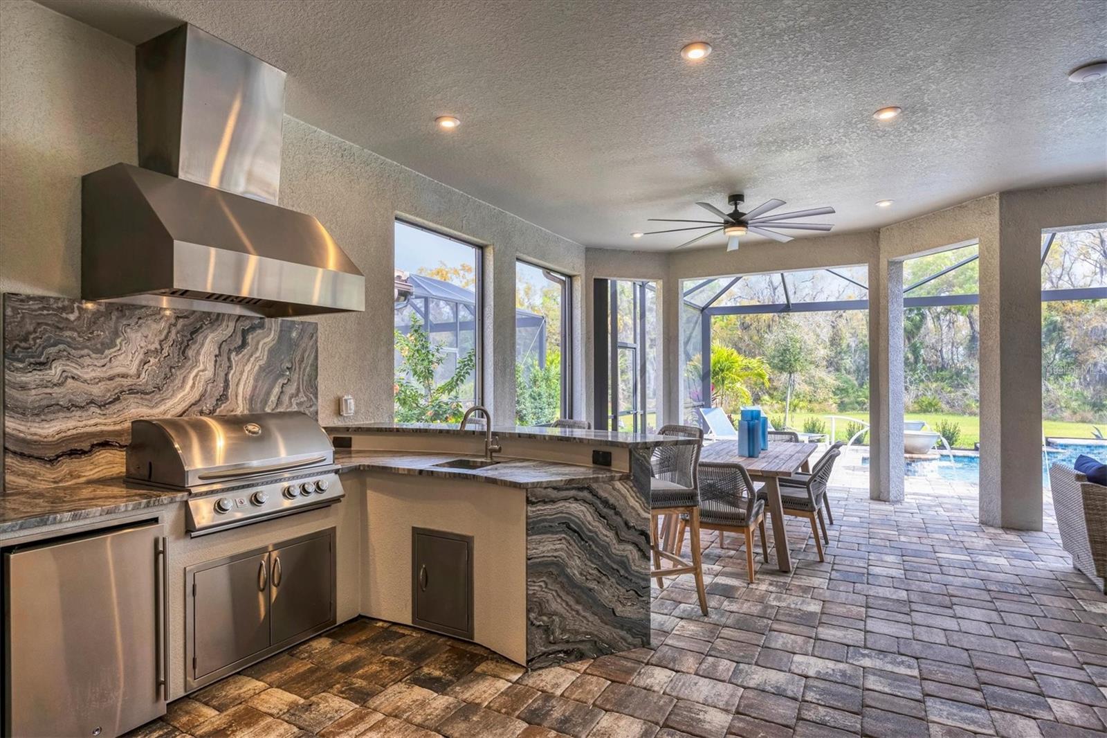 Welcome to luxury living in Esplanade at Azario. This Palazzio floorplan is a three-bedroom, three-bath residence with 3,022 square feet of living space and is filled with exquisite features and upgrades. The open and expansive living room is a showstopper with a built-in media center with lights and fireplace, seamlessly blending with the kitchen and dining room. The kitchen is a chef's dream with stainless steel GE profile appliances, an oversized center island with beverage cooler and prep sink, cabinets with pullouts, a large pantry, a custom tile backsplash and a vent hood. The den is a retreat with pocketing double doors, a built-in media center, drawers, shelves and a granite countertop. For those who appreciate indoor-outdoor living, step outside to the lanai and enjoy the outdoor kitchen with grill, vent hood, beverage cooler, bar-height seating, and a granite countertop with a waterfall edge that extends as a backsplash. Relax in the pool and spa with water bowls and waterfalls as you take in the scenic view through the extended panoramic lanai screen. The primary bedroom boasts a tray ceiling, crown molding, bay windows and an accent wall. The spa-like bath is luxurious with a double vanity, water closet, expansive shower and linen closet. The primary suite’s closet is custom-designed and well organized for maximum function and practicality. The guest suites feature custom-organized closets and en-suite baths offering a tub and shower with glass doors and a vanity with quartz countertop and storage. Additional upgrades include a whole-house water softener, lighting and fan upgrades throughout, garage storage cabinets with countertop and slatwall, upgraded landscaping with lighting, an extended driveway, a tankless water heater with recirculation pump, an alarm system, gutters with buried downspouts, whole-house generator, a combination of hurricane-impact windows and storm shutters, a home automation system and more. Esplanade at Azario spoils residents with an impressive array of resort-style amenities, including an 18-hole championship golf course, a pro shop, PGA golf professional lessons, a zero-entry heated pool and spa, a poolside Bahama tiki bar, a full-service spa, a state-of-the-art fitness center, six tennis courts, 16 pickleball courts and bocce court. Additionally, the culinary center with a teaching kitchen promises culinary delights and social gatherings. Seize the opportunity to call this exquisite residence your own, while enjoying the convenience of being just a short distance from all Lakewood Ranch and downtown Sarasota have to offer. Live every day as if you are on vacation, it's a lifestyle worth embracing!