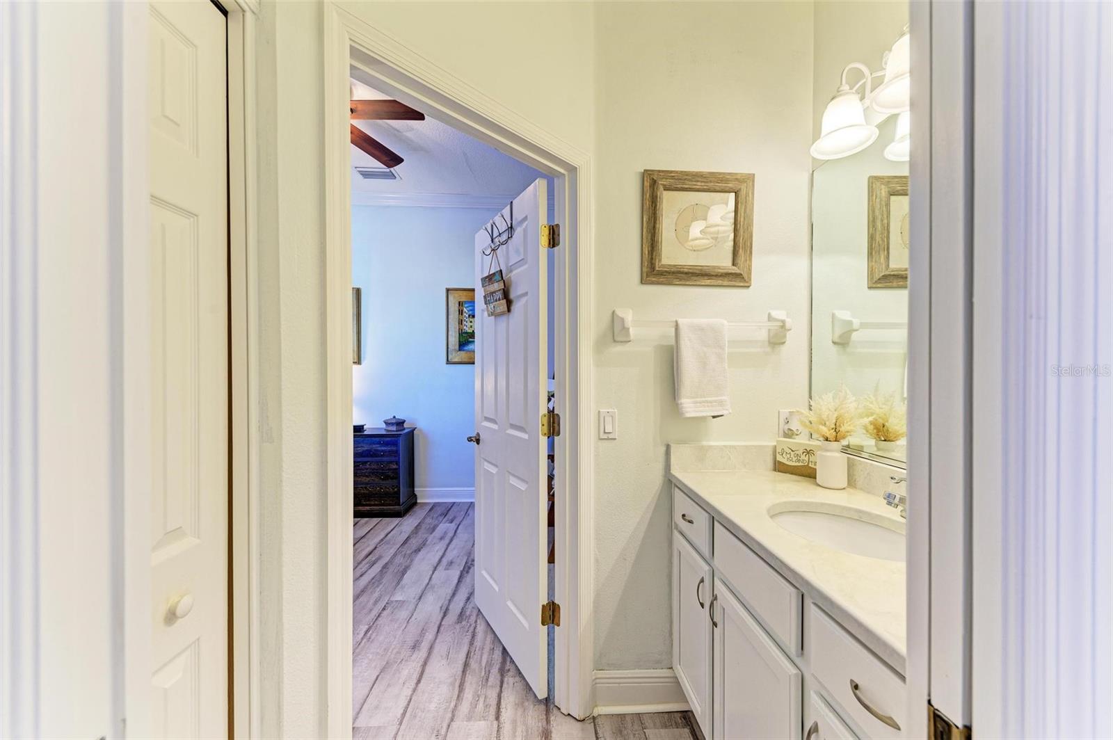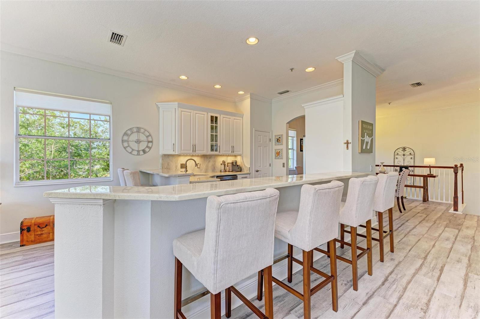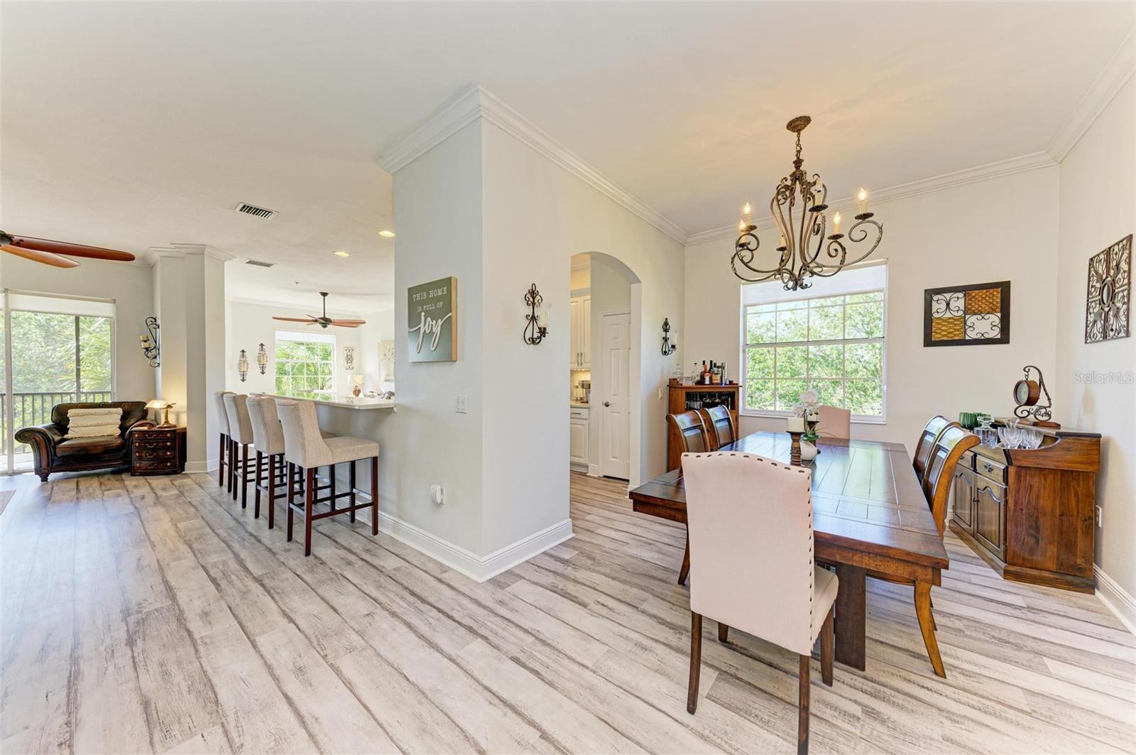 Recently UPDATED w/ Luxury Vinyl Flooring THROUGHOUT !!!! Live in the heart of Lakewood Ranch in this beautiful 2nd-floor, end-unit condominium with amazing views! This 3 bedroom, 2 bathroom, 2 car garage condo also features a living room, gathering room in the kitchen, and a den for multiple places to relax or entertain. Access the large screened balcony/patio from the living room, gathering room, and PRIMARY bedroom with inviting views and soothing sounds of the lake and fountain. The kitchen opens to the dining room and gathering room and features WHITE cabinets, granite counters w/ an epoxy overlay , TWO breakfast bars, and a pantry. The den is a great place for a private retreat or a home office. The Primary bedroom has 2 walk-in closets and an en suite bathroom with dual sinks, a soaking tub, and a walk-in shower. The 2 spacious guest bedrooms are situated in the front of the home with convenient access to the Jack & Jill bathroom with 2 separate vanities and shares access to the den. The home also features a laundry room, ceiling fans throughout and CROWN MOLDING .LARGE DRIVEWAY can accomodate 4 cars PLUS attached 2 Car Garage Miramar is a gated community with great amenities including a clubhouse, a large heated swimming pool, a spa, a well-equipped fitness center, and miles of walking trails. Enjoy all Lakewood Ranch has to offer with LWR Main Street, I-75, University Town Center Mall, and endless recreational and entertainment opportunities close