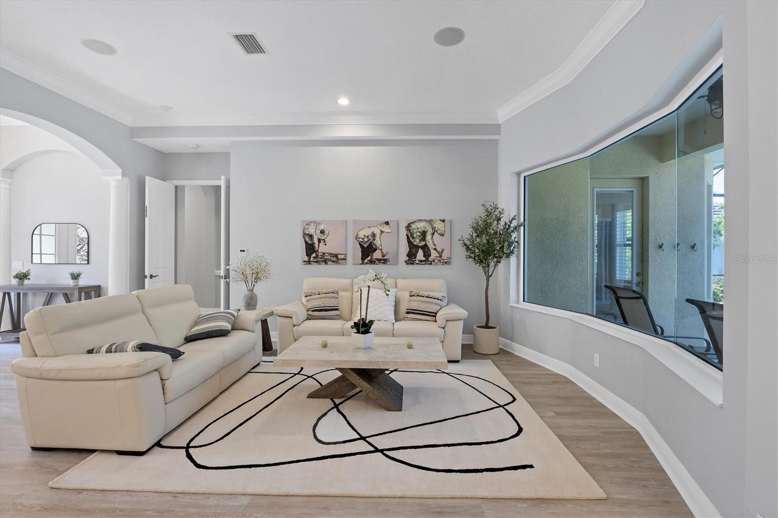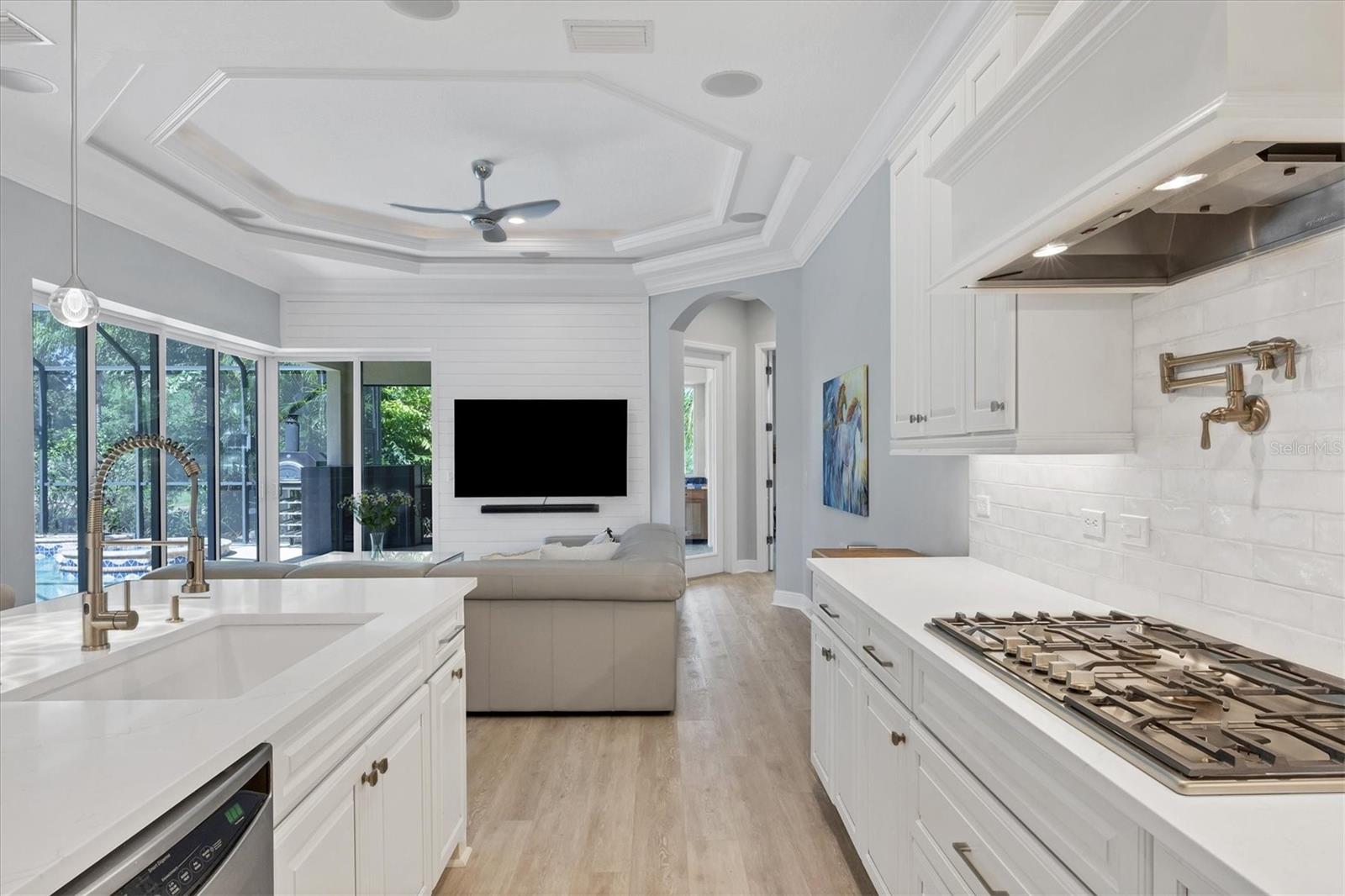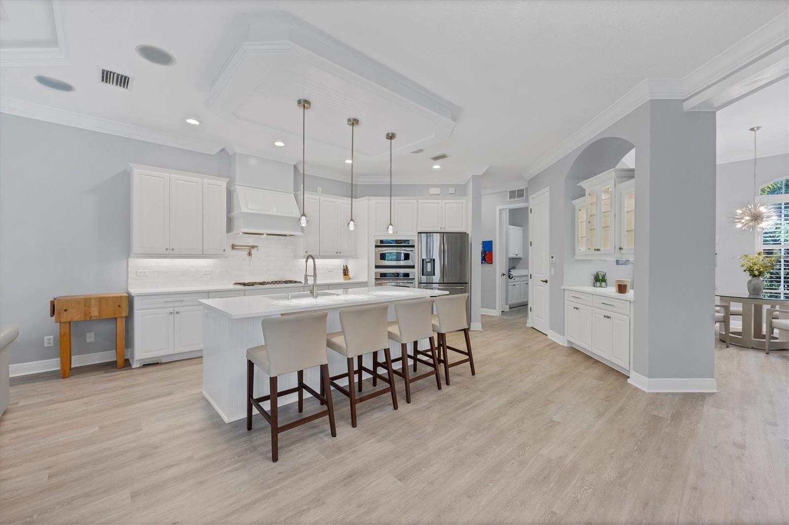 Welcome to 14721 Bowfin Terrace, a beautifully updated Lee Wetherington home in Greenbrook Preserve in Lakewood Ranch. An expansive paver driveway and new landscaping welcome you into the home. Once inside, the open floor plan plan seamlessly brings together the generous living spaces making it perfect for both relaxing and entertaining. Stunning new luxury vinyl plank flooring throughout creates a cohesive palate and draws you towards the expansive pool and lanai area with lake views beyond. Whether you are a chef or aspire to be, the kitchen is as aesthetically captivating as it is functional. Custom cabinetry, quartz countertops, luxury appliances including a gas cooktop with a pot filler, large pantry and convenient bar seating with new lighting are a few of the features. Separate living room and family room spaces as well as casual and formal dining spaces are defined but open to each other creating a casual comfortable feel. The primary suite is an oasis offering a large walk-in closet and bath with free standing tub, large glass enclosed shower and separate vanities. There are two additional bedrooms as well as a bonus room with slider access to the covered outdoor space. Lee Wetherington homes are known for their spectacular outdoor spaces and this home delivers. Enjoy the sparkling pool and spa as well as the significant covered outdoor space complete with a fireplace and summer kitchen. Seeing is believing – the features and updates are numerous and include crown molding, custom ceiling features and built-ins, quartz countertops, new paint, plumbing fixtures, light fixtures and much more. A three-car garage and lush landscaping complete the package. Enjoy Greenbrook Village's two community parks with pavilions, basketball, volleyball, soccer, playgrounds, a dog park and an extensive trail system. All this and close to great schools, shopping, dining and all that living in Lakewood Ranch has to offer.