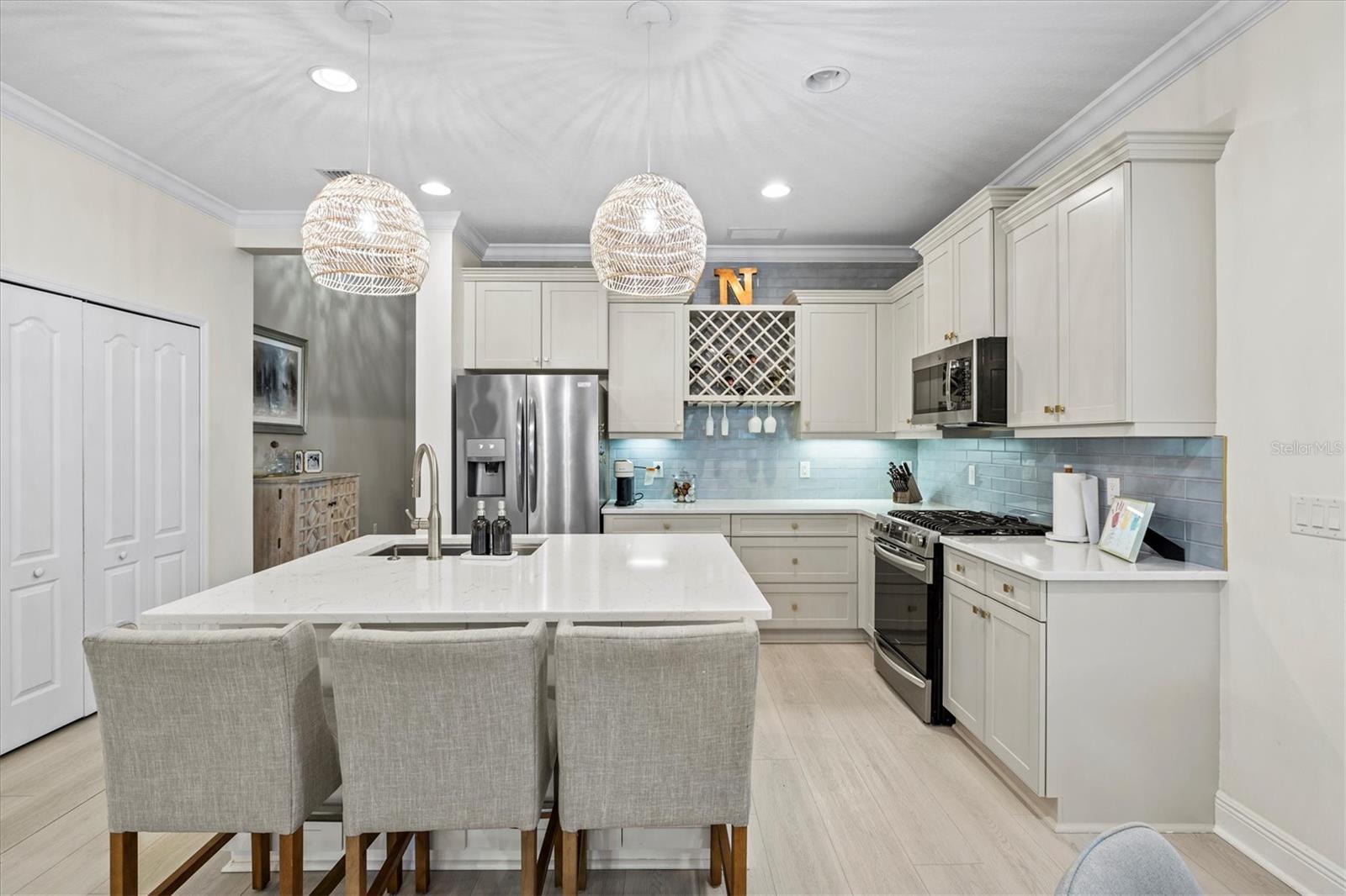 Discover the epitome of luxury living in this beautifully renovated pool home, nestled within the gated community of Central Park in the highly sought-after Lakewood Ranch. This stately two-story home captivates with its lush landscaping and charming front porch, setting a warm and inviting tone as you arrive. Upon entering, you are welcomed by a grand two-story foyer that opens up to over 2,500 square feet of versatile living space, featuring 5 bedrooms, a den, a loft, and 2.5 bathrooms. Fresh paint complements the luxury vinyl plank flooring and crown molding throughout the first floor. Off the foyer, the den, can easily serve as an additional bedroom or office, providing versatility for all. The gourmet kitchen, overlooking the living room, is a chef’s dream, boasting newly refaced cabinets (2024), quartz countertops with a spacious kitchen island, a custom-made wine rack, stainless steel appliances, and a large undermount sink. The first floor also includes a half bathroom, perfect for guests. Double doors lead to the exquisite first-floor owner's suite, which features a beautiful tray ceiling highlighted by recessed lighting. The ensuite bathroom offers dual sinks, a glass-enclosed walk-in shower, and a generous walk-in closet. Upstairs, a versatile loft area awaits, along with four spacious bedrooms and a full bathroom with dual sinks. Step outside into your personal backyard oasis, complete with a screened-in lanai, a built-in grill for summer BBQs, and a heated saltwater pool (with a new pool heater installed in 2024) featuring a tanning ledge. Enjoy the privacy of your beautifully landscaped and fenced yard, perfect for relaxing or entertaining. Residents of Central Park at Lakewood Ranch enjoy access to a pavilion surrounded by expansive public spaces, including a splash park, two dog parks, and facilities for football, tennis, and baseball. Zoned for top-rated schools and centrally located just minutes from shopping, dining, and the amenities of UTC, this home also offers easy access to the area's best beaches and a convenient commute to Sarasota International Airport. Don’t miss this opportunity to experience luxury living at its finest—schedule your showing today!