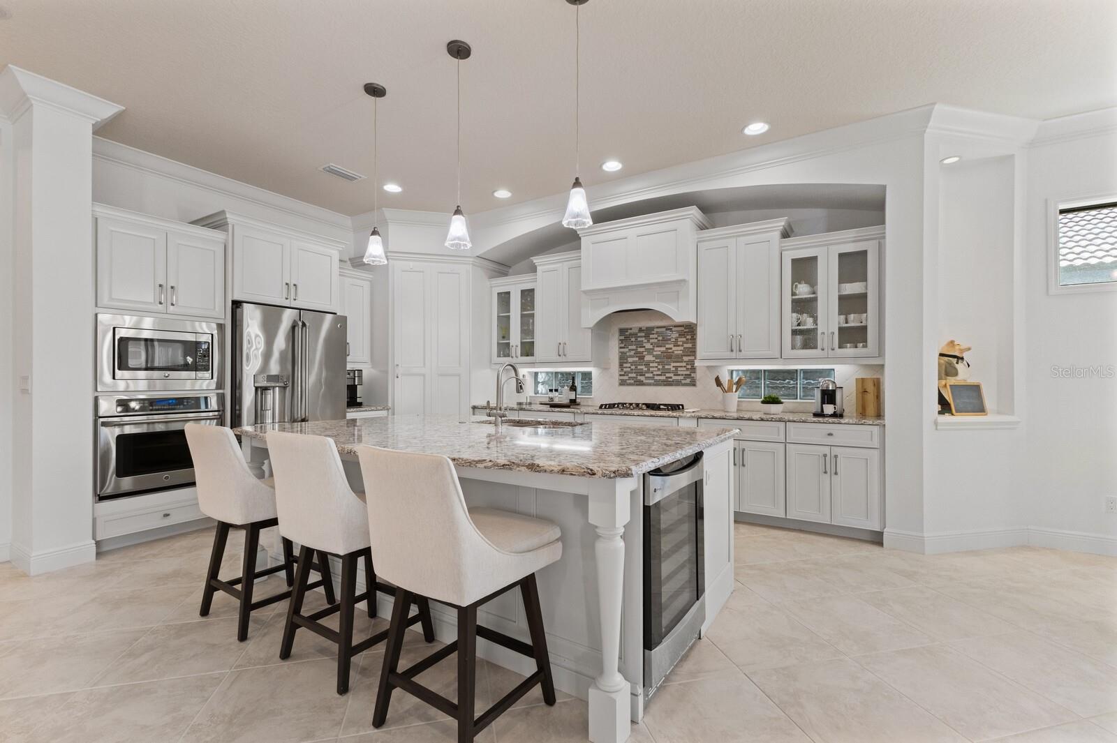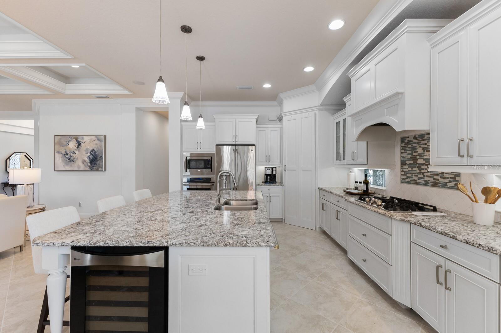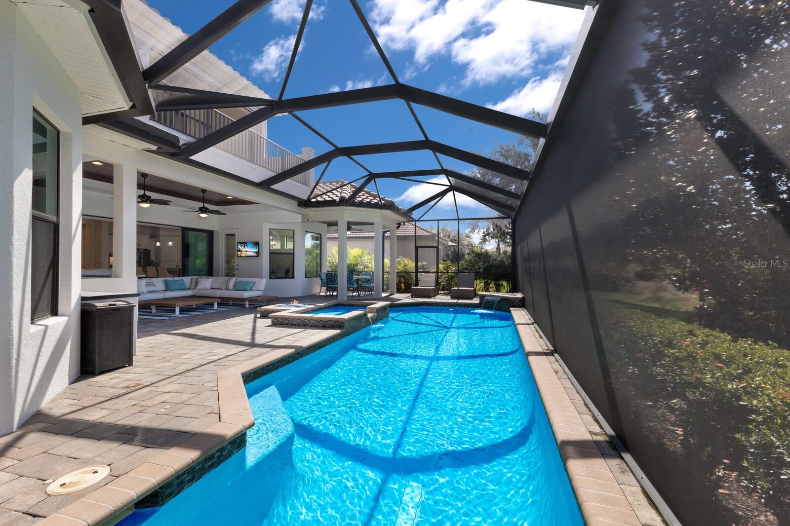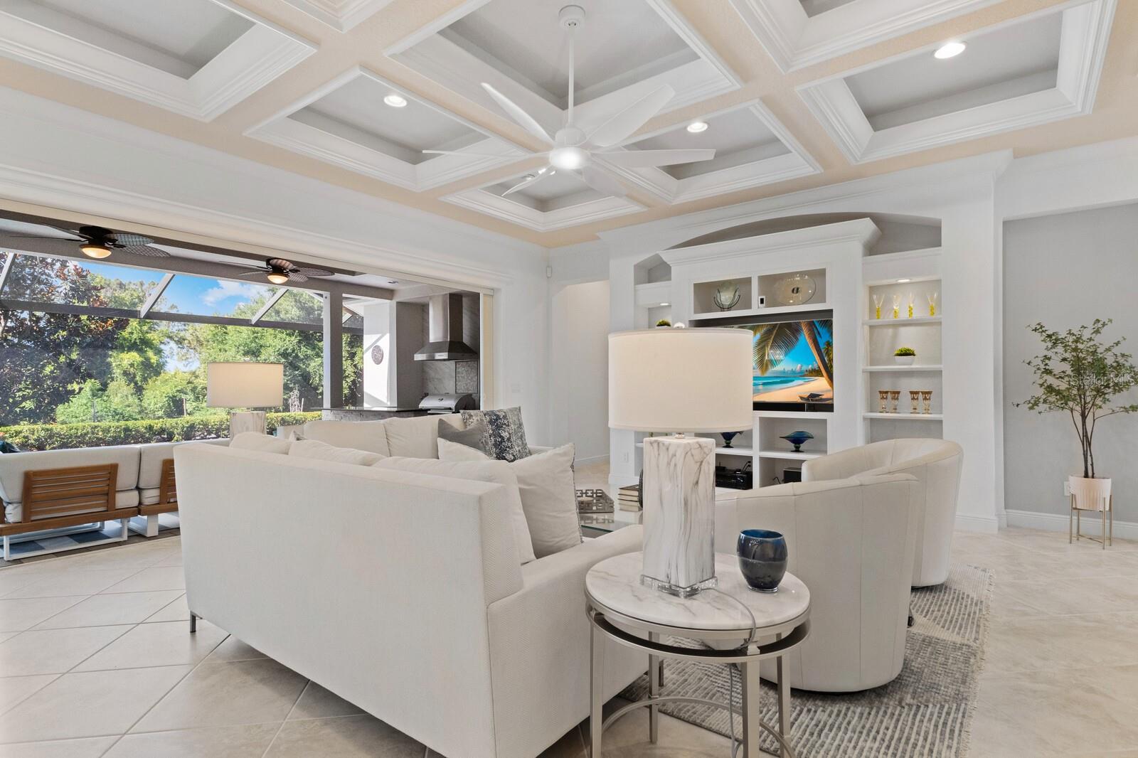 Move-in ready, this gorgeous Lee Wetherington home has been updated and freshly painted inside and out. This home seamlessly blends indoor with outdoor living. Upon entering, you’re immediately drawn to the tranquility and privacy of the natural preserve and lanai through the expansive wall of glass. Step outside to your private oasis, complete with salt-water heated pool/spa and waterfall, outdoor kitchen with new decorative tile, half bath, and a generous covered entertainment area with charming wood accent ceiling, fire-pit and newly installed outside speakers – perfect for year-round enjoyment. The open concept living, dining and kitchen areas exude elegance and sophistication with architectural details including high coffered ceilings and crown molding throughout. The heart of the home is the kitchen featuring a walk-in pantry, large island, stainless steel appliances, wine refrigerator, quartz countertops, and soft-close solid wood cabinets. The main floor has three bedrooms, 3 full baths, half-bath, den/office and updated laundry room. Indulge in the luxurious owner’s suite with tray ceilings, glass shower, jacuzzi, make-up vanity, dual sinks and dual closets. Built for entertainment, the spacious second floor has high coffered ceilings, sliding glass doors, sink, bar refrigerator and full bath. Enjoy your favorite movies/sports with friends/family or relax on the balcony and take in the lovely view of the preserve and/or romantic sunsets. This floor could also function as a mother-in-law/guest suite. Additional features of this exceptional home include impact glass windows, whole house generator, landscape lighting, LED pool cage lanai lights and climate control storage. Recent upgrades include new hurricane-rated garage doors, newly installed outside lanterns, ceiling fans, and carpeting in bedrooms and 2nd floor. The landscaping has been enhanced with lush Areca Palms providing both beauty and privacy. Country Club East offers residents the ultimate in gated community living, with amenities such as three community pools, fitness center, and community clubhouse. This fantastic location is close to everything including world-class shopping, beaches, dining, medical facilities and airports.