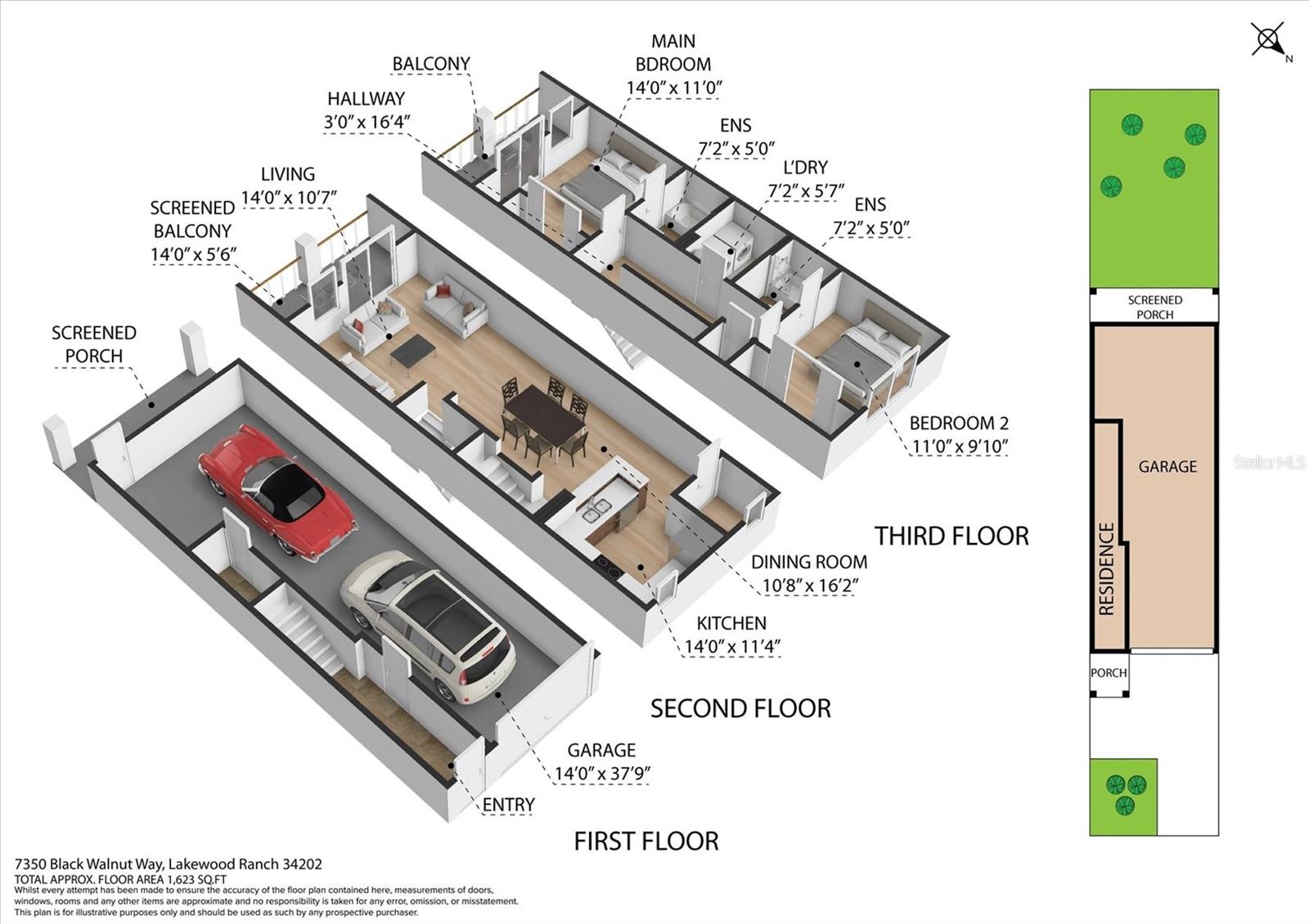 One or more photo(s) has been virtually staged. Now offering the one of the more affordable option in Willowbrook, one of Lakewood Ranch's picturesque gated communities. This serene neighborhood consists of 51 low-rise condominium buildings, housing a total of 270 units spread across over 100 acres, featuring multiple ponds and more than 50 acres dedicated to preserves. Built between 2007 and 2009, this community offers a blend of natural beauty and modern living. Presenting Unit #7350, a newly renovated condo constructed in 2007, this unit spans three floors, offering a spacious and versatile floor plan that includes 2 bedrooms, 2 full bathrooms, and a convenient half bath adjacent to the kitchen. A welcoming entry area allows the homeowner to enter the attached tandem garage from this space. Further on, a newly carpeted staircase leads to the living room. The spacious 2-car tandem garage provides ample storage and a screened-in lanai. The second floor open-concept design seamlessly combines the living room, dining area, and kitchen, creating a perfect space for entertaining and daily living. This floor also has a well-placed half bath for guests’ convenience. You'll also find another screened-in lanai with sliding doors, offering an ideal spot for morning coffee or evening relaxation. Continuing to the 3rd floor you'll find both the primary suite with ample closet space and a private en-suite bathroom and the comfortable guest bedroom with its own en-suite bathroom, ensuring privacy and comfort for visitors. This floor also has a conveniently located laundry room, making household chores a breeze. Significant upgrades have been made as of recently, ensuring it is move-in ready and offers modern comforts: 2017: New AC System Installed (Condenser and Air Handler), 2021: New Washer and Dryer, April 2023 Refurbishments: Fresh paint throughout; including ceilings, walls, trim, doors, and garage, New flooring with carpet and luxury vinyl planking (LVP), New kitchen appliances: fridge/freezer, oven, microwave, dishwasher, Regrouted tiles above bathtubs, New toilet seats and internal mechanisms, New lights and ceiling fans, New baseboard and door trim, Garage door serviced with new door springs, adjusted hinges, and lubrication. Total expenditure for these upgrades was over $20,000, ensuring that this property offers exceptional value and contemporary style. Community Amenities include a sparkling community pool for residents to enjoy, hassle-free living with comprehensive ground and exterior maintenance services. Located just 2.2 miles from Main Street at Lakewood Ranch, offering numerous entertainment and dining options. 3 miles from University Town Center, featuring a variety of shopping and dining establishments. Only 15 miles from Lido Beach, a beloved local attraction known for its beautiful sands and clear waters. Experience living at Willowbrook and don't miss the opportunity to make this condo your new home in Lakewood Ranch!