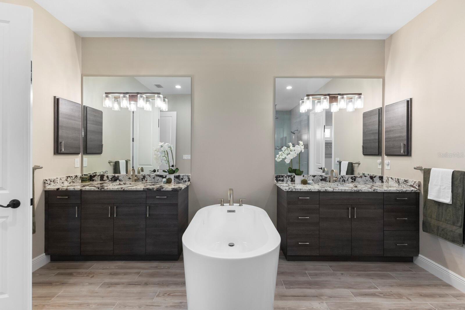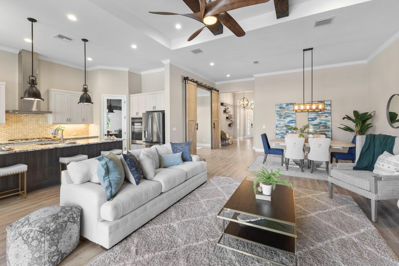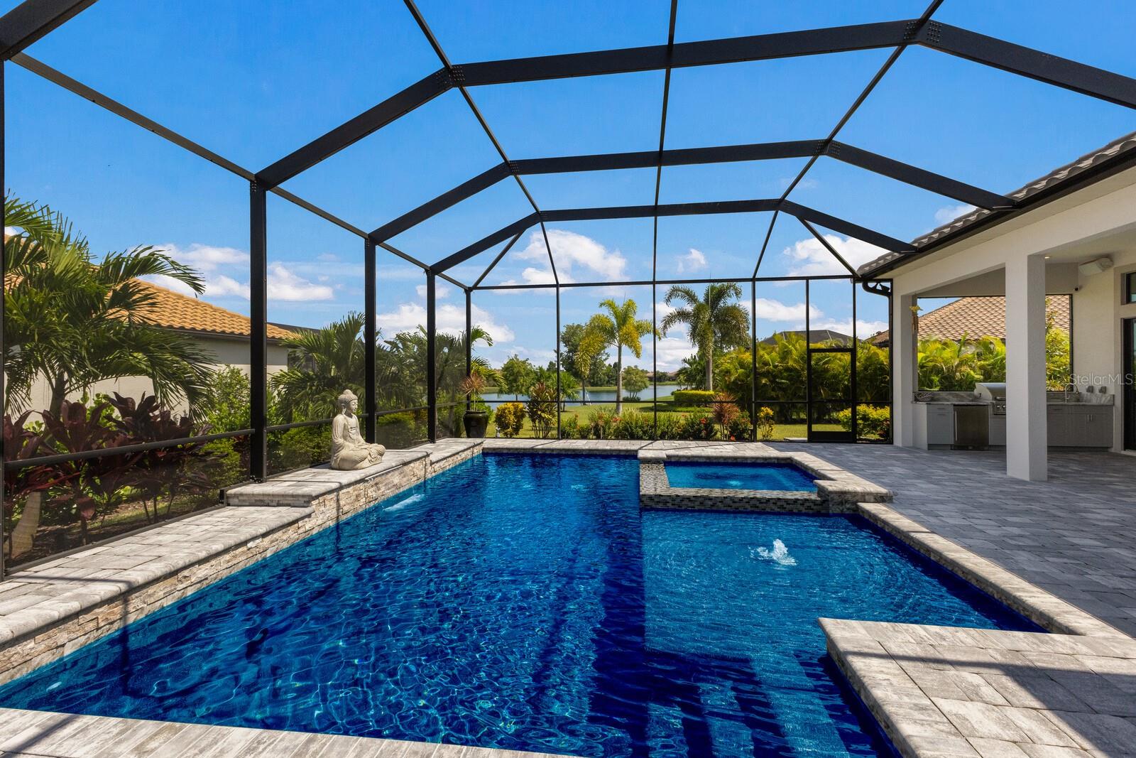 Welcome to this meticulously maintained 2022 custom-built 4bed 3.5bath home in the highly sought-after Prestbury neighborhood of Country Club East. This thoughtfully designed residence offers tall ceilings throughout and offers seamless indoor and outdoor living. As you enter, you'll be captivated by the grand great room and kitchen featuring a harmonious blend of a wood-beamed tray ceiling, abundant windows, double-set of sliders with transom windows, and ample, beautiful natural light. The chefs kitchen boasts stainless steel appliances, a gas cooktop, a walk-in pantry, quartz countertops, beautiful backsplash, and an impressive 8-foot island. The spacious master bedroom includes tall ceilings, a secondary office space, a gigantic/expanded walk-in closet, and a luxurious spa-like bathroom. A private den with plantation shutters and tile flooring makes working from home a pleasure. Additional highlights include a gorgeous custom pool/spa, an outdoor kitchen, and an expanded two-and-a-half-car garage offers ample space for vehicles and extra storage. Country Club East provides top-notch amenities such as a community fitness center, walking trails, community pools, gated entrances, and the Retreat clubhouse. Optional membership to Lakewood Ranch Country Club grants access to three (3) 18-hole championship golf courses, tennis, pickleball, two clubhouses for dining, a state-of-the-art fitness center, and more. Lakewood Ranch is a premier master-planned community known for its proximity to award-winning shopping, dining, A-rated schools, parks, and world-famous nearby beaches.