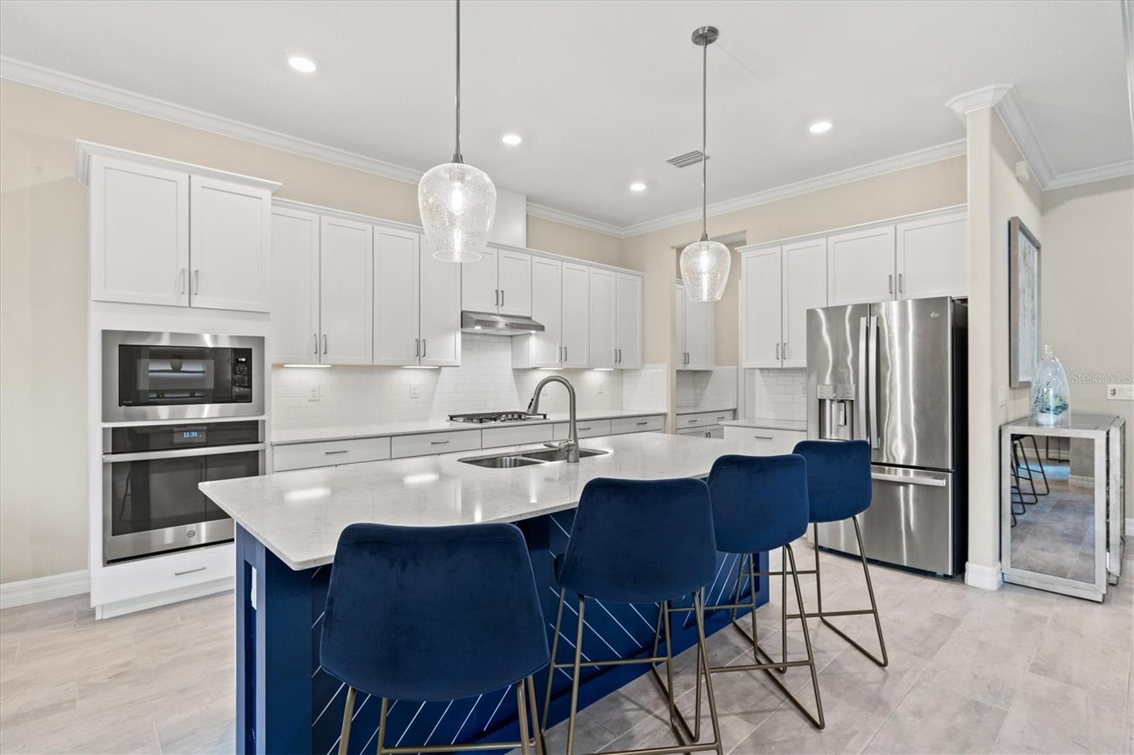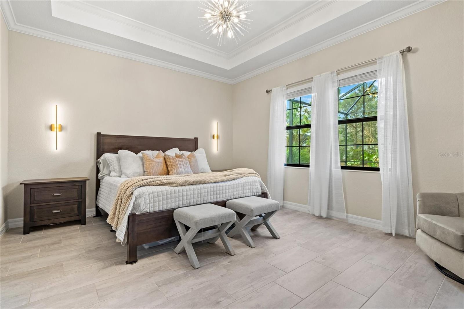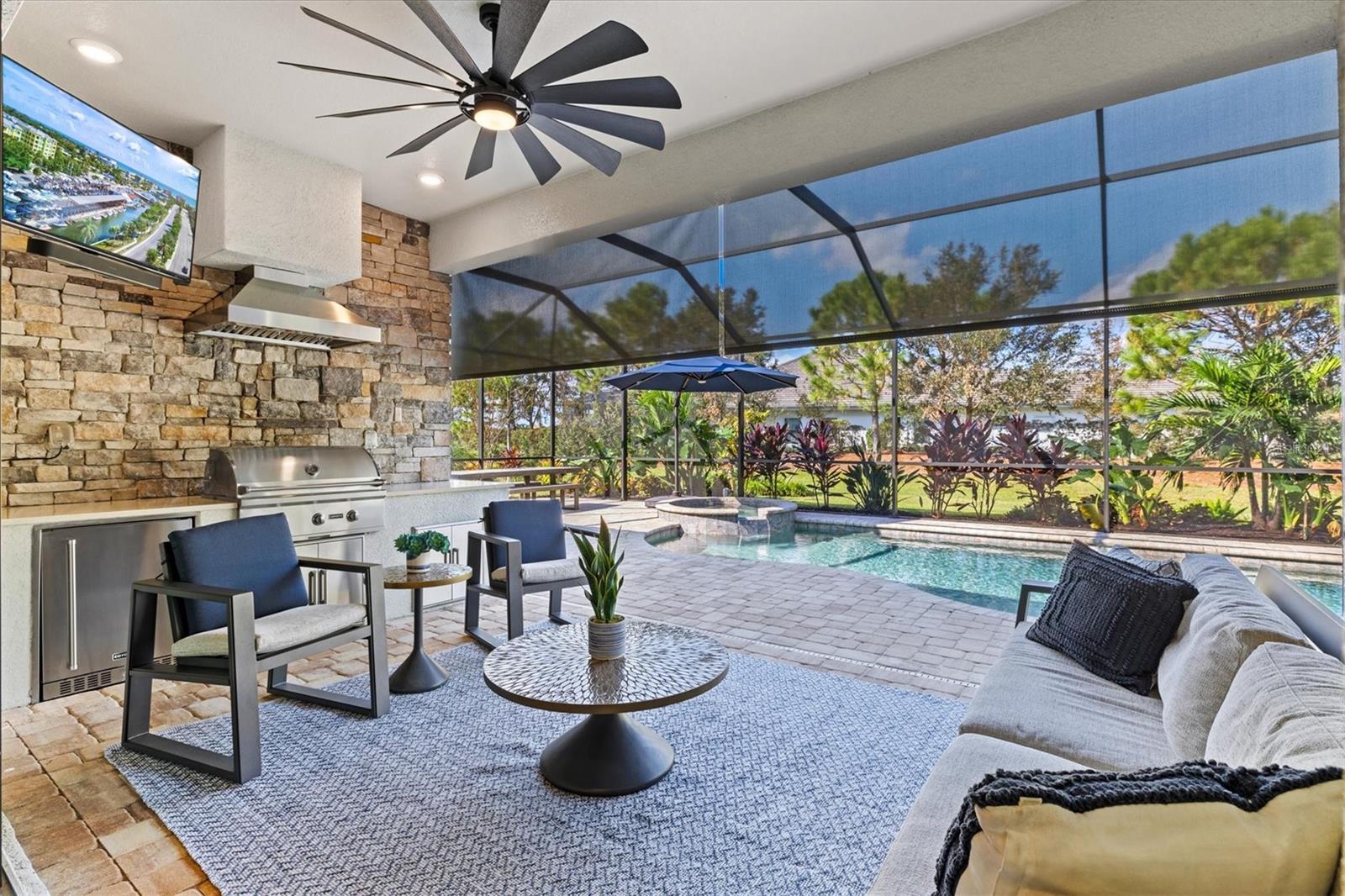 Introducing a stunning luxury residence located in the exclusive Country Club East at Lakewood Ranch. This exquisite home is designed with high-end finishes and unparalleled attention to detail and even includes partial water views! From the moment you enter, you'll be captivated by the elegant craftsmanship, soaring ceilings, custom millwork, and designer lighting. The gourmet kitchen is a chef's dream, equipped with top-of-the-line appliances, sleek cabinetry, and an expansive island, perfect for entertaining. There is plenty of storage with a fully built-out butler's pantry. The family room offers luxury and tranquility with a beautiful custom entertainment system equipped with lighting, and a tray and coffered ceiling. The spacious living areas flow seamlessly to the outdoors, where you'll find a private oasis complete with upgraded landscaping, a sparkling pool, relaxing spa, and an outdoor kitchen for al fresco dining. The motorized lanai shades enhance the outdoor space, allowing you the convenience of controlling the outdoor environment with the touch of a button. The home office blends elegance and functionality with glass French doors. This thoughtful design is perfect for remote work, creative projects, or managing day-to-day tasks in comfort. Each bedroom features custom closets, offering ample storage and organization, while the hurricane-impact windows provide peace of mind and energy efficiency. The air-conditioned garage provides a comfortable space for your vehicles, a home gym, and any additional storage needs. Additional upgrades include LED recessed lighting in all rooms, a water softener, electrical and gas connections for a portable whole home generator, and a whole home Wi-Fi network. This home truly stands out with its luxury upgrades and exceptional design, providing a lifestyle of comfort and sophistication in a serene golf community setting. Residents of Country Club East enjoy exclusive access to The Retreat, a resident-only amenity center featuring a resort style pool, splash pad, fitness center, social gathering room, and an outdoor kitchen. The community offers two additional pools and numerous walking trails. Optional membership to the award-winning Lakewood Ranch Golf and Country Club provides access to four championship golf courses, three clubhouses, fitness and aquatics centers, tennis and pickleball courts, and bocce ball. Prime location just minutes to Lakewood Ranch Main Street, Lakewood Ranch Hospital, University Town Center, Waterside, and all the area's most popular shopping, dining, and schools. Only 20 minutes to Sarasota International Airport and 20 miles to the beach. Don't miss your chance to make this dream home yours!