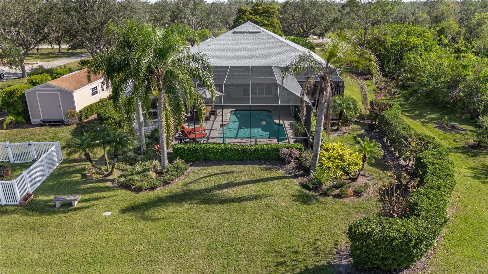 Discover the perfect blend of comfort and outdoor living in this stunning 2,319 SqFt home, offering 4 bedrooms, an office with a closet, and 3 bathrooms. Set on a private and spacious 1.02-acre lot, the home backs to preserve on the left and behind, providing rare privacy, peaceful views, and plenty of room for outdoor activities. The expansive lot and thoughtful layout make this home ideal for any lifestyle—whether you're seeking quiet relaxation, entertaining, or space to grow. Plus, enjoy additional savings with no CDD fees. The outdoor area is an entertainer’s dream, featuring a summer kitchen with granite countertops, an oversized Kamado grill, and a remote-controlled roof for all-weather enjoyment. A retractable awning provides shade over the lanai, while the resurfaced pool and waterfall offers a serene retreat within the screened-in paver deck. A 12x24 powered shed offers versatility for a man cave, office, playhouse, or extra storage. Inside, the open-concept layout is designed for seamless indoor/outdoor living, with soaring 12-foot ceilings in the great room enhancing the airy feel. At the heart of the home is a chef’s kitchen with high-end appliances, reverse osmosis system, over 12 feet of granite counters with seating for six, lighted upper cabinets, and a spacious pantry with tall pullout shelves—combining style and functionality. All bathrooms have been updated with modern finishes, including the luxurious master suite featuring a glass tile shower, floating double-sink vanity, large soaking tub, and rain showerhead. The owner’s suite also boasts two oversized, custom walk-in closets with built-in organization—offering storage that makes getting ready feel like a daily indulgence, along with a generous linen closet for added function. Custom plantation shutters accent the master bedroom, great room, kitchen, and dining room. The entire interior was freshly painted in 2024, and a brand-new roof was installed in November 2023. Additional highlights include an in-ground termite system, a 3-car garage, and whole-home entertainment wiring. Located in the highly sought-after Panther Ridge community, you’ll enjoy estate-style living with 15 miles of trails, parks, playgrounds, and sports courts—all just minutes from Lakewood Ranch shopping and dining. This home stands out for its unique mix of space, privacy, and versatility in a location that supports any lifestyle.