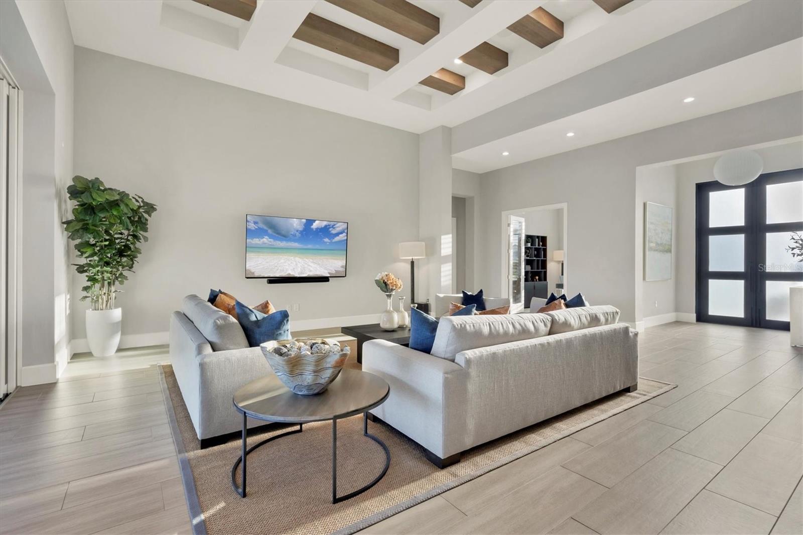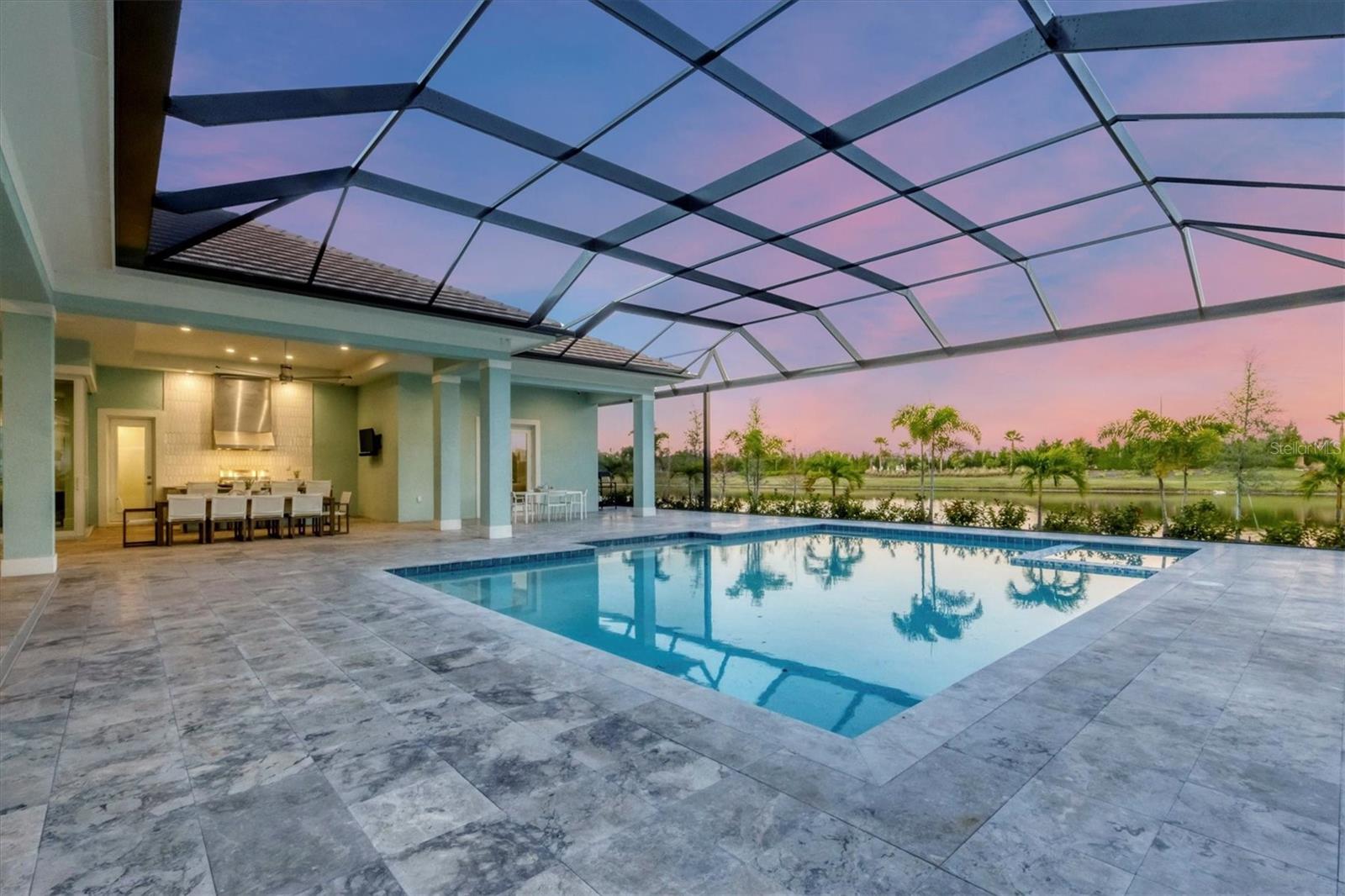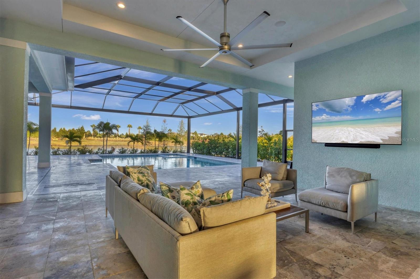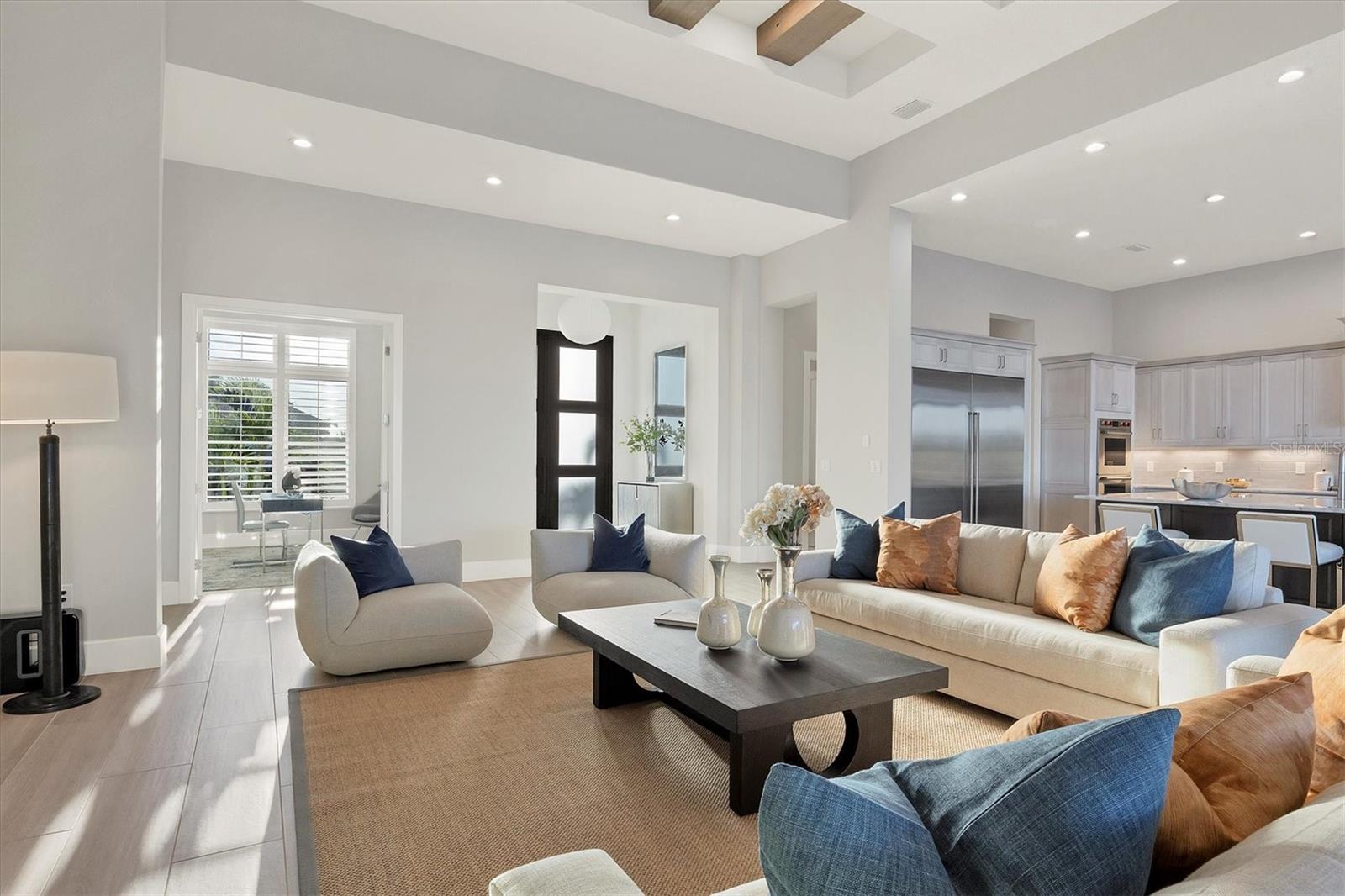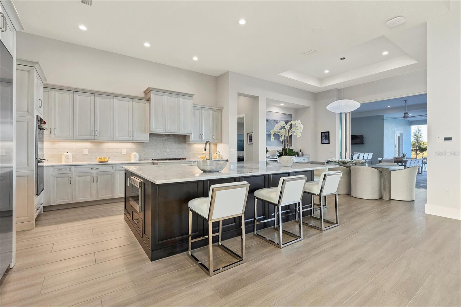 Indulge in the ultimate blend of luxury and contemporary comfort in this impeccably designed estate, nestled within the prestigious Lake Club of Lakewood Ranch. Spanning an impressive 4,193 square feet, this exceptional residence showcases extraordinary craftsmanship and the finest high-end finishes also offers an optional furniture package available for additional purchase making moving in effortless—simply bring your personal belongings and come home. With four generously sized bedrooms, three sumptuous guest suites—including a private entrance casita—five and a half luxurious baths, a versatile bonus room, and an elegant den, this home perfectly encapsulates the elite Florida lifestyle. Upon entering through the 10-foot iron door with impact glass, you are welcomed into a breathtaking foyer adorned with a soaring 14-foot ceiling and intricate detailing that sets the tone for the entire home. Inside, the property boasts beautiful Bella Legno porcelain plank flooring, soaring 12-foot ceilings throughout, and elevated 14-foot ceilings in select areas, lending an air of grandeur. The gourmet kitchen is a chef's dream, outfitted with top-tier Sub-Zero and Wolf appliances, a stunning quartzite island, a farmhouse sink, and dual pantries for ample storage. The adjacent dining area is equipped with a wine refrigerator and custom-built cabinetry, adding both functionality and sophistication. The expansive great room, highlighted by an exquisite feature ceiling, offers an ideal space for both relaxation and entertaining guests. The luxurious primary bedroom is a serene retreat, leading to a spa-inspired bath complete with a walk-in shower, designer tiles, custom closets, and a rejuvenating spa tub. The spacious bonus room, complete with a walk-in closet, provides the perfect venue for additional entertainment or a private haven. The three elegant guest suites, each with its own en-suite bath, promise ultimate comfort and privacy, while the casita, featuring its own entrance, wet bar, and bespoke finishes, offers an intimate escape. Step outside to the extraordinary outdoor living area, where you’ll find a vast lanai featuring travertine tile, a gas hookup for a fireplace, and panoramic screening to enhance your outdoor enjoyment. A brand-new stainless-steel pool cage, installed in 2024, surrounds the expansive saltwater pool and spa. The state-of-the-art outdoor kitchen includes a Wolf gas grill, refrigerator, dishwasher, ice maker, and a reverse osmosis water filtration system. Designed with cutting-edge technology for ultimate convenience, this home features hurricane-impact windows, an advanced security system with eight cameras, Wi-Fi extenders, in-ceiling speakers, and smart home capabilities, including IC View cameras, Lutron lighting, and Sonos sound systems. The expanded garage boasts epoxy resin flooring, air-conditioning units, custom cabinetry, and an electric vehicle charging station. Located within the exclusive Lake Club community, residents enjoy access to world-class amenities, including a luxurious clubhouse, a state-of-the-art fitness center, a rejuvenating spa, tennis courts, and a resort-style pool. Offering the perfect balance of privacy, luxury, and convenience, this home is ideally situated near top-rated schools and the stunning Gulf Coast beaches, making it a truly exceptional offering in Lakewood Ranch.