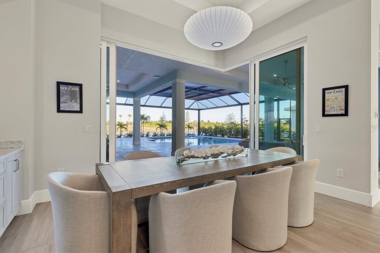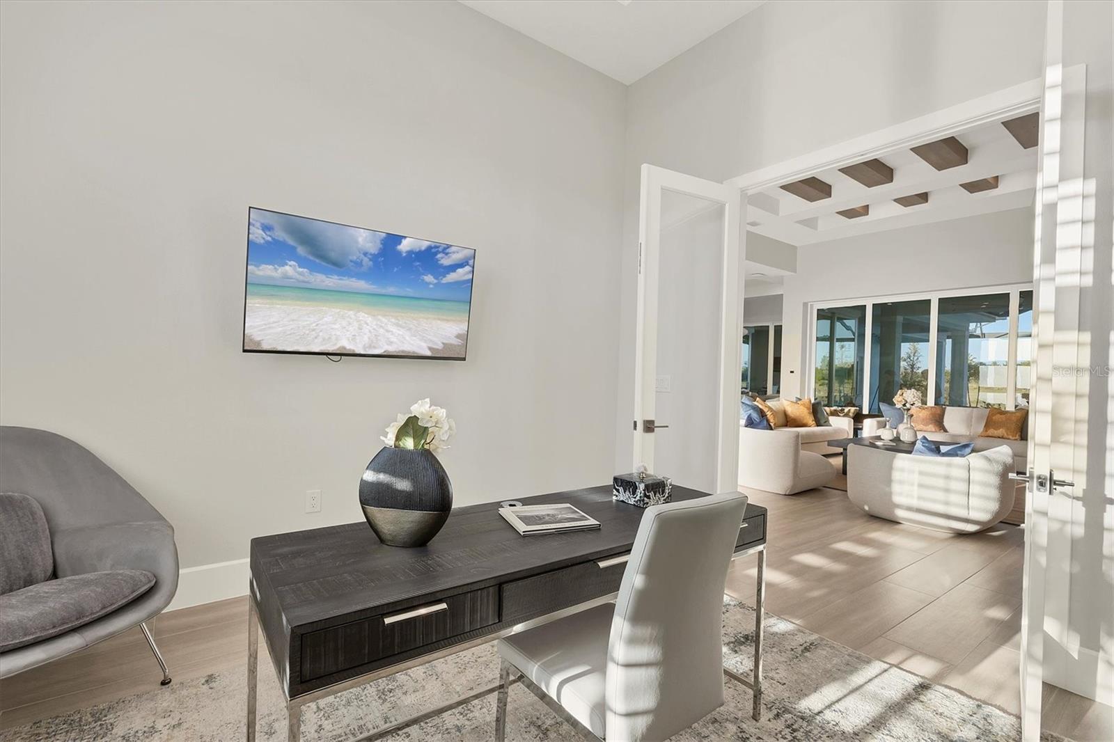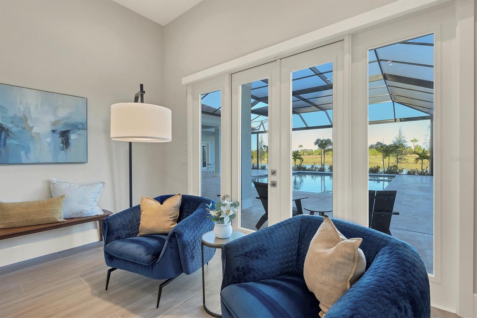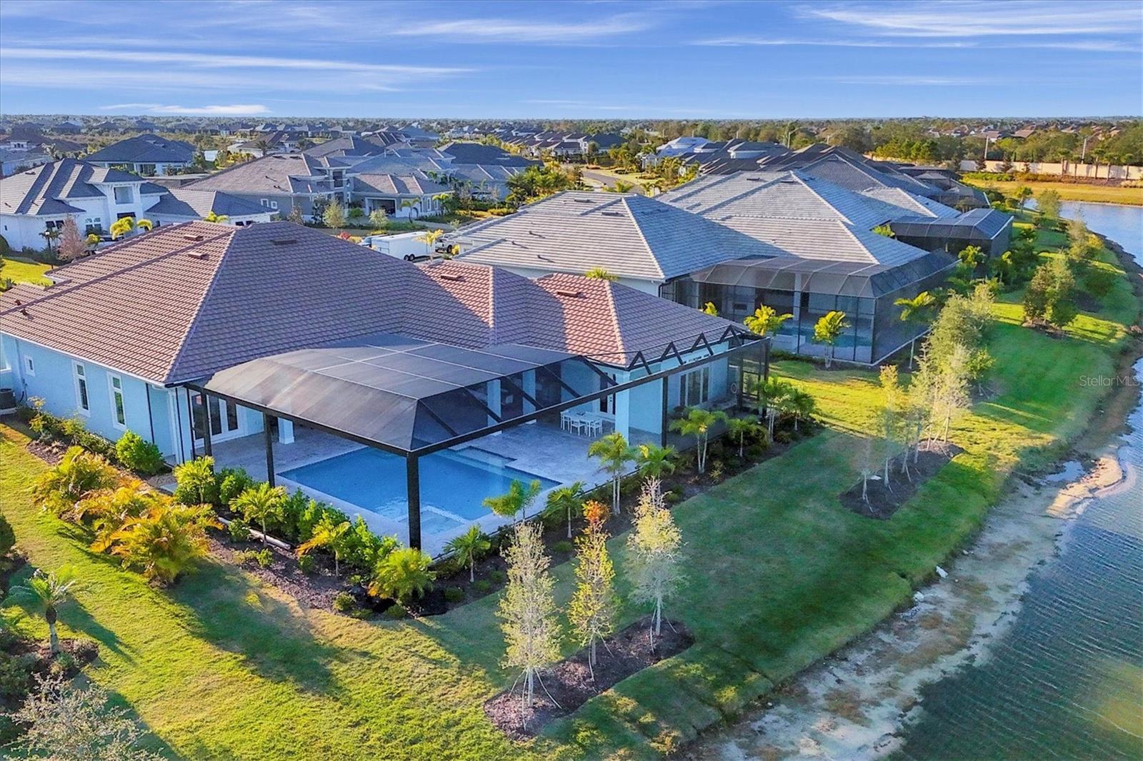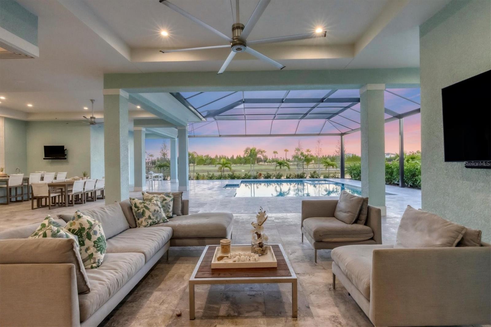 Indulge in the ultimate blend of luxury and contemporary comfort in this impeccably designed estate, nestled within the prestigious Lake Club of Lakewood Ranch. Spanning an impressive 4,193 square feet, this exceptional residence showcases extraordinary craftsmanship and the finest high-end finishes also offers an optional furniture package available for additional purchase making moving in effortless—simply bring your personal belongings and come home. With four generously sized bedrooms, three sumptuous guest suites—including a private entrance casita—five and a half luxurious baths, a versatile bonus room, and an elegant den, this home perfectly encapsulates the elite Florida lifestyle. Upon entering through the 10-foot iron door with impact glass, you are welcomed into a breathtaking foyer adorned with a soaring 14-foot ceiling and intricate detailing that sets the tone for the entire home. Inside, the property boasts beautiful Bella Legno porcelain plank flooring, soaring 12-foot ceilings throughout, and elevated 14-foot ceilings in select areas, lending an air of grandeur. The gourmet kitchen is a chef's dream, outfitted with top-tier Sub-Zero and Wolf appliances, a stunning quartzite island, a farmhouse sink, and dual pantries for ample storage. The adjacent dining area is equipped with a wine refrigerator and custom-built cabinetry, adding both functionality and sophistication. The expansive great room, highlighted by an exquisite feature ceiling, offers an ideal space for both relaxation and entertaining guests. The luxurious primary bedroom is a serene retreat, leading to a spa-inspired bath complete with a walk-in shower, designer tiles, custom closets, and a rejuvenating spa tub. The spacious bonus room, complete with a walk-in closet, provides the perfect venue for additional entertainment or a private haven. The three elegant guest suites, each with its own en-suite bath, promise ultimate comfort and privacy, while the casita, featuring its own entrance, wet bar, and bespoke finishes, offers an intimate escape. Step outside to the extraordinary outdoor living area, where you’ll find a vast lanai featuring travertine tile, a gas hookup for a fireplace, and panoramic screening to enhance your outdoor enjoyment. A brand-new stainless-steel pool cage, installed in 2024, surrounds the expansive saltwater pool and spa. The state-of-the-art outdoor kitchen includes a Wolf gas grill, refrigerator, dishwasher, ice maker, and a reverse osmosis water filtration system. Designed with cutting-edge technology for ultimate convenience, this home features hurricane-impact windows, an advanced security system with eight cameras, Wi-Fi extenders, in-ceiling speakers, and smart home capabilities, including IC View cameras, Lutron lighting, and Sonos sound systems. The expanded garage boasts epoxy resin flooring, air-conditioning units, custom cabinetry, and an electric vehicle charging station. Located within the exclusive Lake Club community, residents enjoy access to world-class amenities, including a luxurious clubhouse, a state-of-the-art fitness center, a rejuvenating spa, tennis courts, and a resort-style pool. Offering the perfect balance of privacy, luxury, and convenience, this home is ideally situated near top-rated schools and the stunning Gulf Coast beaches, making it a truly exceptional offering in Lakewood Ranch.