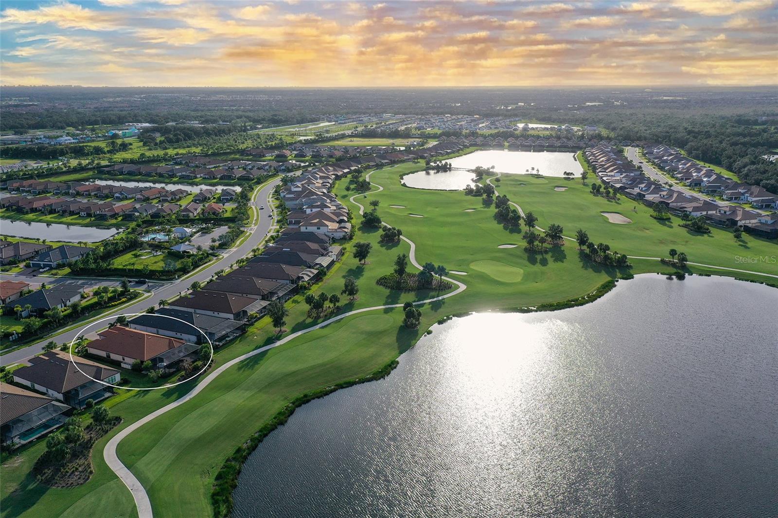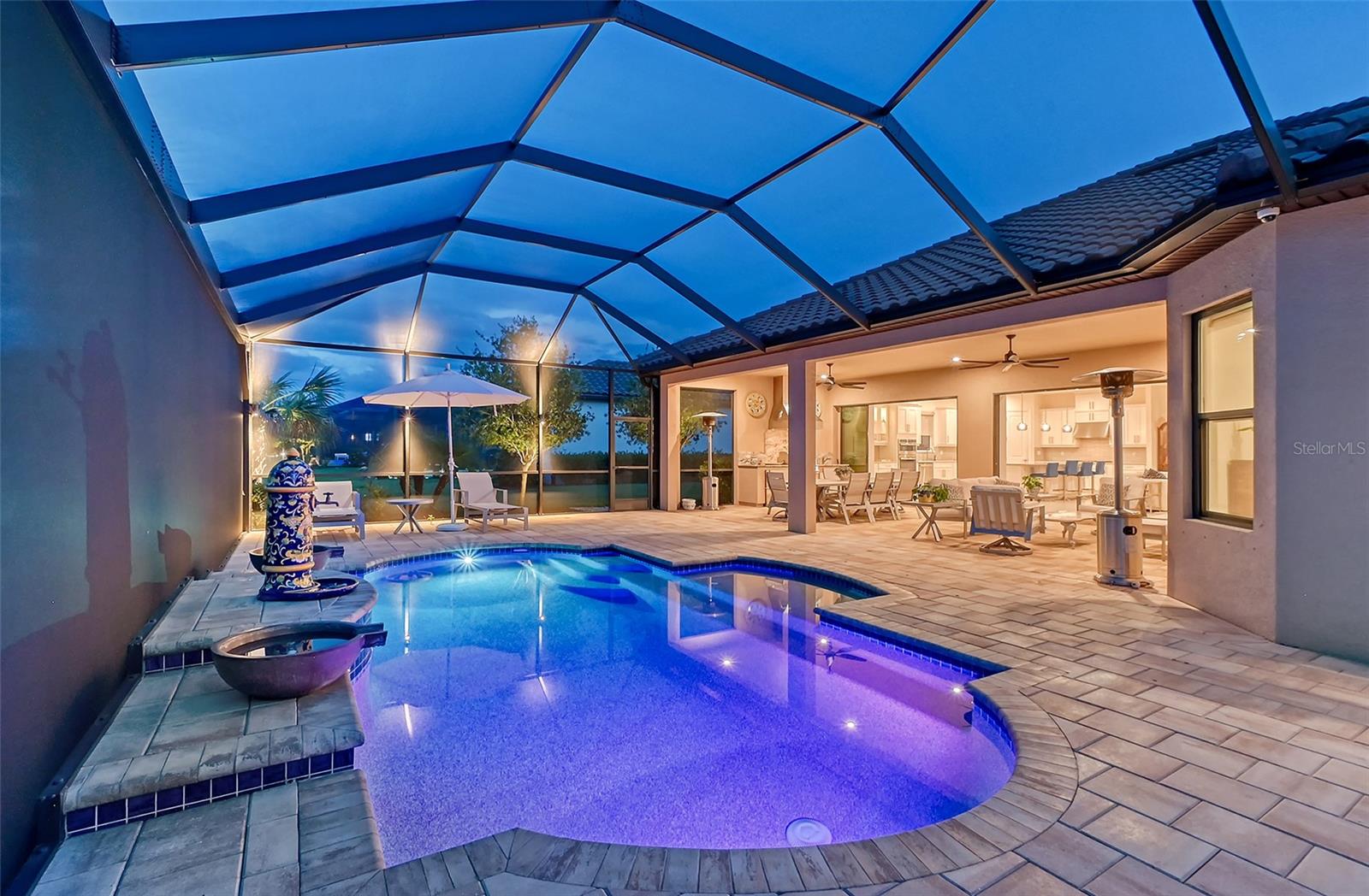Upon entering this Pallazio open floor plan through exquisite glass double front doors, you are immediately greeted by breathtaking golf and lake views. This residence is a lavish display of award-winning design, featuring custom finishes and masterful craftsmanship throughout. The seamless indoor-outdoor Florida lifestyle is embraced through double pocket slider doors that lead to an extended covered lanai, an enchanting heated pool with Lutron color-changing lights and waterfall pots, a clear view cage with stunning golf and water views, and an outdoor kitchen complete with grill and range hood, sink, storage cabinets and stone countertops. Inside, the spacious family room overlooks an open kitchen and dining area adorned with custom lighting. The kitchen is a chef’s dream, boasting exquisite wood cabinetry with pullout shelves, an extended island with quartz countertops and additional front cabinets, top-of-the-line appliances, an extended bar with glass cabinetry, a walk-in pantry, gas cooktop, under-cabinet lighting, designer glass backsplash and a water filtration system under the sink. The primary suite is an oasis of comfort, featuring an extended sitting area with bay windows, tile floors, motorized shades, stunning golf and lake views, and a luxurious bath with an oversized glass walk-in shower, double vanities with quartz countertops, and a spacious closet with custom built-ins. The guest rooms are generously sized, each with en-suite baths and framed glass mirrors. A den/office with glass French doors, motorized shades, and built-in shelving completes the interior, leaving no detail overlooked. Additional highlights include impact windows in the front and hurricane shutters, custom lighting in every room, a built-in Closet Tec system in all closets, storage racks in the extended three-car tandem garage, gutters around the entire house, and landscape lighting throughout. This golf membership home offers access to world-class amenities, including a resort-style pool with a Bahama bar, an onsite restaurant, wellness and fitness centers, sports courts for tennis and pickleball, and an incredible golf course with a practice range. This is luxury living at its finest.
