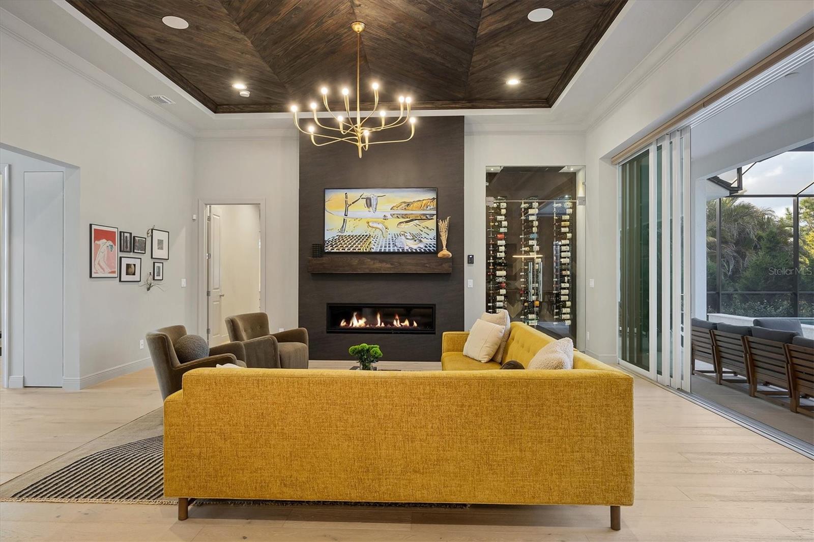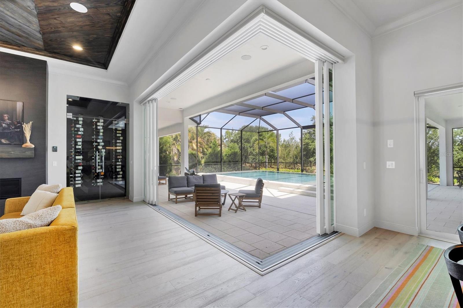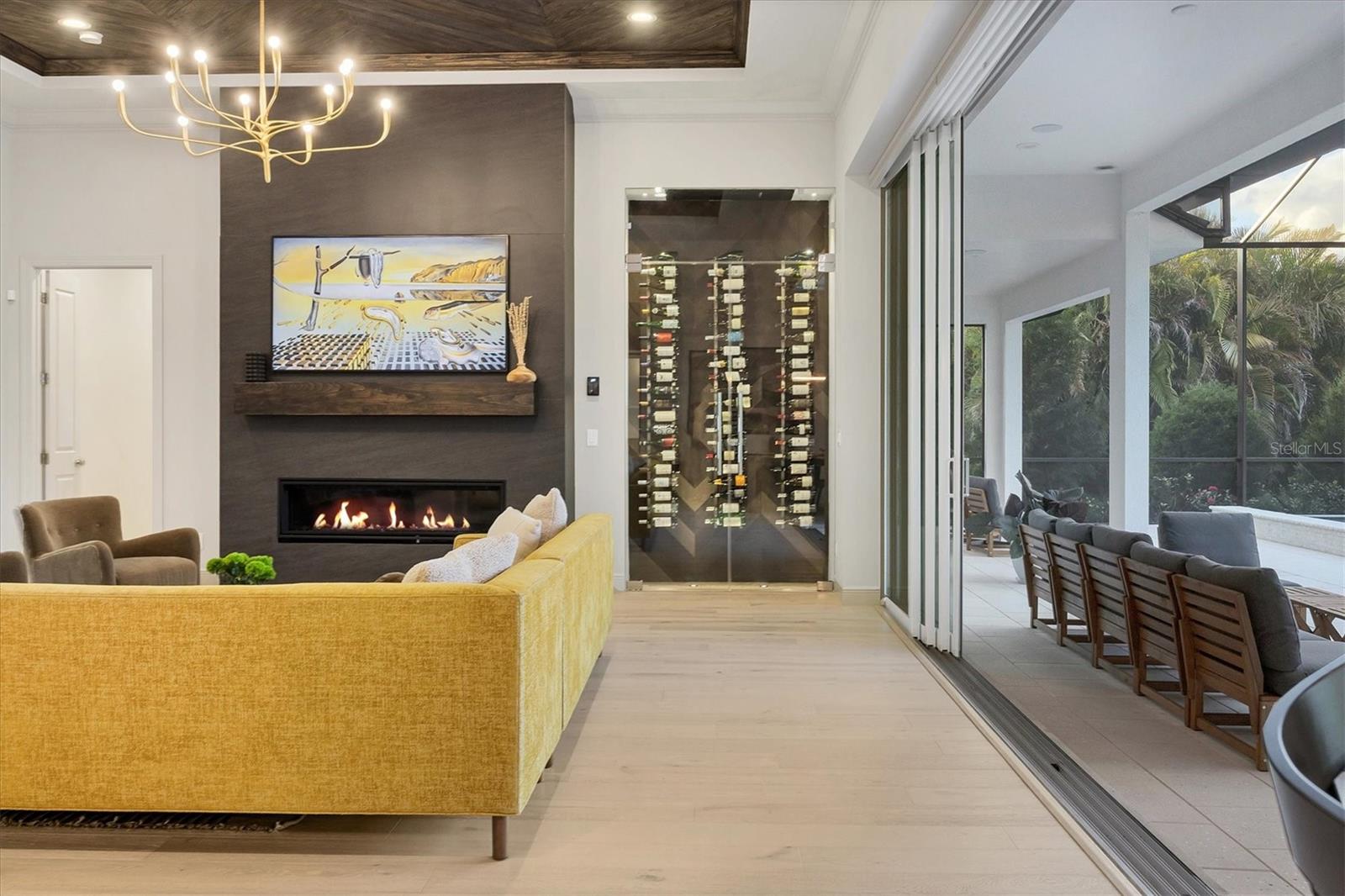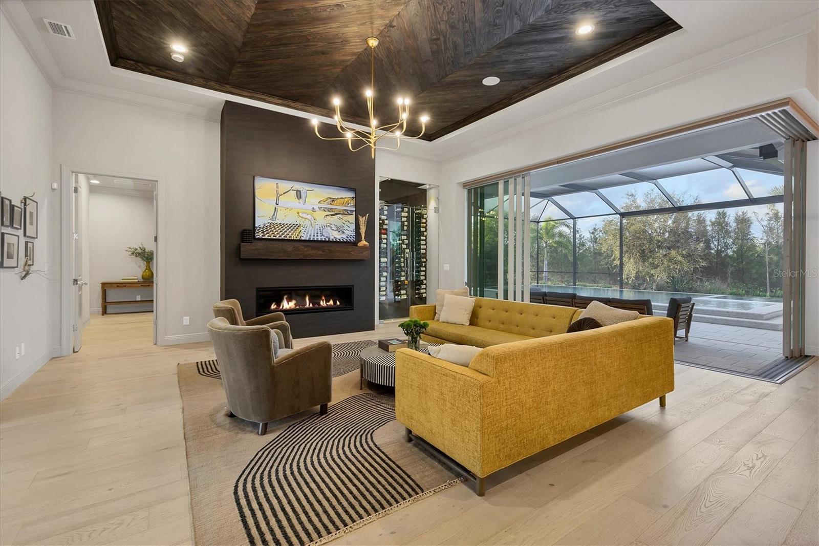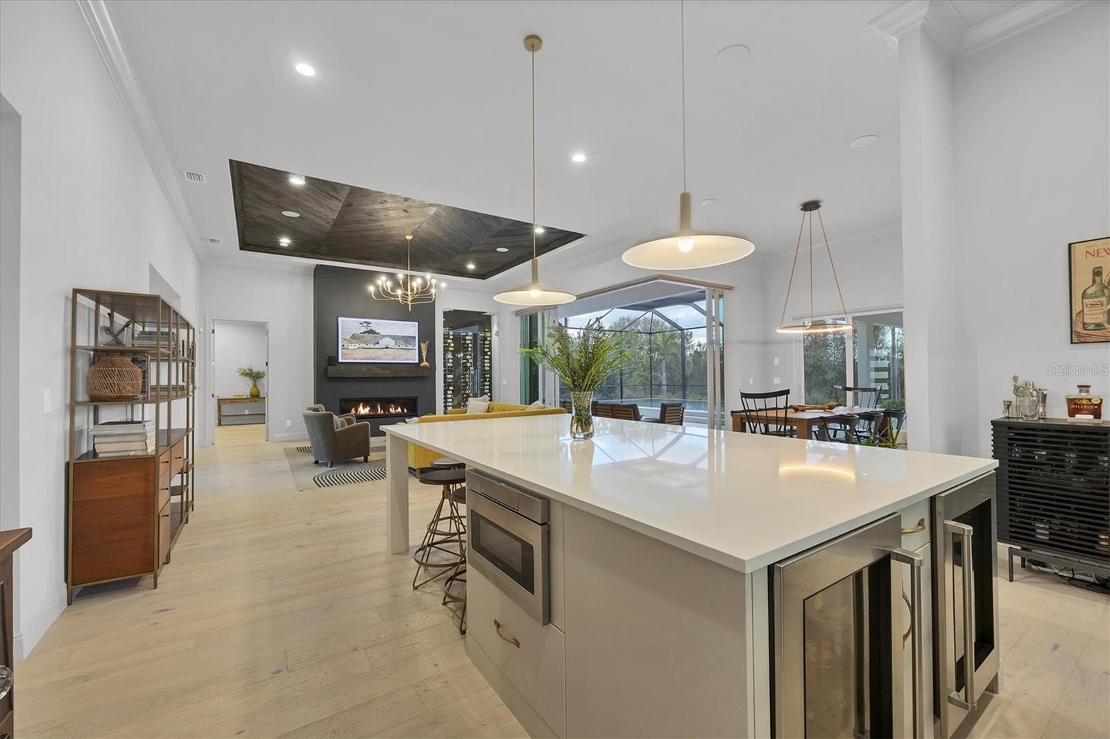 Perfectly situated on a quiet preserve in the exclusive gated enclave of Country Club East, this exceptional John Cannon residence showcases refined craftsmanship, modern luxury, and seamless indoor-outdoor living. Designed for both comfort and impact, the home features impact-rated windows and doors, a full-house generator, and an open layout that’s as functional as it is beautiful. Step through 10-foot iron and glass double doors into a dramatic great room with whitewashed European oak flooring, soaring 13-foot ceilings with chevron wood detail, and a striking natural gas fireplace framed by Basalt volcanic tile and reclaimed wood mantle. A custom Whisperkool wine wall holds up to 130 bottles, accented by a chevron Stickwood backdrop. The main foyer features a hidden closet for bags and shoes. The chef’s kitchen boasts Sub-Zero and Wolf appliances, a 6-burner range, built-in oven and microwave, quartz countertops, a prep island outfitted with pull-out drawers—two for spices—, a farmhouse sink and a standalone ice maker. A entertaining-sized island outside the kitchen features, Uline beverage and wine coolers, an additional microwave, and ample hidden storage. A spacious walk-in pantry is steps away and includes a built-in tall closet. The great room’s 10-foot sliders fold back into a disappearing corner and lead to the expansive lanai with a PebbleTec infinity-edge heated saltwater pool and spa, panoramic screen enclosure, Shell Lock pavers, and a fully outfitted summer kitchen with Alfresco grill, Trailwinds hood, True ice machine, Uline fridge, and Blanco sink. The private owner’s wing includes two walk-in closets, tray ceiling with crown molding, lanai access, and a spa-style bath with radiant heated floors and a steam shower. Two guest suites are positioned in separate wings—each with its own full bath and walk-in closet—one with a private entrance and drop zone, the other with pool bath access. Additional living spaces include a bonus room with 10-foot sliders as a second disappearing corner as well as a study/exercise room with 15-foot ceilings. The laundry room features abundant cabinet storage, designer tile, sink, and an additional 60 square feet of dedicated storage carved out behind two double doors. Adding even more value, the home is equipped with a whole-house water filtration system, designer lighting, automatic blinds, and an oversized 3-car garage. Every detail of this home has been thoughtfully curated for elevated living in one of Lakewood Ranch’s most prestigious communities.