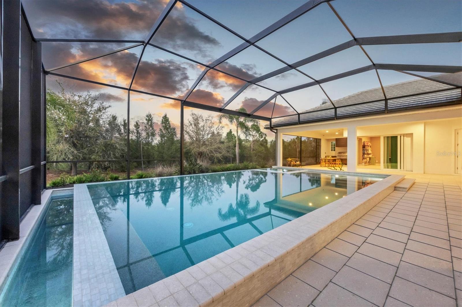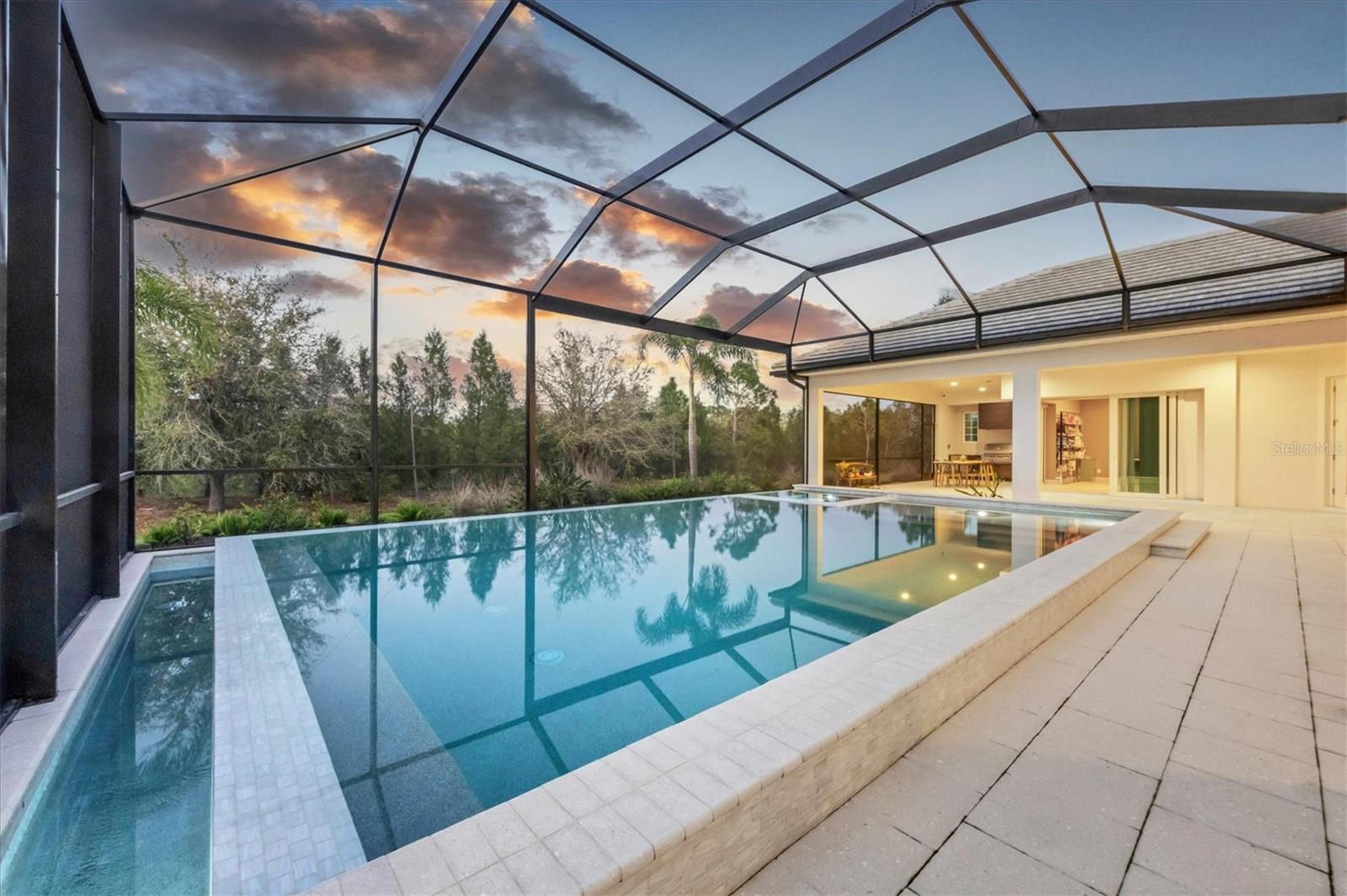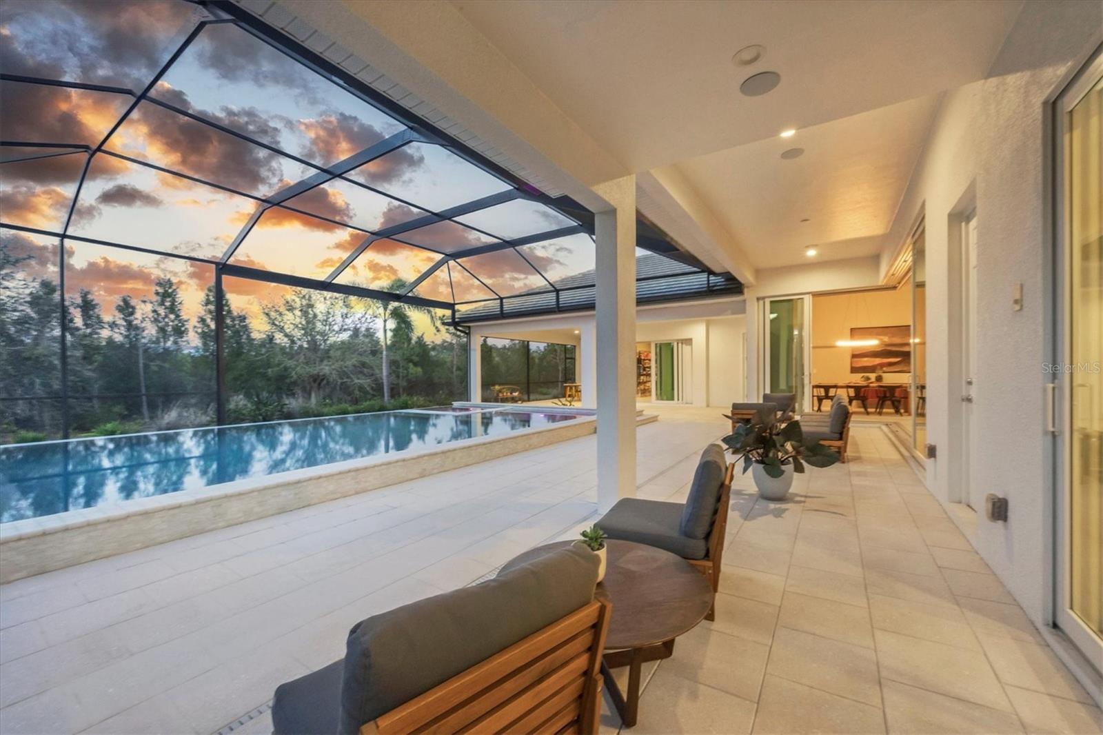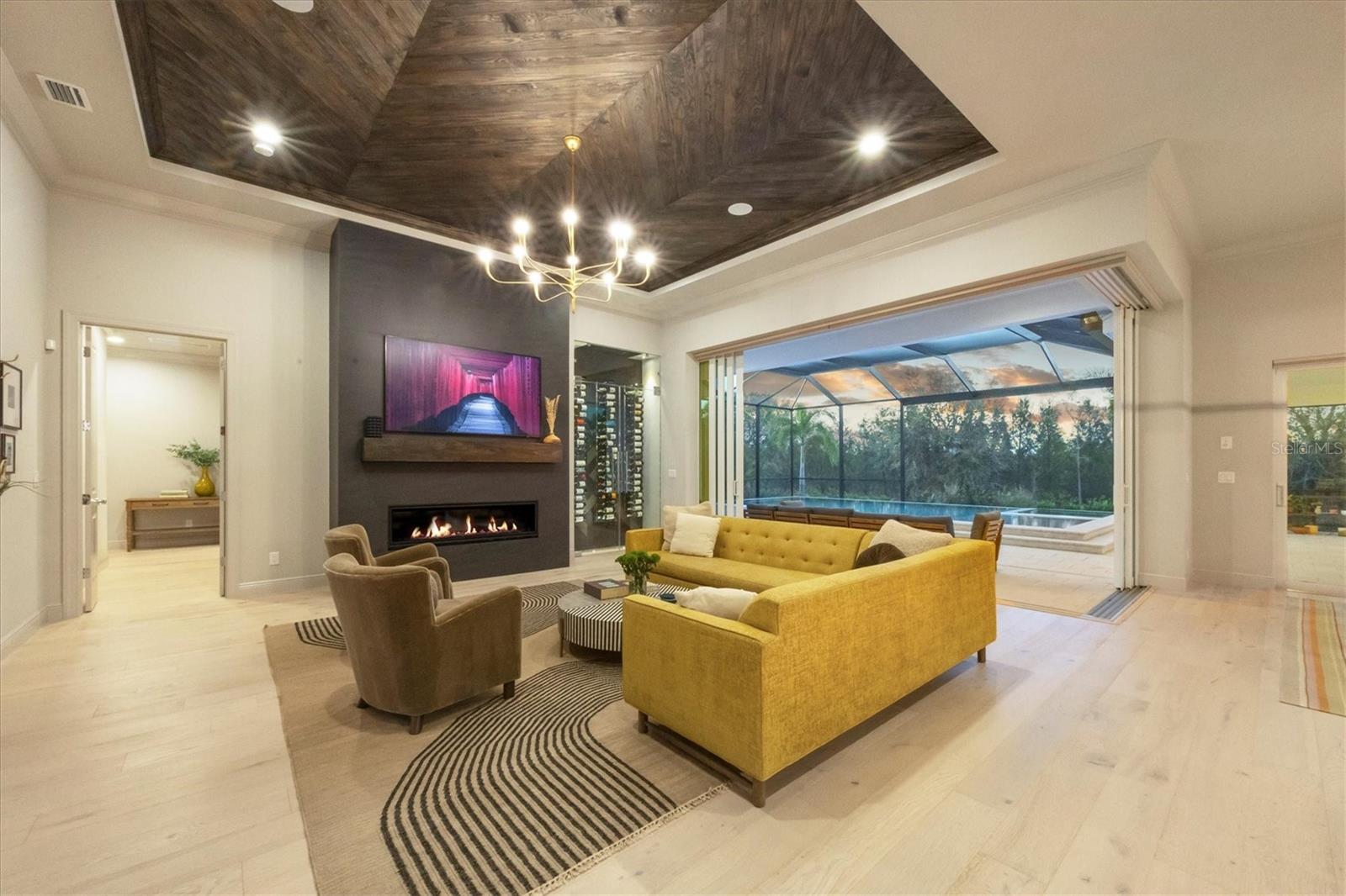 Perfectly situated on a quiet preserve in the exclusive gated enclave of Country Club East, this exceptional John Cannon residence showcases refined craftsmanship, modern luxury, and seamless indoor-outdoor living. Designed for both comfort and impact, the home features impact-rated windows and doors, a full-house generator, and an open layout that’s as functional as it is beautiful. Step through 10-foot iron and glass double doors into a dramatic great room with whitewashed European oak flooring, soaring 13-foot ceilings with chevron wood detail, and a striking natural gas fireplace framed by Basalt volcanic tile and reclaimed wood mantle. A custom Whisperkool wine wall holds up to 130 bottles, accented by a chevron Stickwood backdrop. The main foyer features a hidden closet for bags and shoes. The chef’s kitchen boasts Sub-Zero and Wolf appliances, a 6-burner range, built-in oven and microwave, quartz countertops, a prep island outfitted with pull-out drawers—two for spices—, a farmhouse sink and a standalone ice maker. A entertaining-sized island outside the kitchen features, Uline beverage and wine coolers, an additional microwave, and ample hidden storage. A spacious walk-in pantry is steps away and includes a built-in tall closet. The great room’s 10-foot sliders fold back into a disappearing corner and lead to the expansive lanai with a PebbleTec infinity-edge heated saltwater pool and spa, panoramic screen enclosure, Shell Lock pavers, and a fully outfitted summer kitchen with Alfresco grill, Trailwinds hood, True ice machine, Uline fridge, and Blanco sink. The private owner’s wing includes two walk-in closets, tray ceiling with crown molding, lanai access, and a spa-style bath with radiant heated floors and a steam shower. Two guest suites are positioned in separate wings—each with its own full bath and walk-in closet—one with a private entrance and drop zone, the other with pool bath access. Additional living spaces include a bonus room with 10-foot sliders as a second disappearing corner as well as a study/exercise room with 15-foot ceilings. The laundry room features abundant cabinet storage, designer tile, sink, and an additional 60 square feet of dedicated storage carved out behind two double doors. Adding even more value, the home is equipped with a whole-house water filtration system, designer lighting, automatic blinds, and an oversized 3-car garage. Every detail of this home has been thoughtfully curated for elevated living in one of Lakewood Ranch’s most prestigious communities.
