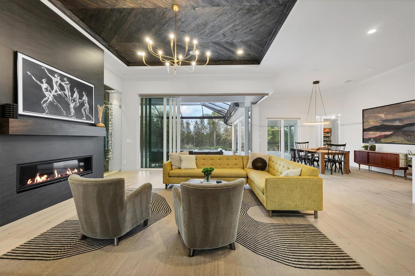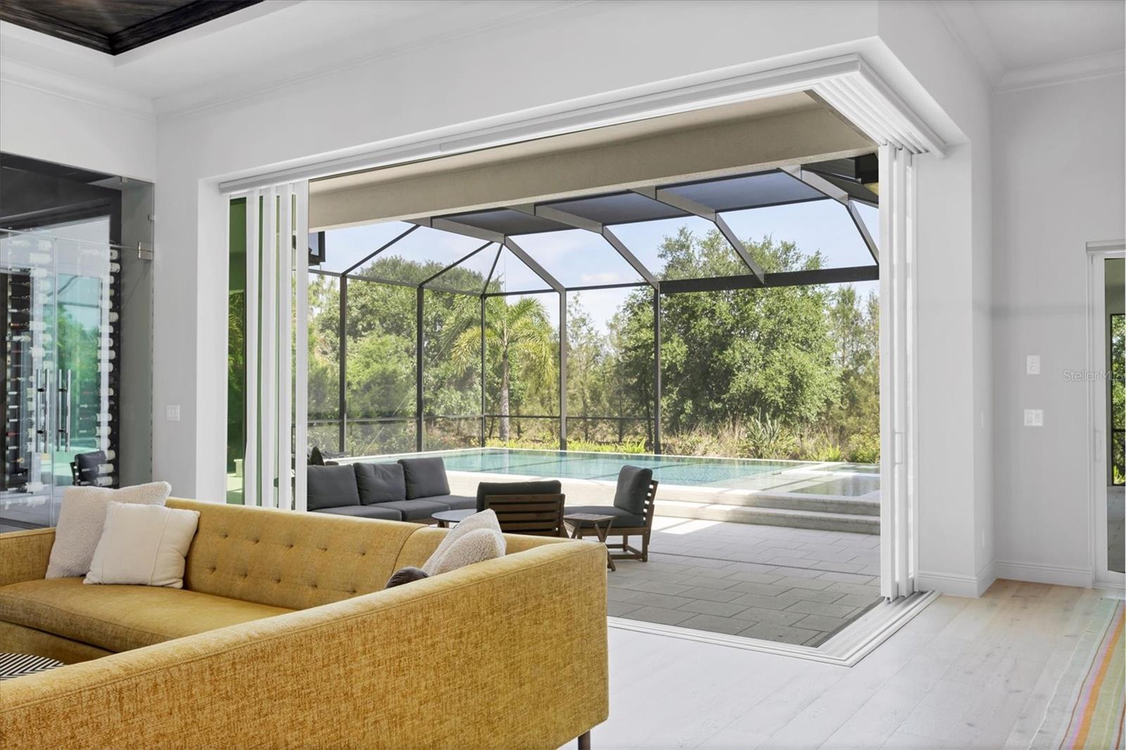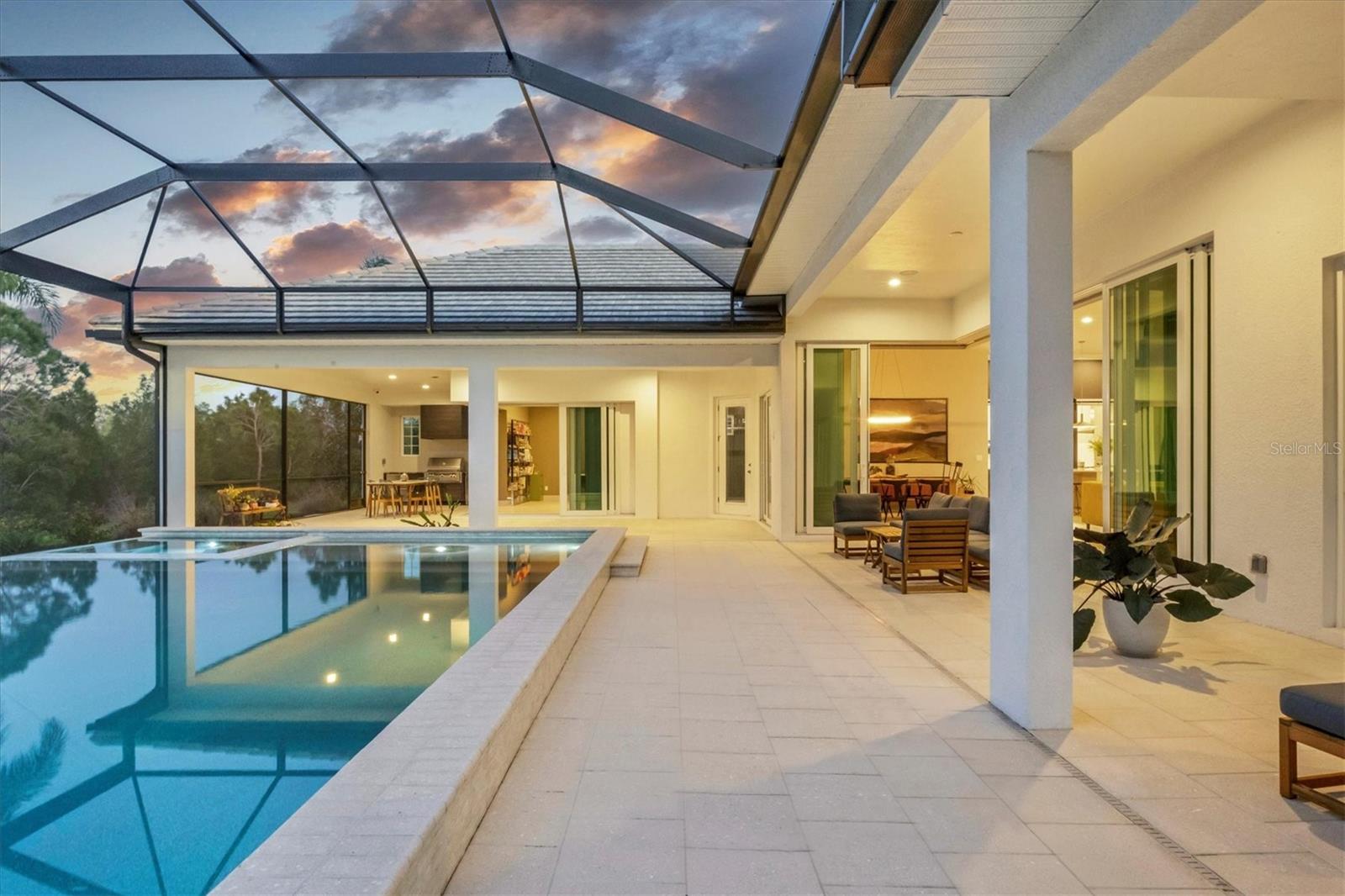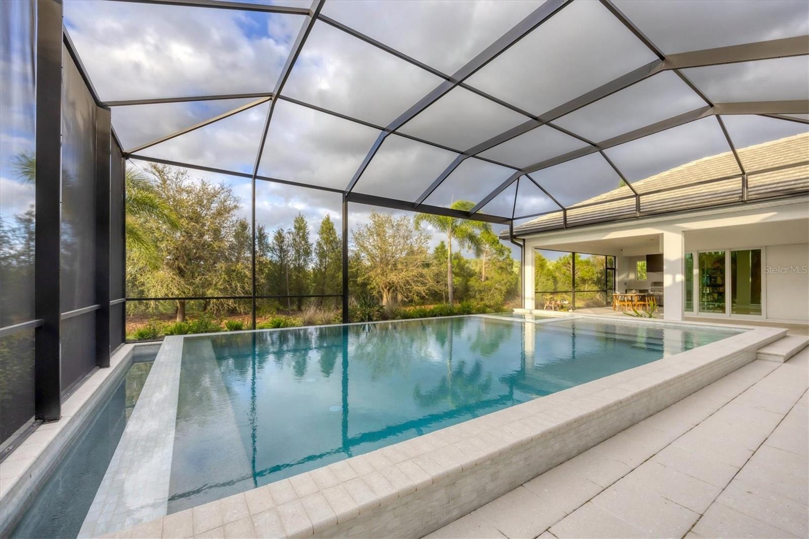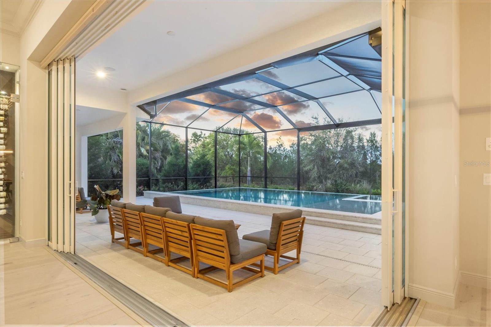 Perfectly situated on a quiet preserve in the exclusive gated enclave of Country Club East, this exceptional John Cannon residence showcases refined craftsmanship, modern luxury, and seamless indoor-outdoor living. Designed for both comfort and impact, the home features impact-rated windows and doors, a full-house generator, and an open layout that’s as functional as it is beautiful. Step through 10-foot iron and glass double doors into a dramatic great room with whitewashed European oak flooring, soaring 13-foot ceilings with chevron wood detail, and a striking natural gas fireplace framed by Basalt volcanic tile and reclaimed wood mantle. A custom Whisperkool wine wall holds up to 130 bottles, accented by a chevron Stickwood backdrop. The main foyer features a hidden closet for bags and shoes. The chef’s kitchen boasts Sub-Zero and Wolf appliances, a 6-burner range, built-in oven and microwave, quartz countertops, a prep island outfitted with pull-out drawers—two for spices—, a farmhouse sink and a standalone ice maker. A entertaining-sized island outside the kitchen features, Uline beverage and wine coolers, an additional microwave, and ample hidden storage. A spacious walk-in pantry is steps away and includes a built-in tall closet. The great room’s 10-foot sliders fold back into a disappearing corner and lead to the expansive lanai with a PebbleTec infinity-edge heated saltwater pool and spa, panoramic screen enclosure, Shell Lock pavers, and a fully outfitted summer kitchen with Alfresco grill, Trailwinds hood, True ice machine, Uline fridge, and Blanco sink. The private owner’s wing includes two walk-in closets, tray ceiling with crown molding, lanai access, and a spa-style bath with radiant heated floors and a steam shower. Two guest suites are positioned in separate wings—each with its own full bath and walk-in closet—one with a private entrance and drop zone, the other with pool bath access. Additional living spaces include a bonus room with 10-foot sliders as a second disappearing corner as well as a study/exercise room with 15-foot ceilings. The laundry room features abundant cabinet storage, designer tile, sink, and an additional 60 square feet of dedicated storage carved out behind two double doors. Adding even more value, the home is equipped with a whole-house water filtration system, designer lighting, automatic blinds, and an oversized 3-car garage. Every detail of this home has been thoughtfully curated for elevated living in one of Lakewood Ranch’s most prestigious communities.