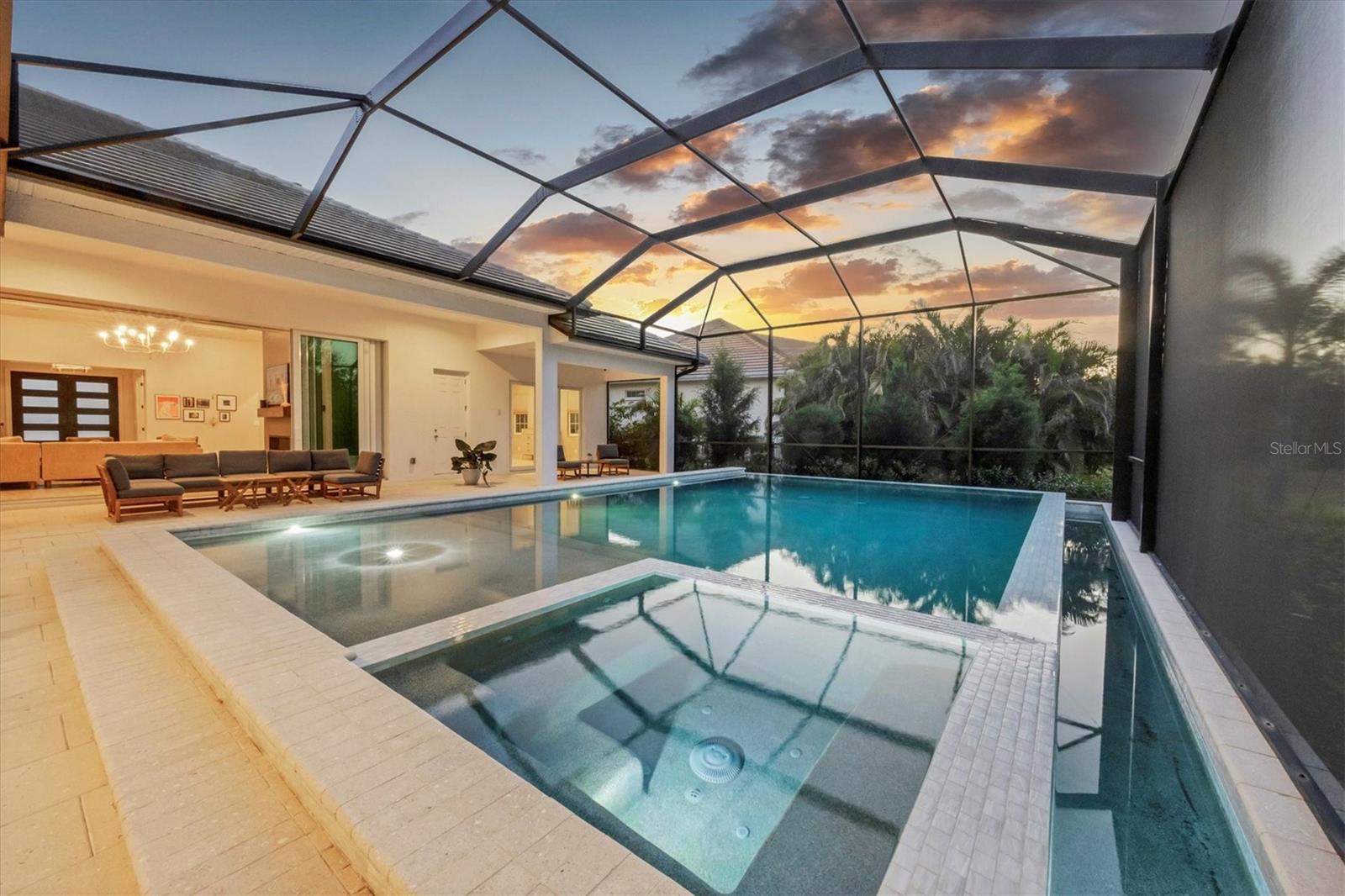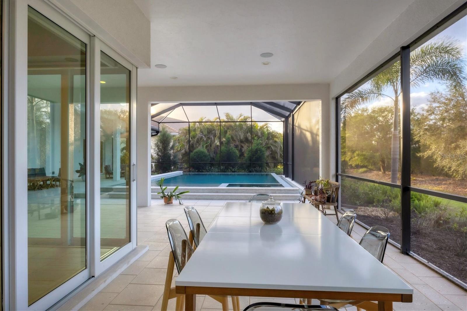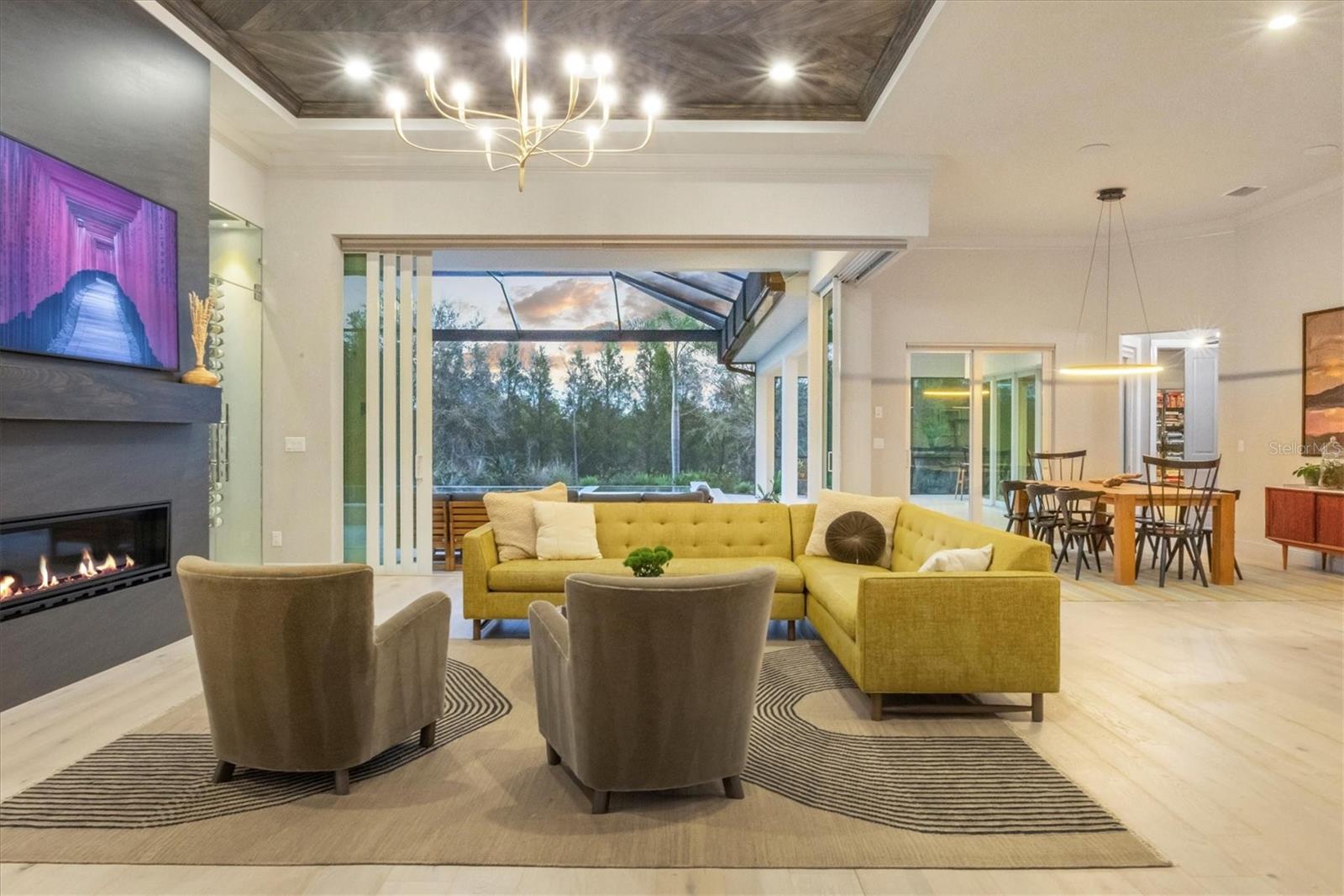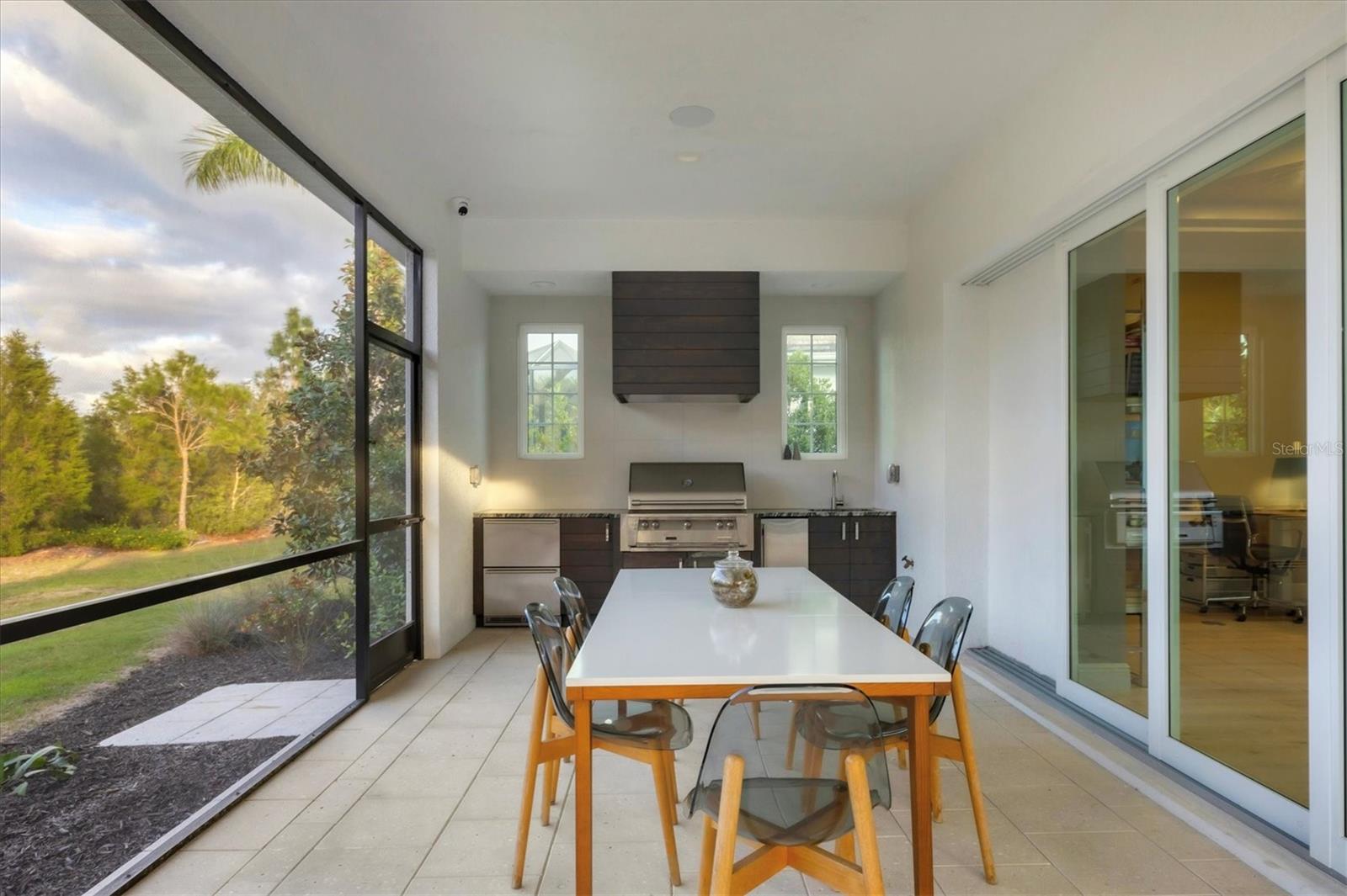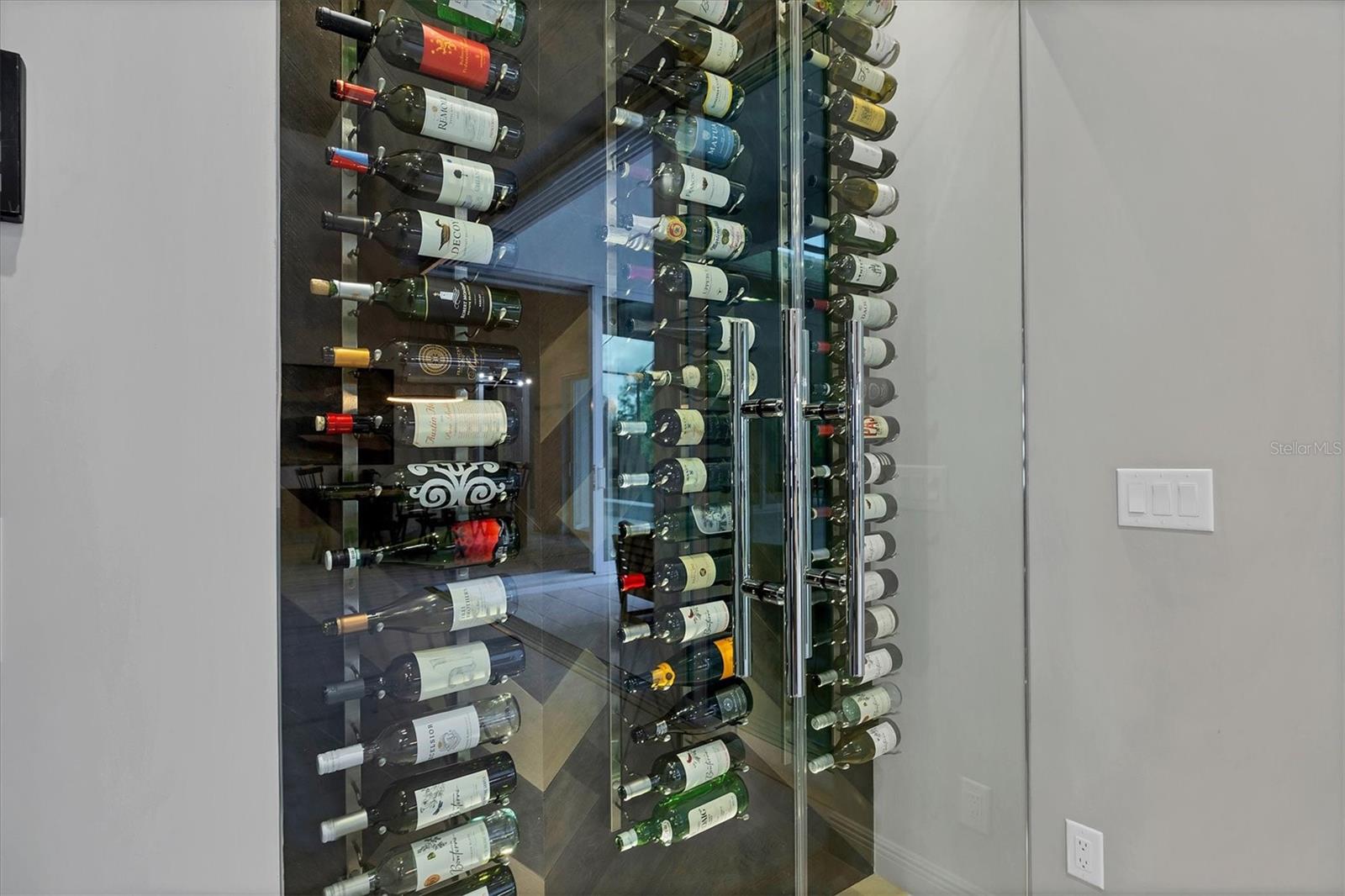 Perfectly situated on a quiet preserve in the exclusive gated enclave of Country Club East, this exceptional John Cannon residence showcases refined craftsmanship, modern luxury, and seamless indoor-outdoor living. Designed for both comfort and impact, the home features impact-rated windows and doors, a full-house generator, and an open layout that’s as functional as it is beautiful. Step through 10-foot iron and glass double doors into a dramatic great room with whitewashed European oak flooring, soaring 13-foot ceilings with chevron wood detail, and a striking natural gas fireplace framed by Basalt volcanic tile and reclaimed wood mantle. A custom Whisperkool wine wall holds up to 130 bottles, accented by a chevron Stickwood backdrop. The main foyer features a hidden closet for bags and shoes. The chef’s kitchen boasts Sub-Zero and Wolf appliances, a 6-burner range, built-in oven and microwave, quartz countertops, a prep island outfitted with pull-out drawers—two for spices—, a farmhouse sink and a standalone ice maker. A entertaining-sized island outside the kitchen features, Uline beverage and wine coolers, an additional microwave, and ample hidden storage. A spacious walk-in pantry is steps away and includes a built-in tall closet. The great room’s 10-foot sliders fold back into a disappearing corner and lead to the expansive lanai with a PebbleTec infinity-edge heated saltwater pool and spa, panoramic screen enclosure, Shell Lock pavers, and a fully outfitted summer kitchen with Alfresco grill, Trailwinds hood, True ice machine, Uline fridge, and Blanco sink. The private owner’s wing includes two walk-in closets, tray ceiling with crown molding, lanai access, and a spa-style bath with radiant heated floors and a steam shower. Two guest suites are positioned in separate wings—each with its own full bath and walk-in closet—one with a private entrance and drop zone, the other with pool bath access. Additional living spaces include a bonus room with 10-foot sliders as a second disappearing corner as well as a study/exercise room with 15-foot ceilings. The laundry room features abundant cabinet storage, designer tile, sink, and an additional 60 square feet of dedicated storage carved out behind two double doors. Adding even more value, the home is equipped with a whole-house water filtration system, designer lighting, automatic blinds, and an oversized 3-car garage. Every detail of this home has been thoughtfully curated for elevated living in one of Lakewood Ranch’s most prestigious communities.