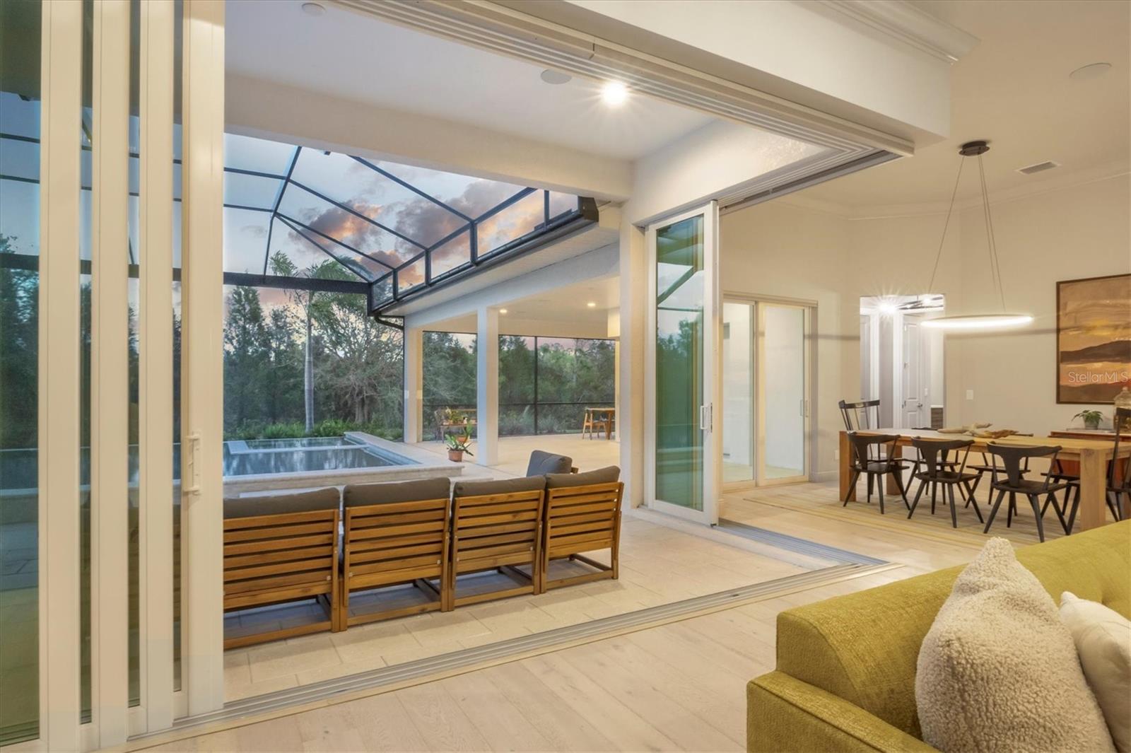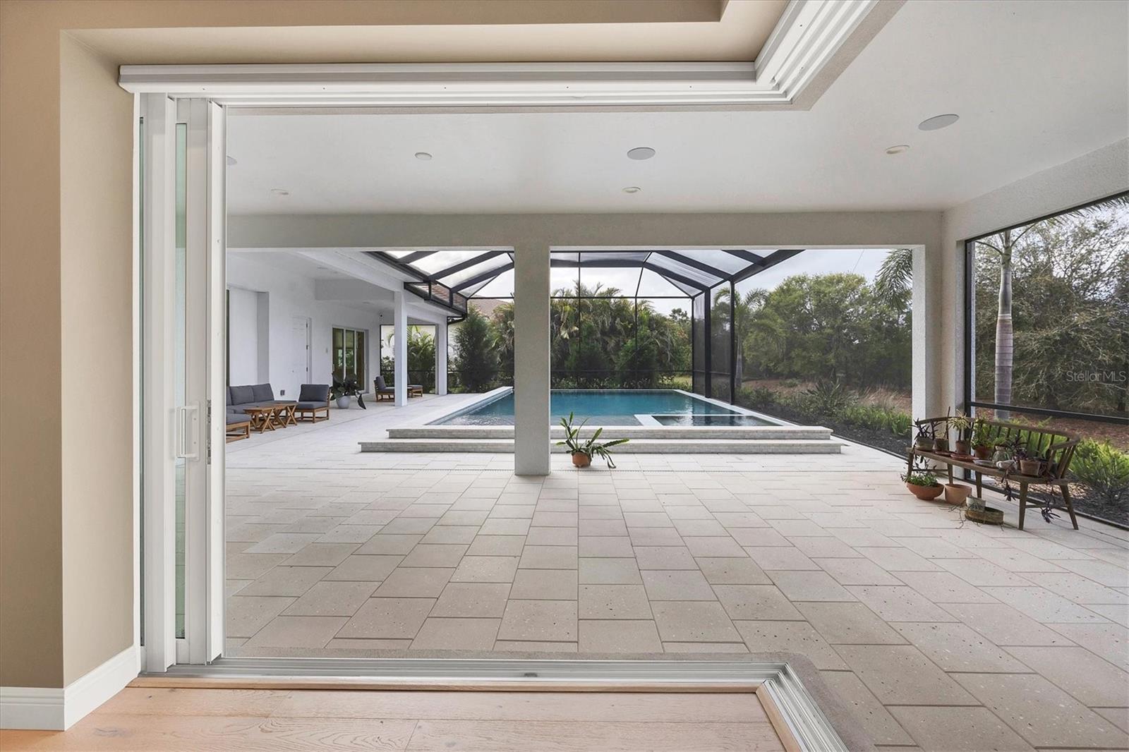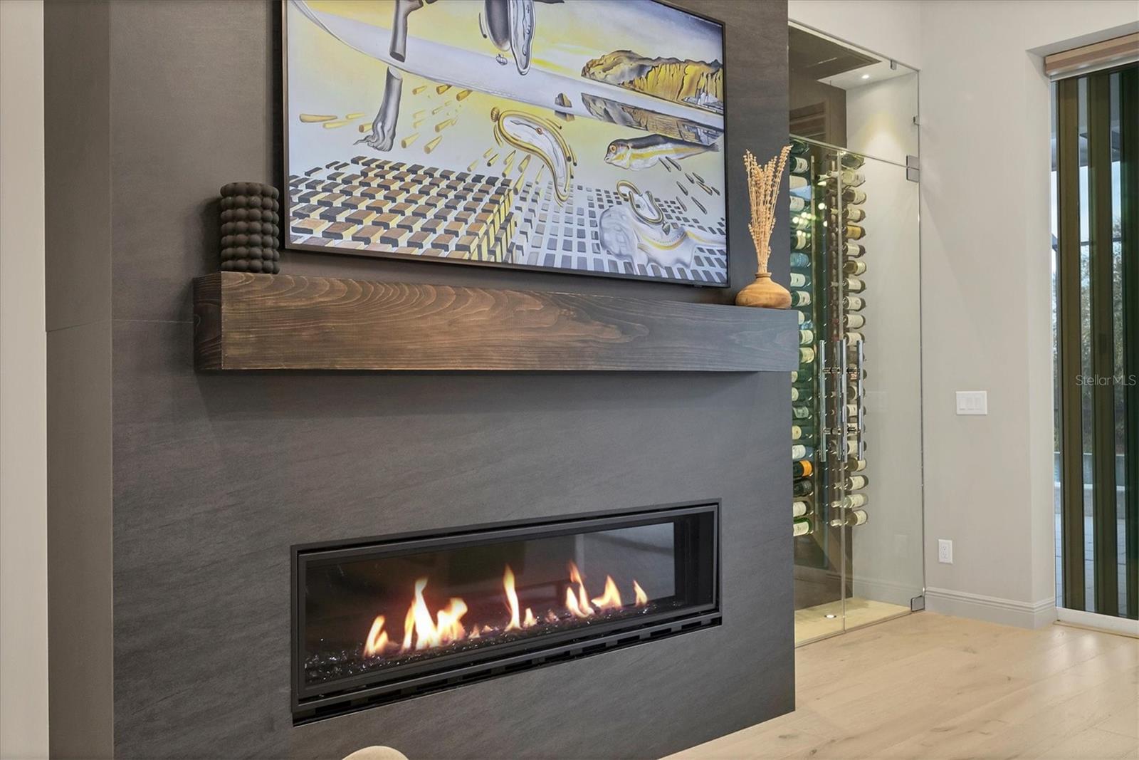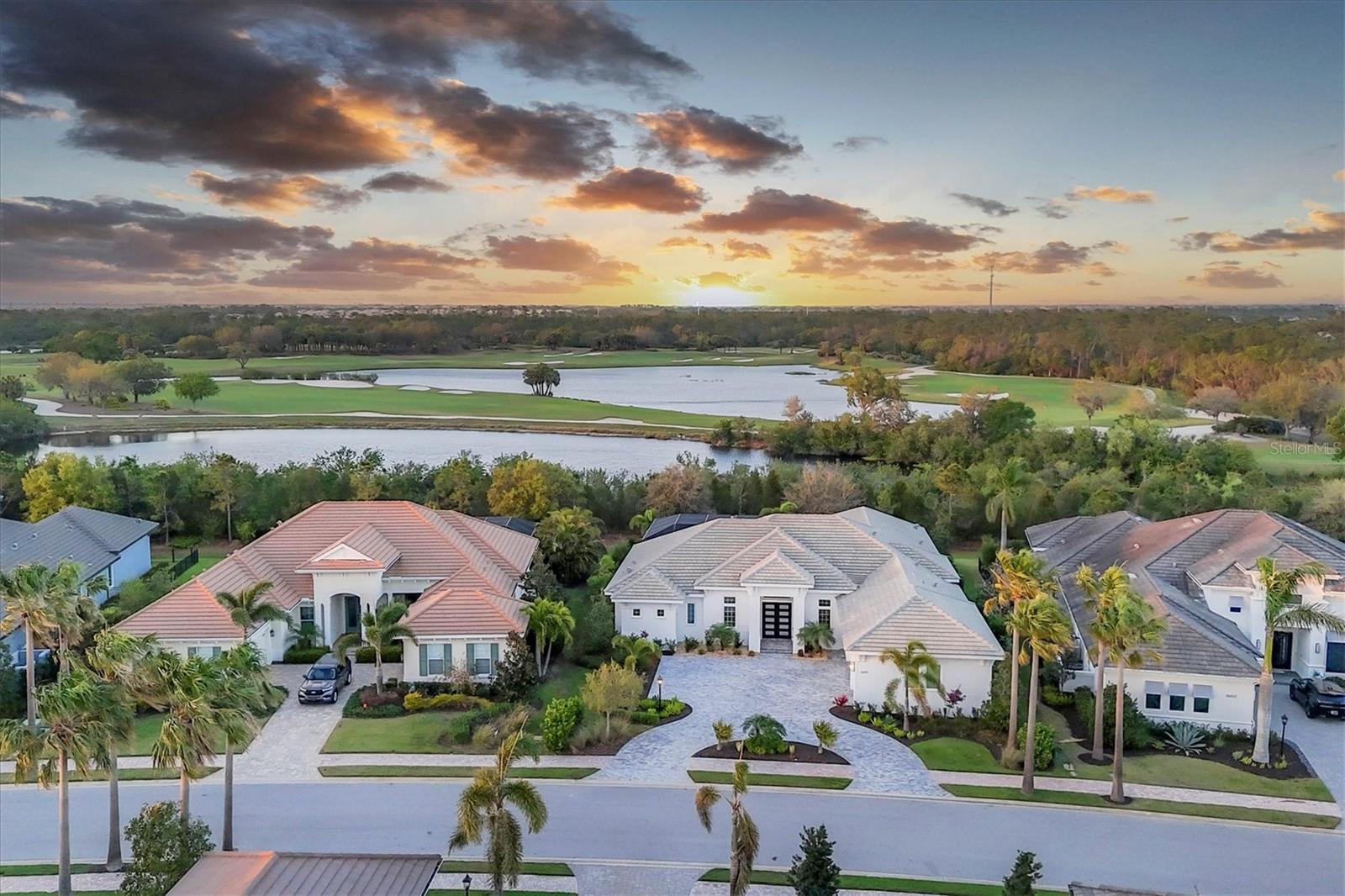 Perfectly situated on a quiet preserve in the exclusive gated enclave of Country Club East, this exceptional John Cannon residence showcases refined craftsmanship, modern luxury, and seamless indoor-outdoor living. Designed for both comfort and impact, the home features impact-rated windows and doors, a full-house generator, and an open layout that’s as functional as it is beautiful. Step through 10-foot iron and glass double doors into a dramatic great room with whitewashed European oak flooring, soaring 13-foot ceilings with chevron wood detail, and a striking natural gas fireplace framed by Basalt volcanic tile and reclaimed wood mantle. A custom Whisperkool wine wall holds up to 130 bottles, accented by a chevron Stickwood backdrop. The main foyer features a hidden closet for bags and shoes. The chef’s kitchen boasts Sub-Zero and Wolf appliances, a 6-burner range, built-in oven and microwave, quartz countertops, a prep island outfitted with pull-out drawers—two for spices—, a farmhouse sink and a standalone ice maker. A entertaining-sized island outside the kitchen features, Uline beverage and wine coolers, an additional microwave, and ample hidden storage. A spacious walk-in pantry is steps away and includes a built-in tall closet. The great room’s 10-foot sliders fold back into a disappearing corner and lead to the expansive lanai with a PebbleTec infinity-edge heated saltwater pool and spa, panoramic screen enclosure, Shell Lock pavers, and a fully outfitted summer kitchen with Alfresco grill, Trailwinds hood, True ice machine, Uline fridge, and Blanco sink. The private owner’s wing includes two walk-in closets, tray ceiling with crown molding, lanai access, and a spa-style bath with radiant heated floors and a steam shower. Two guest suites are positioned in separate wings—each with its own full bath and walk-in closet—one with a private entrance and drop zone, the other with pool bath access. Additional living spaces include a bonus room with 10-foot sliders as a second disappearing corner as well as a study/exercise room with 15-foot ceilings. The laundry room features abundant cabinet storage, designer tile, sink, and an additional 60 square feet of dedicated storage carved out behind two double doors. Adding even more value, the home is equipped with a whole-house water filtration system, designer lighting, automatic blinds, and an oversized 3-car garage. Every detail of this home has been thoughtfully curated for elevated living in one of Lakewood Ranch’s most prestigious communities.