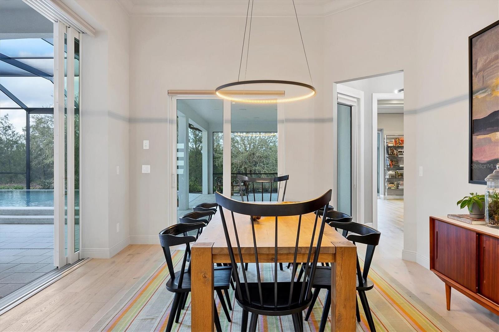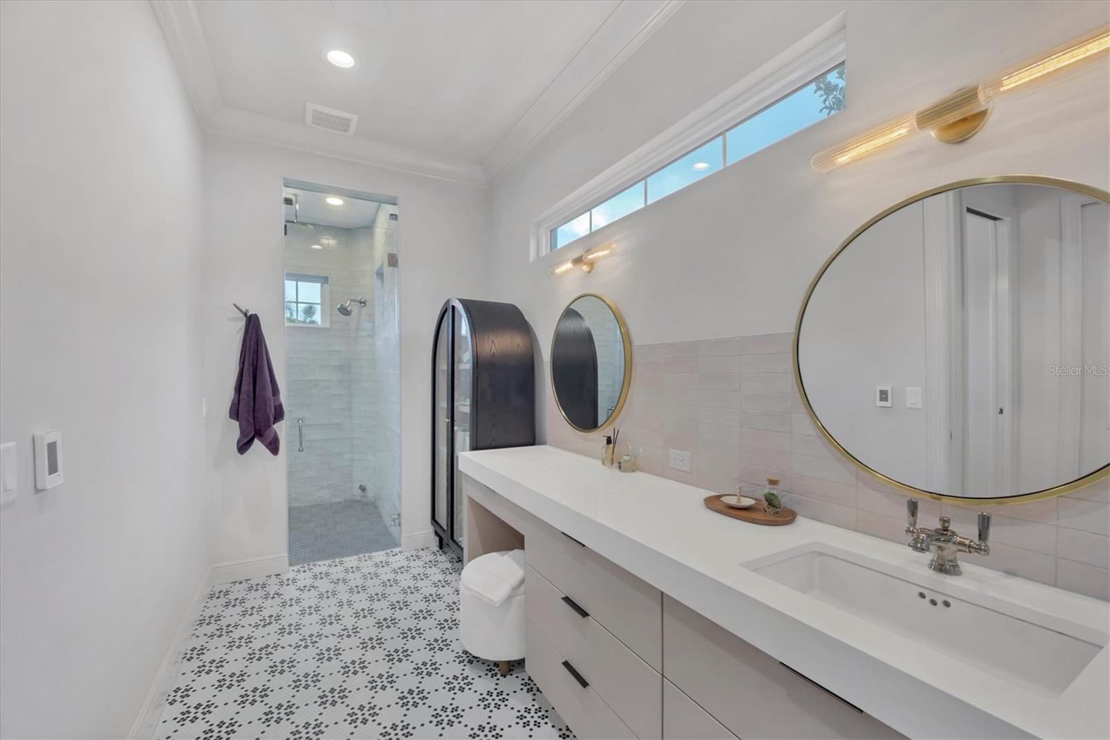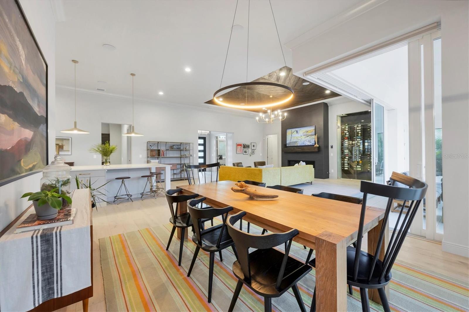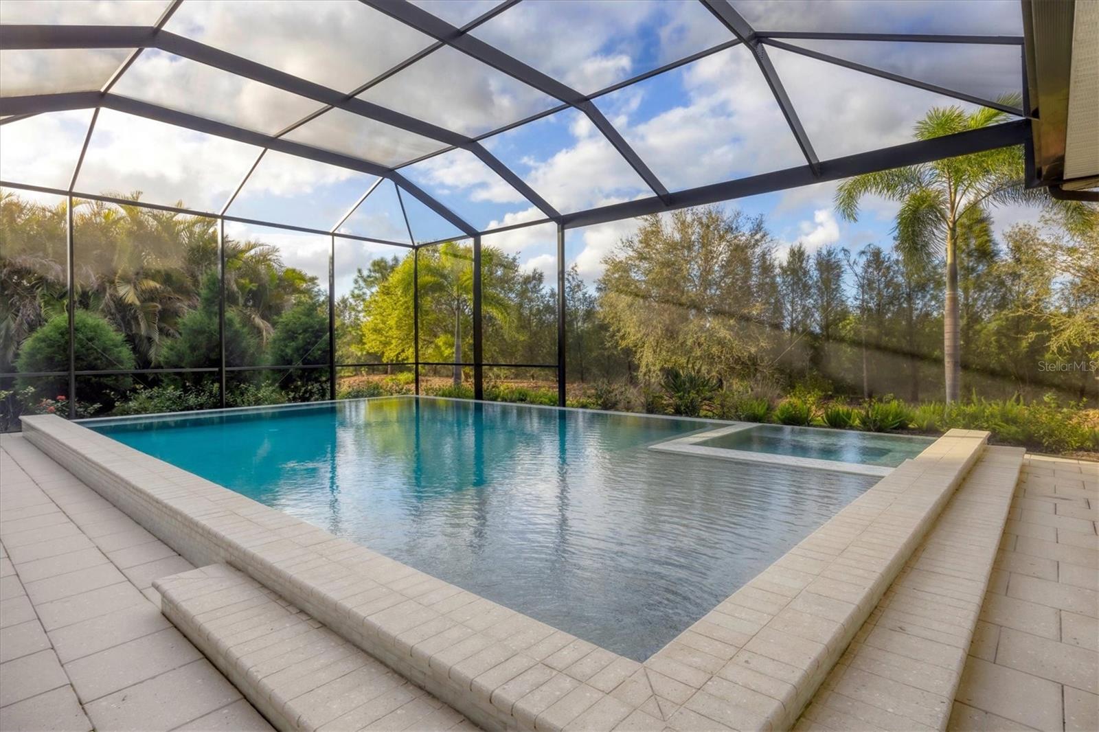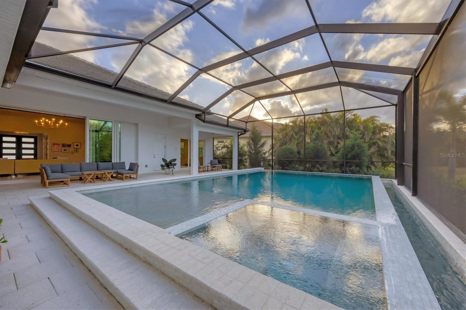 Perfectly situated on a quiet preserve in the exclusive gated enclave of Country Club East, this exceptional John Cannon residence showcases refined craftsmanship, modern luxury, and seamless indoor-outdoor living. Designed for both comfort and impact, the home features impact-rated windows and doors, a full-house generator, and an open layout that’s as functional as it is beautiful. Step through 10-foot iron and glass double doors into a dramatic great room with whitewashed European oak flooring, soaring 13-foot ceilings with chevron wood detail, and a striking natural gas fireplace framed by Basalt volcanic tile and reclaimed wood mantle. A custom Whisperkool wine wall holds up to 130 bottles, accented by a chevron Stickwood backdrop. The main foyer features a hidden closet for bags and shoes. The chef’s kitchen boasts Sub-Zero and Wolf appliances, a 6-burner range, built-in oven and microwave, quartz countertops, a prep island outfitted with pull-out drawers—two for spices—, a farmhouse sink and a standalone ice maker. A entertaining-sized island outside the kitchen features, Uline beverage and wine coolers, an additional microwave, and ample hidden storage. A spacious walk-in pantry is steps away and includes a built-in tall closet. The great room’s 10-foot sliders fold back into a disappearing corner and lead to the expansive lanai with a PebbleTec infinity-edge heated saltwater pool and spa, panoramic screen enclosure, Shell Lock pavers, and a fully outfitted summer kitchen with Alfresco grill, Trailwinds hood, True ice machine, Uline fridge, and Blanco sink. The private owner’s wing includes two walk-in closets, tray ceiling with crown molding, lanai access, and a spa-style bath with radiant heated floors and a steam shower. Two guest suites are positioned in separate wings—each with its own full bath and walk-in closet—one with a private entrance and drop zone, the other with pool bath access. Additional living spaces include a bonus room with 10-foot sliders as a second disappearing corner as well as a study/exercise room with 15-foot ceilings. The laundry room features abundant cabinet storage, designer tile, sink, and an additional 60 square feet of dedicated storage carved out behind two double doors. Adding even more value, the home is equipped with a whole-house water filtration system, designer lighting, automatic blinds, and an oversized 3-car garage. Every detail of this home has been thoughtfully curated for elevated living in one of Lakewood Ranch’s most prestigious communities.