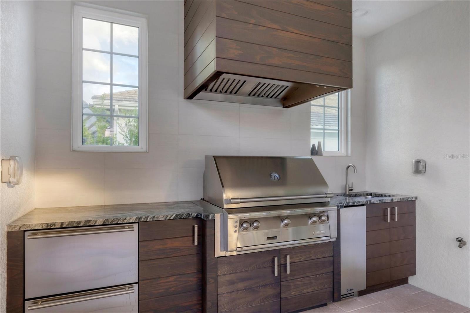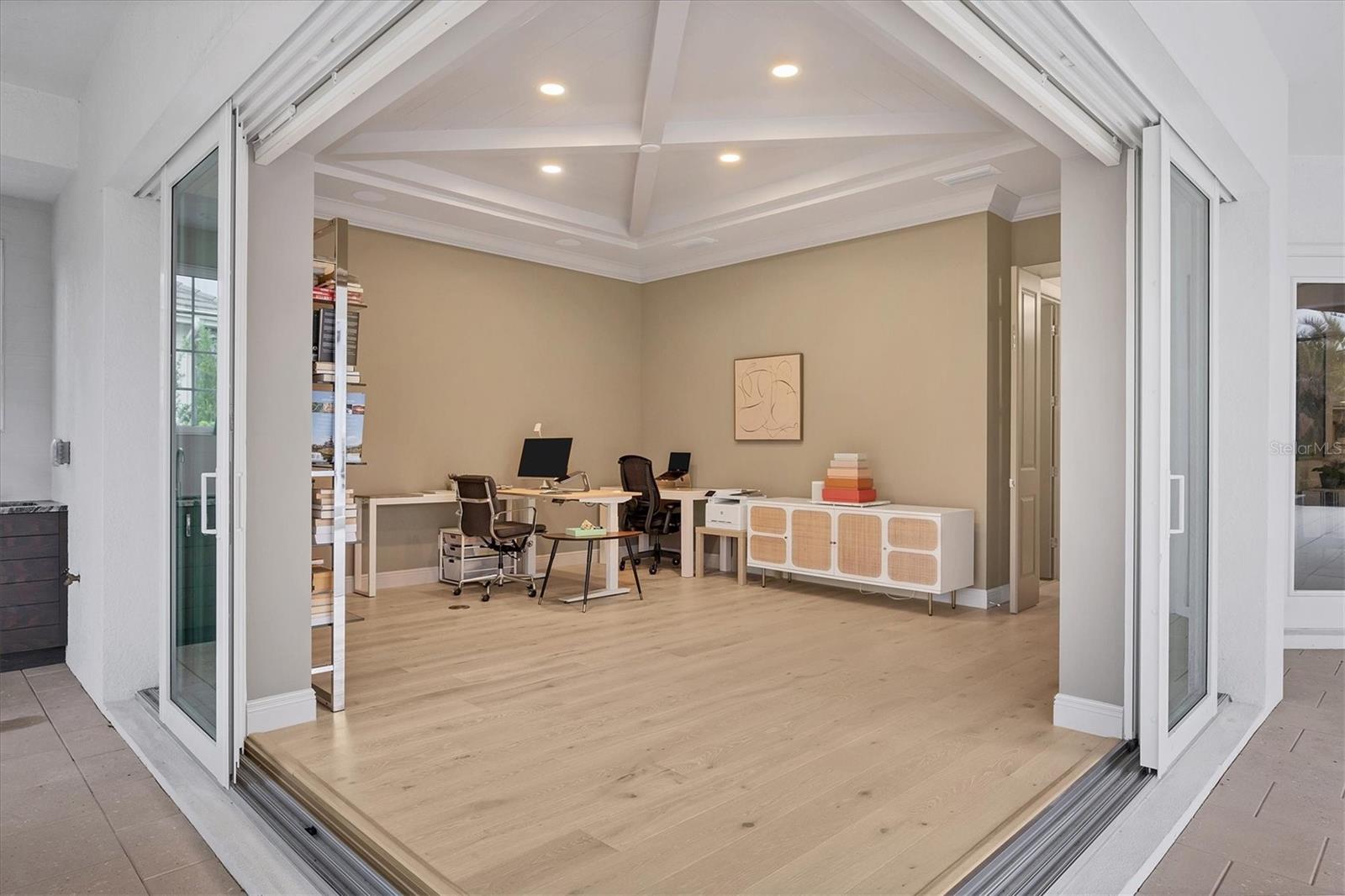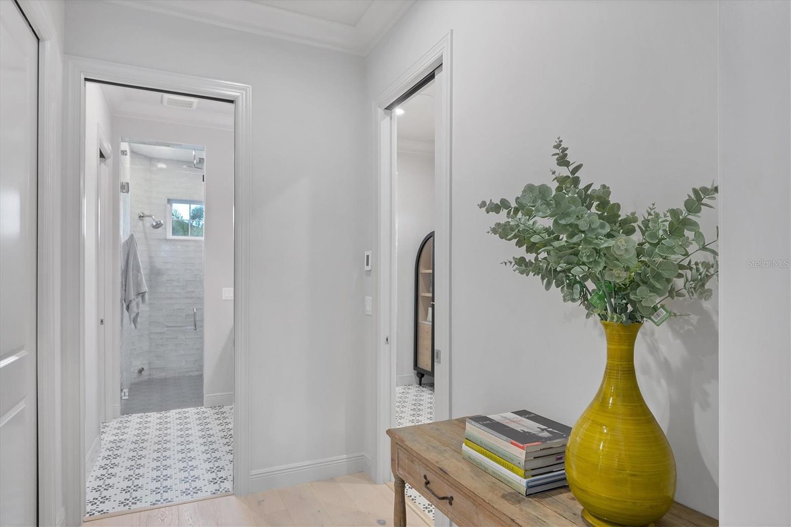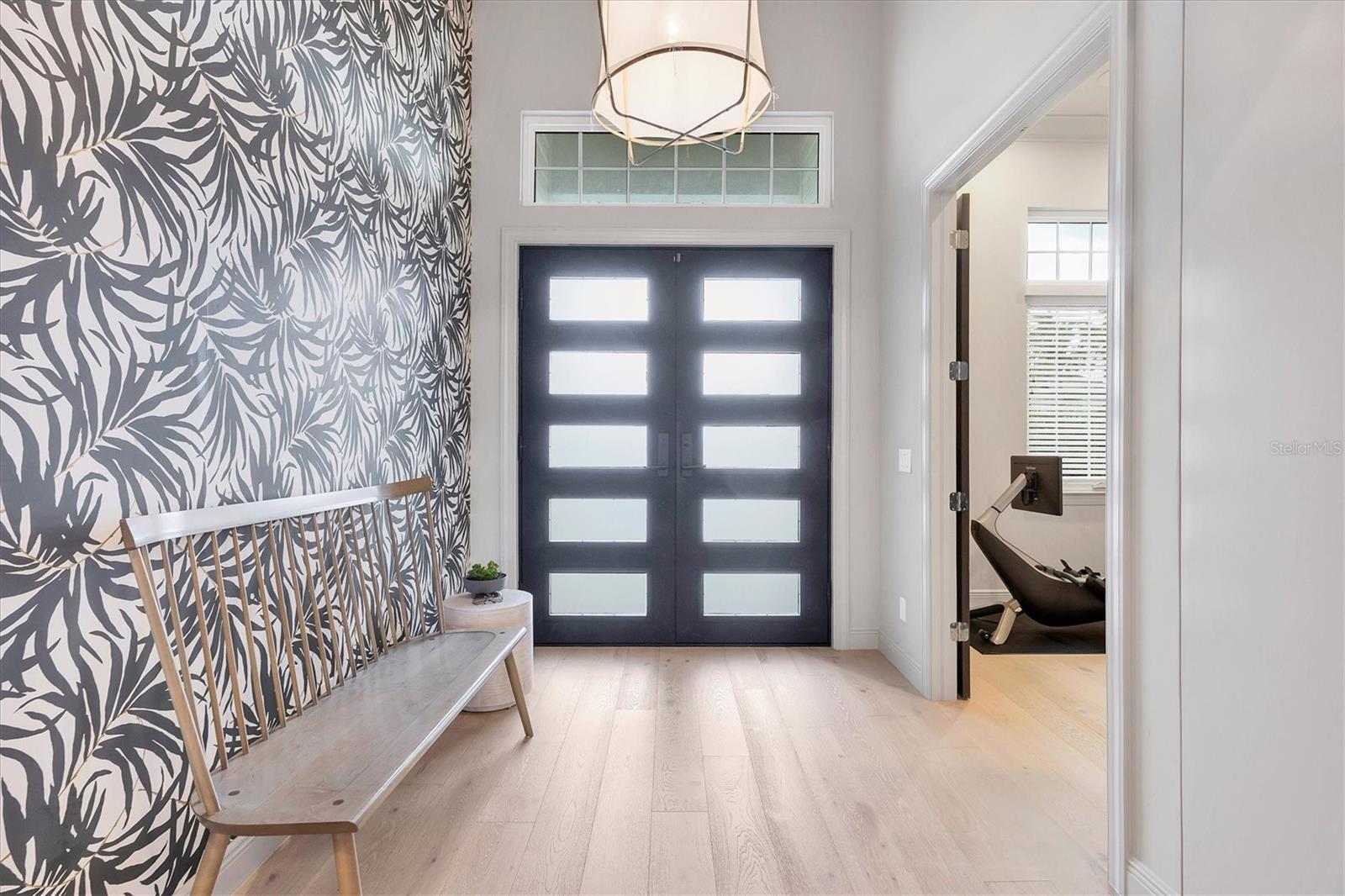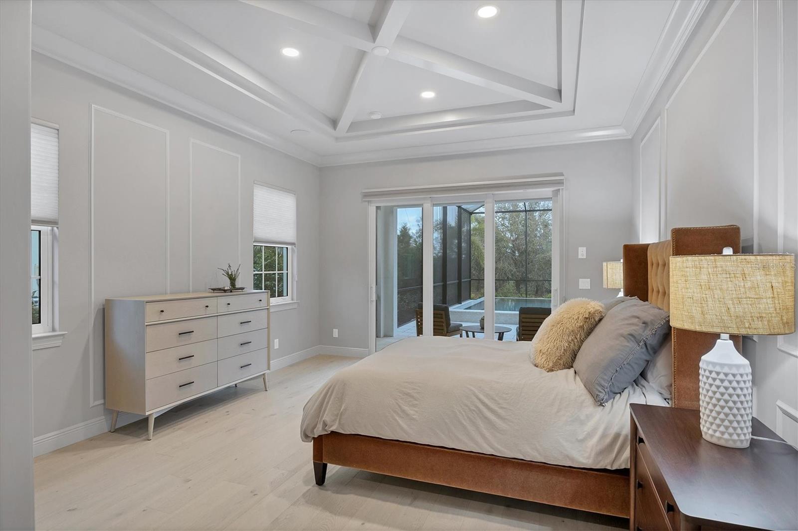 Perfectly situated on a quiet preserve in the exclusive gated enclave of Country Club East, this exceptional John Cannon residence showcases refined craftsmanship, modern luxury, and seamless indoor-outdoor living. Designed for both comfort and impact, the home features impact-rated windows and doors, a full-house generator, and an open layout that’s as functional as it is beautiful. Step through 10-foot iron and glass double doors into a dramatic great room with whitewashed European oak flooring, soaring 13-foot ceilings with chevron wood detail, and a striking natural gas fireplace framed by Basalt volcanic tile and reclaimed wood mantle. A custom Whisperkool wine wall holds up to 130 bottles, accented by a chevron Stickwood backdrop. The main foyer features a hidden closet for bags and shoes. The chef’s kitchen boasts Sub-Zero and Wolf appliances, a 6-burner range, built-in oven and microwave, quartz countertops, a prep island outfitted with pull-out drawers—two for spices—, a farmhouse sink and a standalone ice maker. A entertaining-sized island outside the kitchen features, Uline beverage and wine coolers, an additional microwave, and ample hidden storage. A spacious walk-in pantry is steps away and includes a built-in tall closet. The great room’s 10-foot sliders fold back into a disappearing corner and lead to the expansive lanai with a PebbleTec infinity-edge heated saltwater pool and spa, panoramic screen enclosure, Shell Lock pavers, and a fully outfitted summer kitchen with Alfresco grill, Trailwinds hood, True ice machine, Uline fridge, and Blanco sink. The private owner’s wing includes two walk-in closets, tray ceiling with crown molding, lanai access, and a spa-style bath with radiant heated floors and a steam shower. Two guest suites are positioned in separate wings—each with its own full bath and walk-in closet—one with a private entrance and drop zone, the other with pool bath access. Additional living spaces include a bonus room with 10-foot sliders as a second disappearing corner as well as a study/exercise room with 15-foot ceilings. The laundry room features abundant cabinet storage, designer tile, sink, and an additional 60 square feet of dedicated storage carved out behind two double doors. Adding even more value, the home is equipped with a whole-house water filtration system, designer lighting, automatic blinds, and an oversized 3-car garage. Every detail of this home has been thoughtfully curated for elevated living in one of Lakewood Ranch’s most prestigious communities.