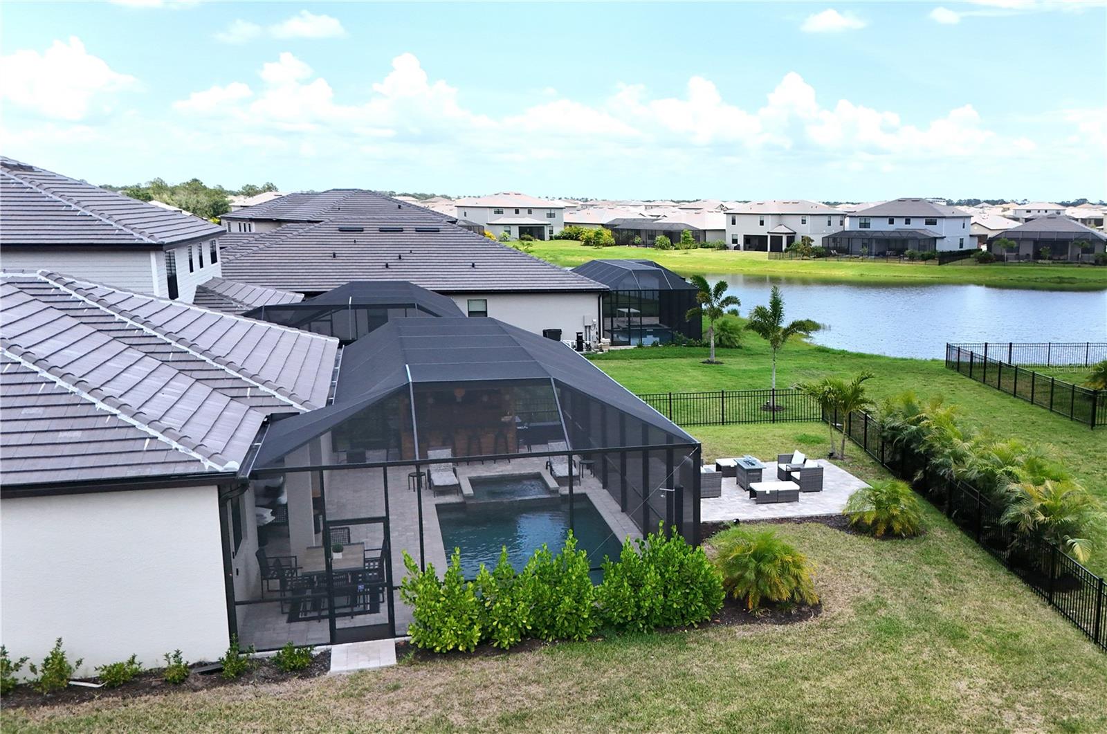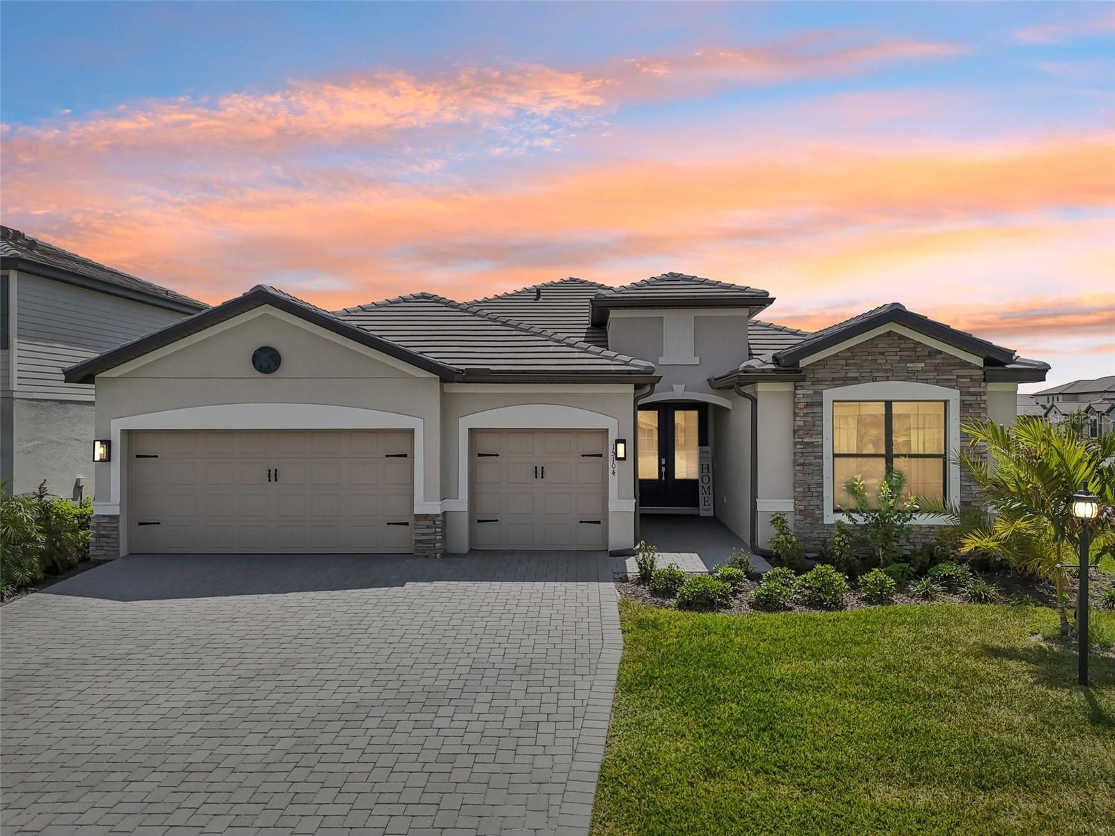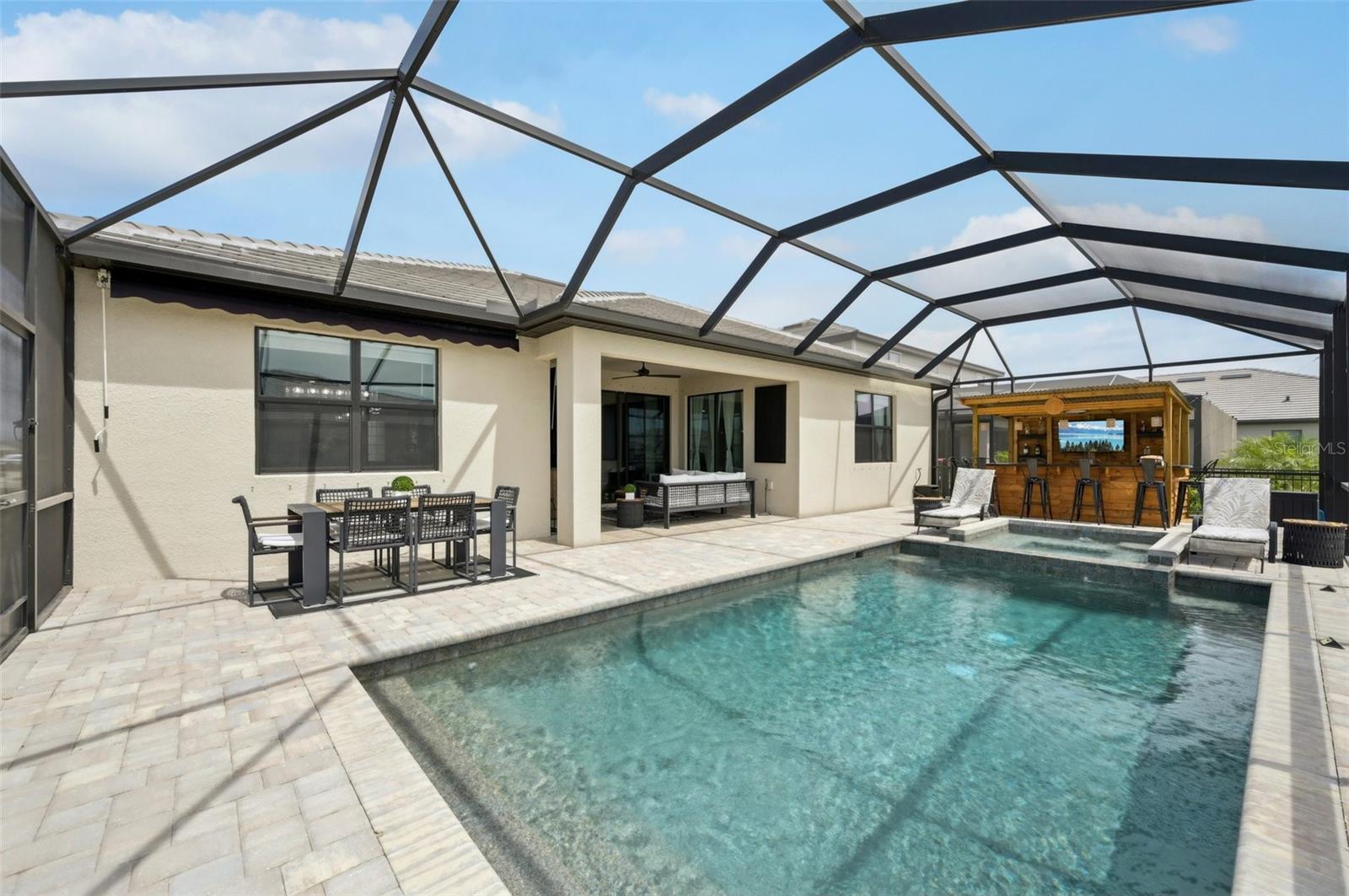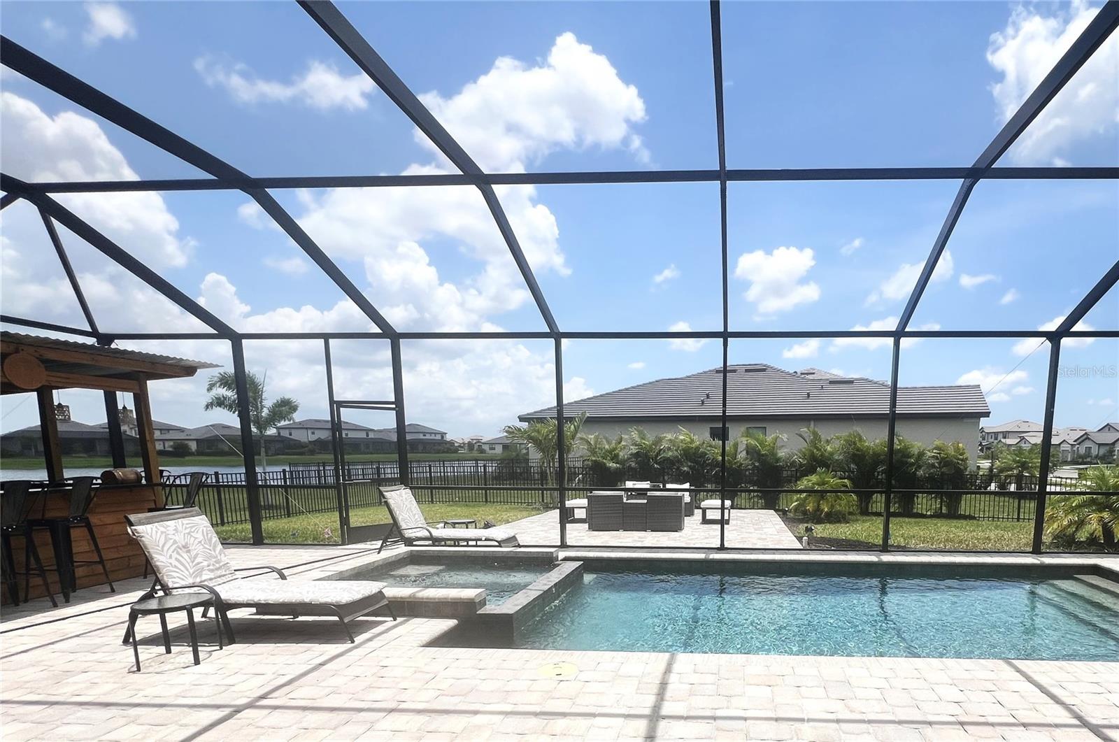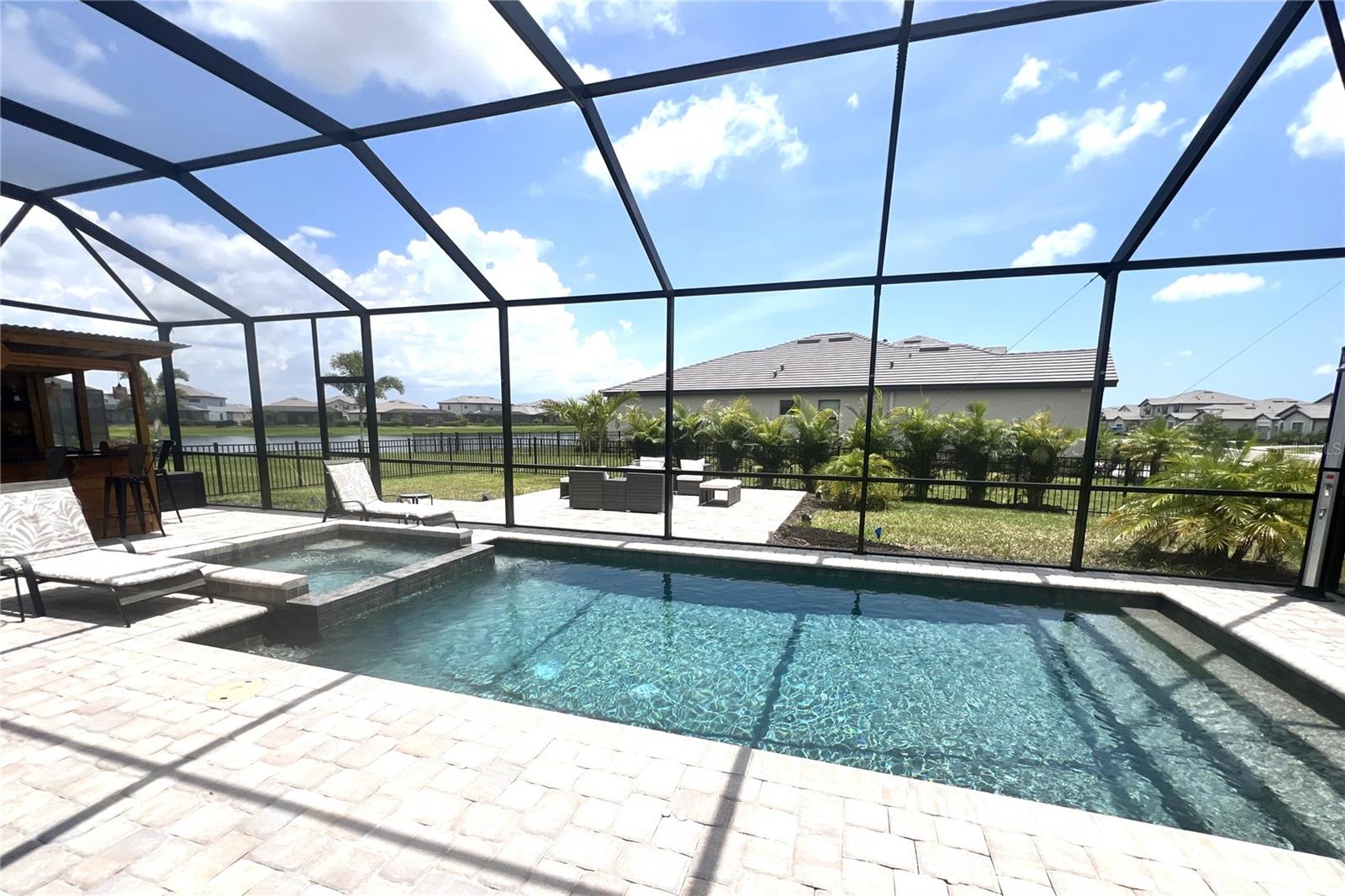 2024 Summerville Model | 3 Bed + Den | 3 Bath | 3-Car Garage | Pool & Spa | Oversized Lot. Beautifully upgraded and move-in ready, this newly built Summerville model in Lorraine Lakes at Lakewood Ranch is perfectly positioned on an oversized, fenced corner lot on a quiet cul-de-sac. This popular single-level floor plan features 3 bedrooms, 3 full baths, a den, and a 3-car garage, centered around a spacious open-concept great room, kitchen, and dining area—ideal for everyday living and entertaining. Upgrades include wood ceiling beams, a custom wood feature wall with a 100" electric fireplace, plank tile flooring throughout, barn doors on the den and laundry room, quartz countertops, tile backsplash, stainless steel appliances, single-bowl sink, touchless kitchen faucet, and designer hardware and lighting. The spacious primary suite offers serene water views, two custom built-in walk-in closets, and a spa-style bath with dual vanities and a large walk-in shower. Step outside to your private backyard oasis featuring a heated pool, spa, outdoor shower, covered lanai with seating and dining area, retractable awning, and an expanded paver patio beyond the screened enclosure—ideal for entertaining or relaxing. Full builder warranty through August 2025. Resort-style amenities at Lorraine Lakes include gated entry, lawn care, high-speed internet and cable, resort and lap pools, splash zone, clubhouse with tiki bar and restaurant, state-of-the-art fitness center, indoor basketball and volleyball courts, arcade, tennis and pickleball courts, putting green, and more. Located in Lakewood Ranch, a #1 multi-generational community in the U.S., you'll enjoy top-rated schools, shopping, dining, golf, parks, and events just minutes away. This home offers the perfect blend of luxury, convenience, and vibrant community living. Furniture package pricing available upon request. Outdoor tiki bar and drapery do not convey. Flexible closing date with option for short-term seller rent-back ideal for buyers desiring a summer move in date.
