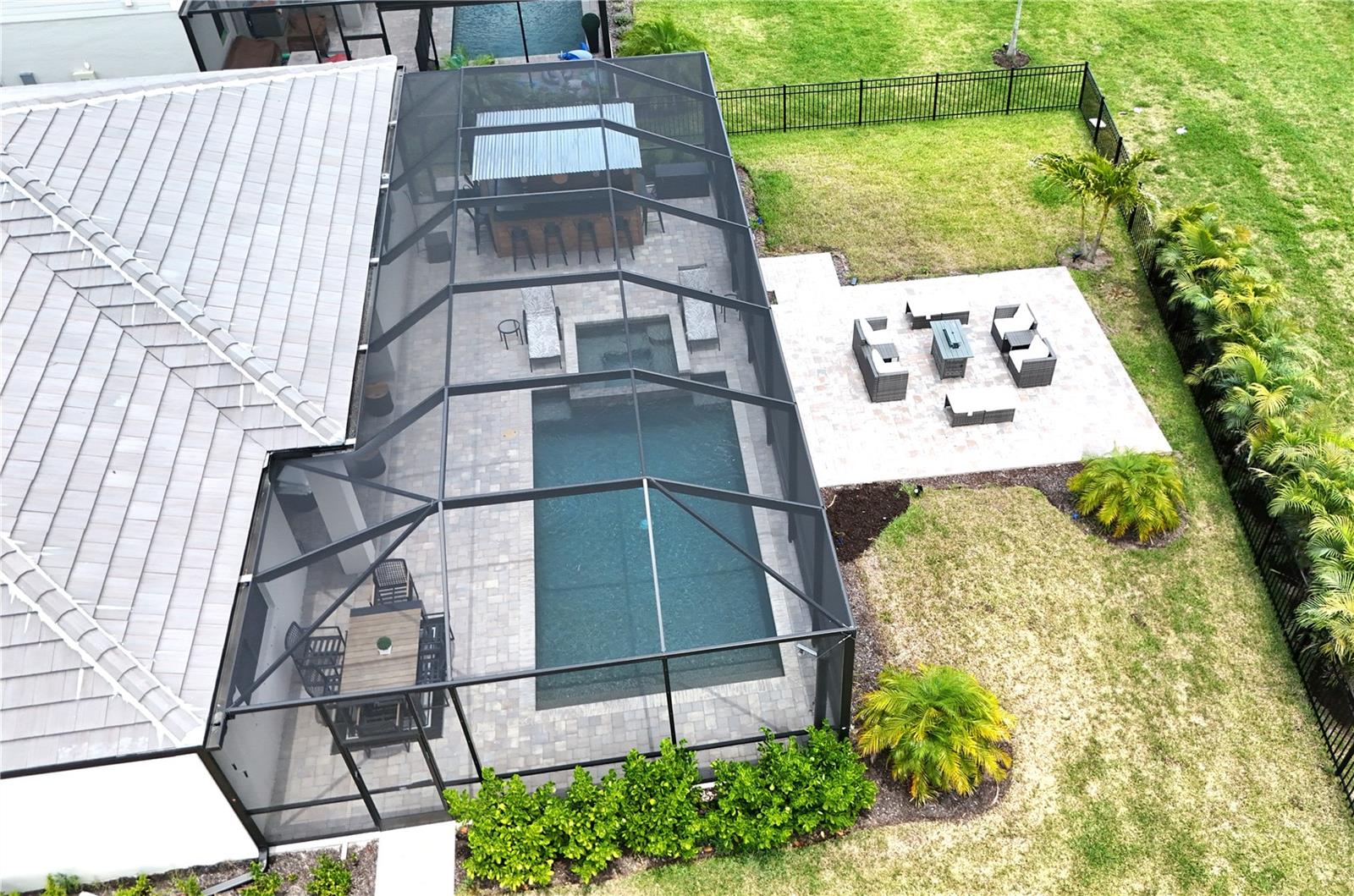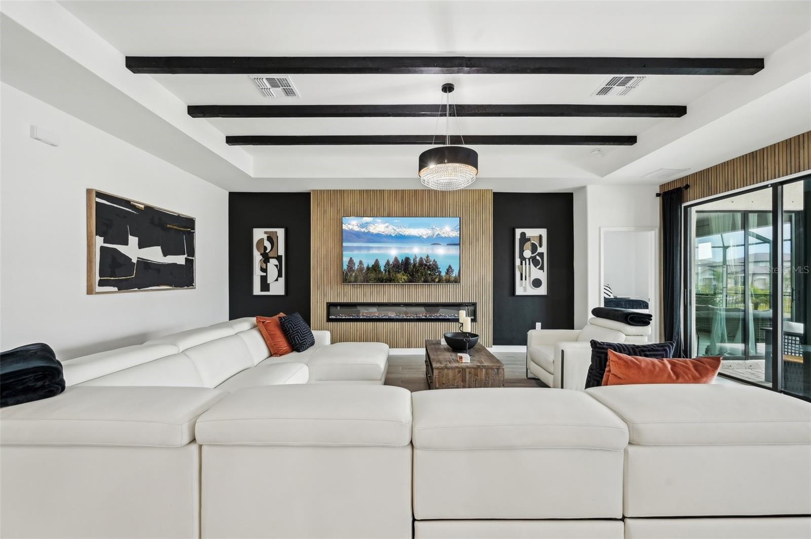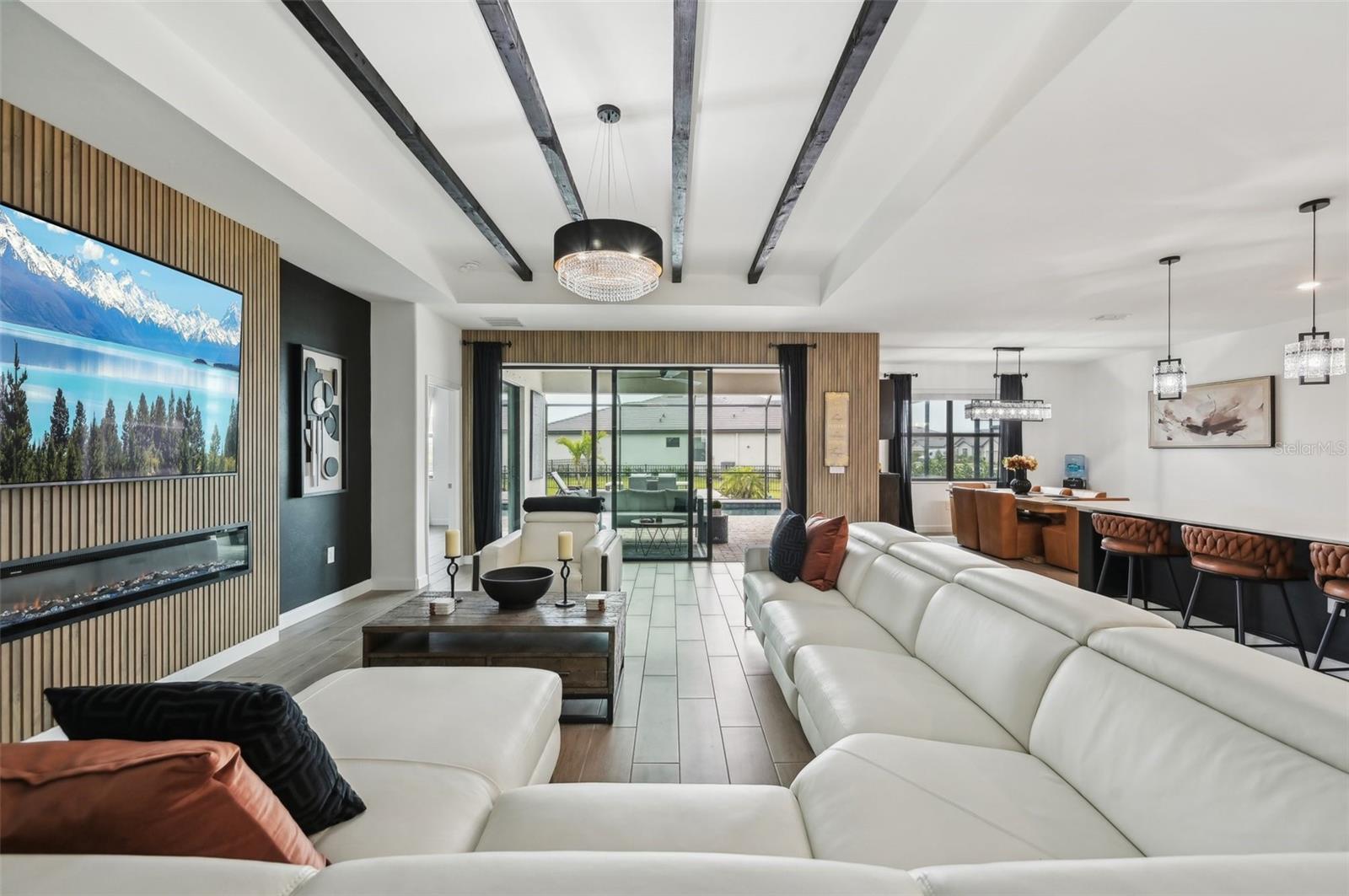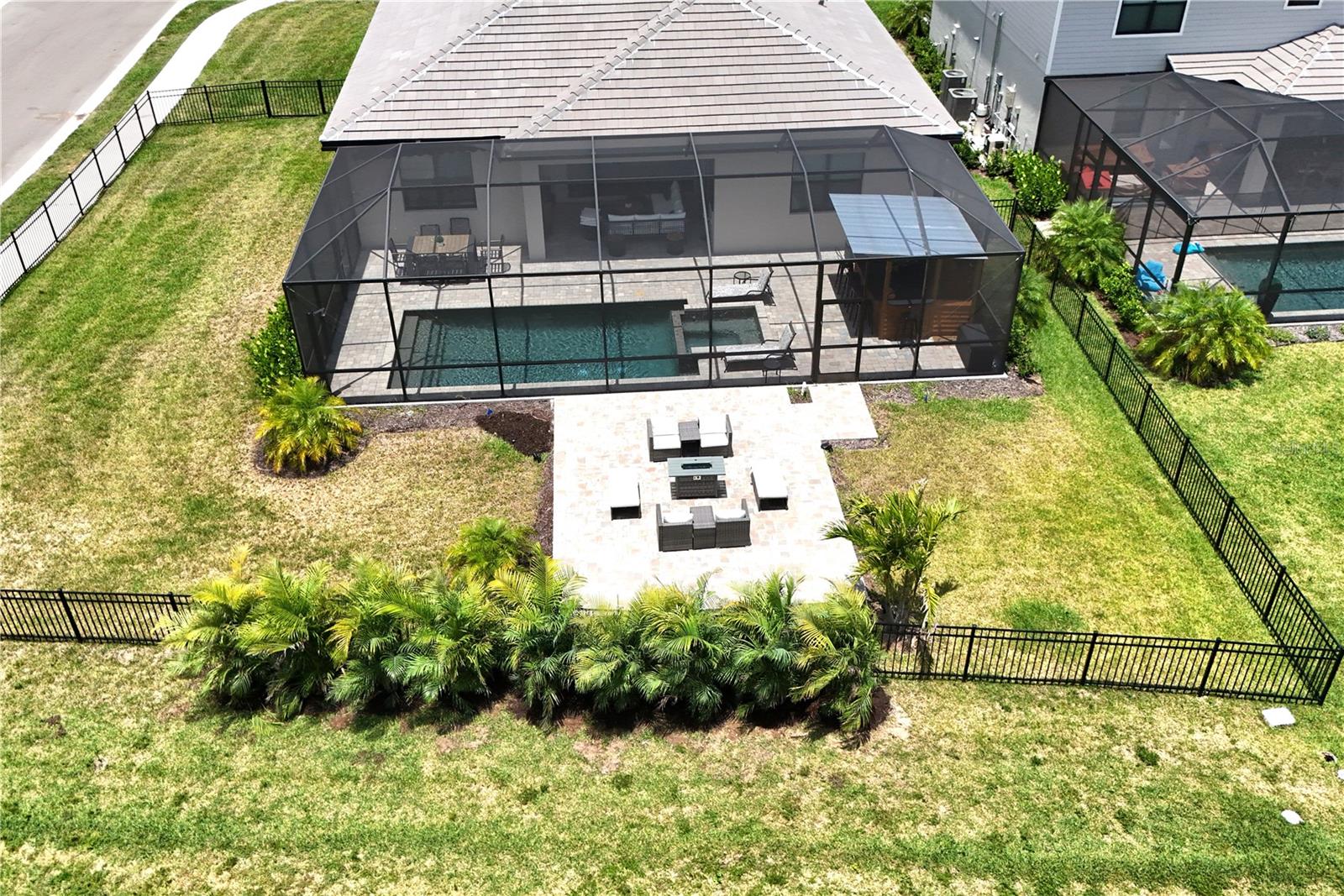 2024 Summerville Model | 3 Bed + Den | 3 Bath | 3-Car Garage | Pool & Spa | Oversized Lot. Beautifully upgraded and move-in ready, this newly built Summerville model in Lorraine Lakes at Lakewood Ranch is perfectly positioned on an oversized, fenced corner lot on a quiet cul-de-sac. This popular single-level floor plan features 3 bedrooms, 3 full baths, a den, and a 3-car garage, centered around a spacious open-concept great room, kitchen, and dining area—ideal for everyday living and entertaining. Upgrades include wood ceiling beams, a custom wood feature wall with a 100" electric fireplace, plank tile flooring throughout, barn doors on the den and laundry room, quartz countertops, tile backsplash, stainless steel appliances, single-bowl sink, touchless kitchen faucet, and designer hardware and lighting. The spacious primary suite offers serene water views, two custom built-in walk-in closets, and a spa-style bath with dual vanities and a large walk-in shower. Step outside to your private backyard oasis featuring a heated pool, spa, outdoor shower, covered lanai with seating and dining area, retractable awning, and an expanded paver patio beyond the screened enclosure—ideal for entertaining or relaxing. Full builder warranty through August 2025. Resort-style amenities at Lorraine Lakes include gated entry, lawn care, high-speed internet and cable, resort and lap pools, splash zone, clubhouse with tiki bar and restaurant, state-of-the-art fitness center, indoor basketball and volleyball courts, arcade, tennis and pickleball courts, putting green, and more. Located in Lakewood Ranch, a #1 multi-generational community in the U.S., you'll enjoy top-rated schools, shopping, dining, golf, parks, and events just minutes away. This home offers the perfect blend of luxury, convenience, and vibrant community living. Furniture package pricing available upon request. Outdoor tiki bar and drapery do not convey. Flexible closing date with option for short-term seller rent-back ideal for buyers desiring a summer move in date.
