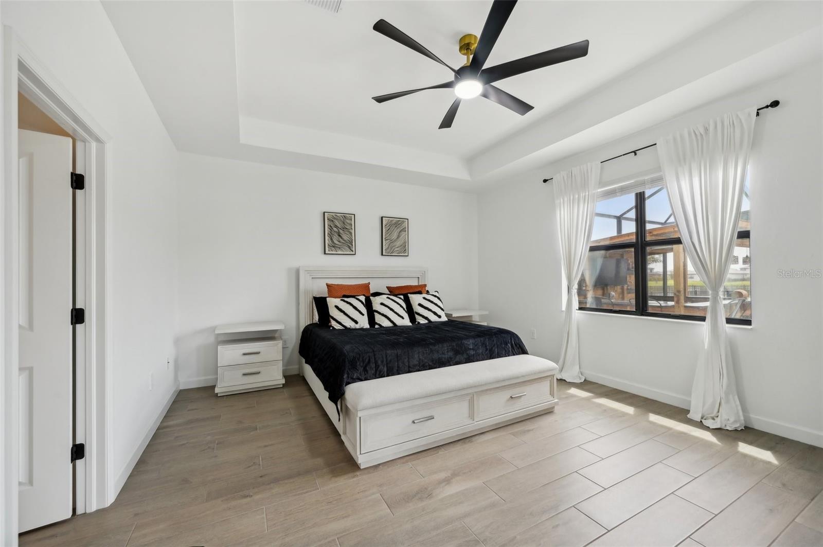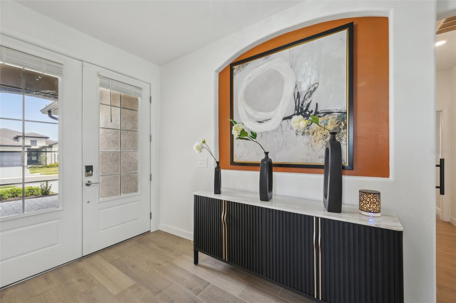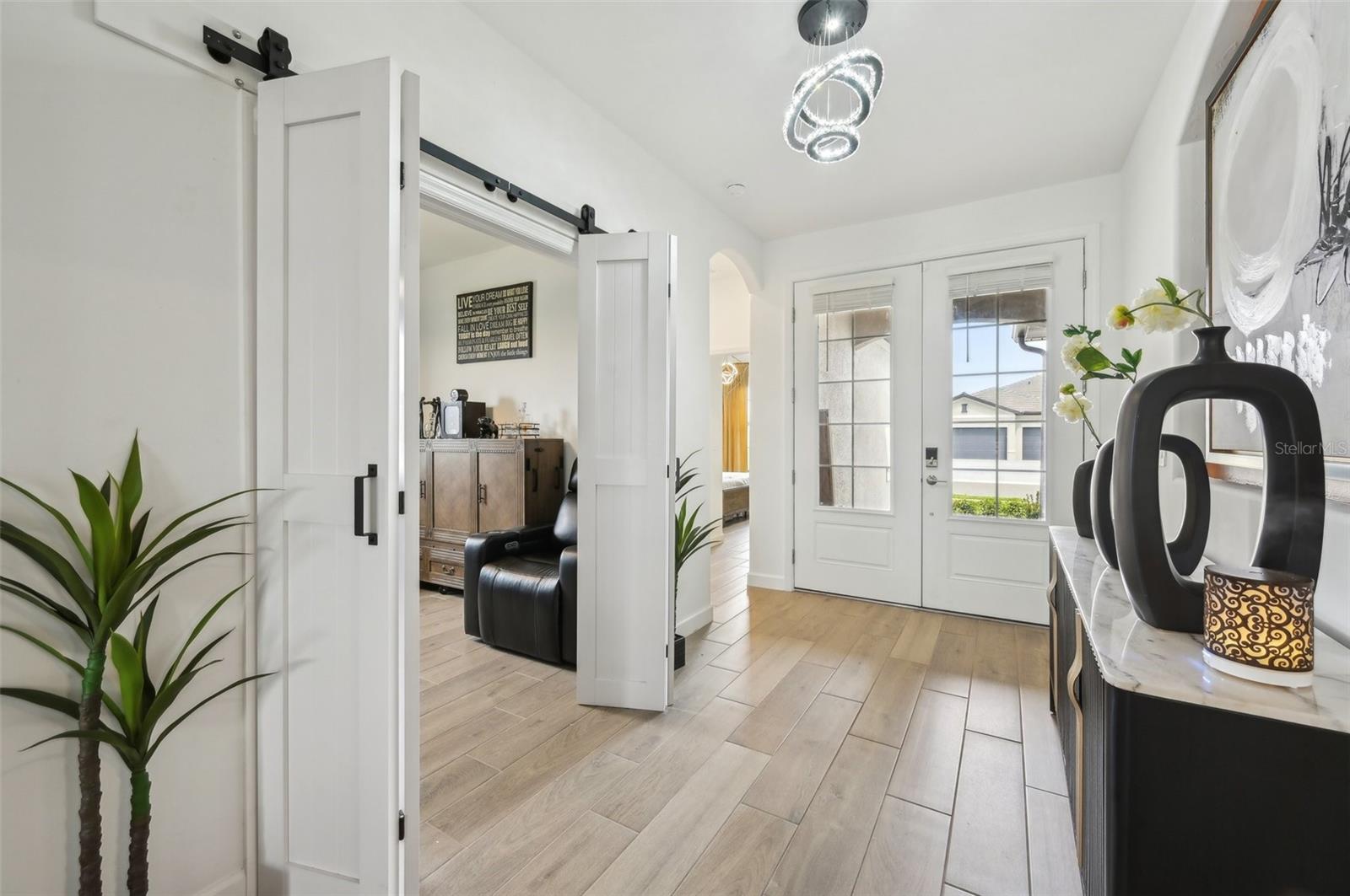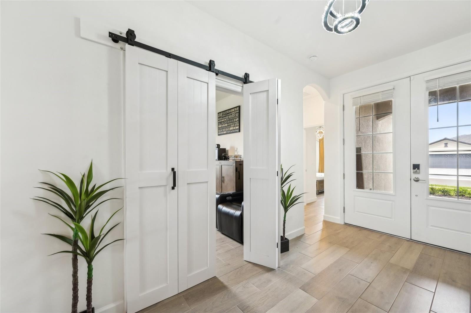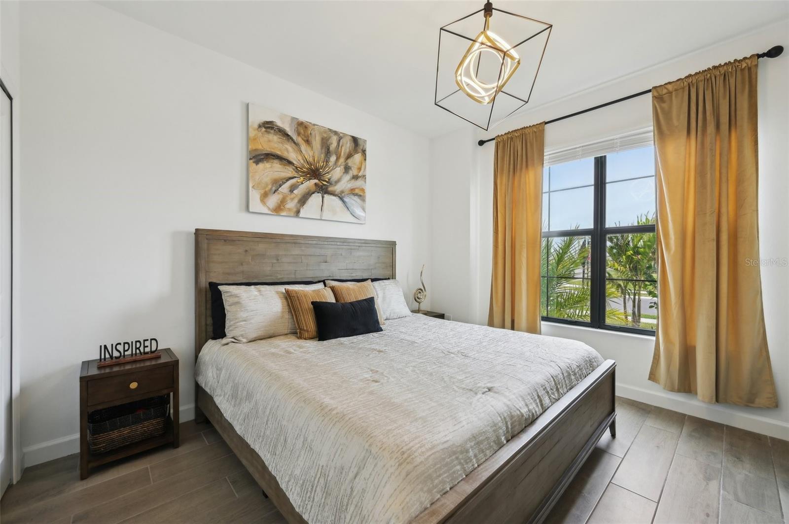 2024 Summerville Model | 3 Bed + Den | 3 Bath | 3-Car Garage | Pool & Spa | Oversized Lot. Beautifully upgraded and move-in ready, this newly built Summerville model in Lorraine Lakes at Lakewood Ranch is perfectly positioned on an oversized, fenced corner lot on a quiet cul-de-sac. This popular single-level floor plan features 3 bedrooms, 3 full baths, a den, and a 3-car garage, centered around a spacious open-concept great room, kitchen, and dining area—ideal for everyday living and entertaining. Upgrades include wood ceiling beams, a custom wood feature wall with a 100" electric fireplace, plank tile flooring throughout, barn doors on the den and laundry room, quartz countertops, tile backsplash, stainless steel appliances, single-bowl sink, touchless kitchen faucet, and designer hardware and lighting. The spacious primary suite offers serene water views, two custom built-in walk-in closets, and a spa-style bath with dual vanities and a large walk-in shower. Step outside to your private backyard oasis featuring a heated pool, spa, outdoor shower, covered lanai with seating and dining area, retractable awning, and an expanded paver patio beyond the screened enclosure—ideal for entertaining or relaxing. Full builder warranty through August 2025. Resort-style amenities at Lorraine Lakes include gated entry, lawn care, high-speed internet and cable, resort and lap pools, splash zone, clubhouse with tiki bar and restaurant, state-of-the-art fitness center, indoor basketball and volleyball courts, arcade, tennis and pickleball courts, putting green, and more. Located in Lakewood Ranch, a #1 multi-generational community in the U.S., you'll enjoy top-rated schools, shopping, dining, golf, parks, and events just minutes away. This home offers the perfect blend of luxury, convenience, and vibrant community living. Furniture package pricing available upon request. Outdoor tiki bar and drapery do not convey. Flexible closing date with option for short-term seller rent-back ideal for buyers desiring a summer move in date.