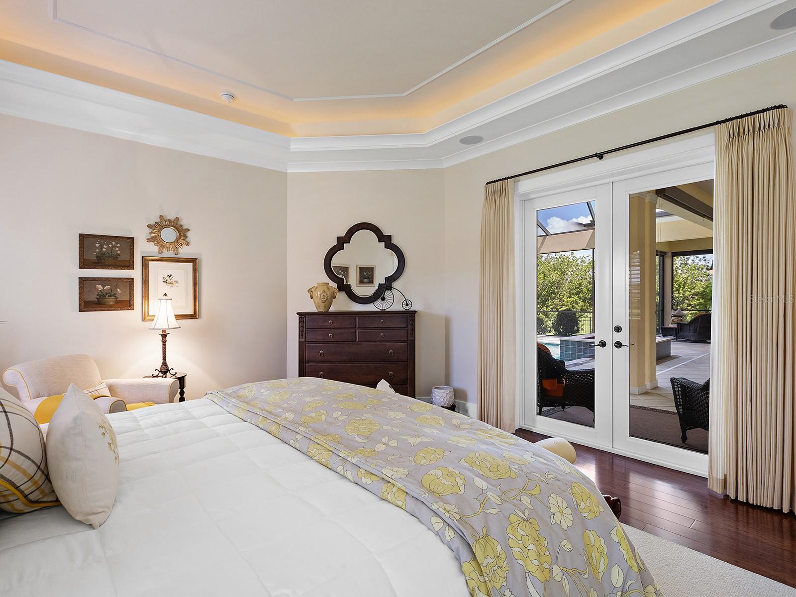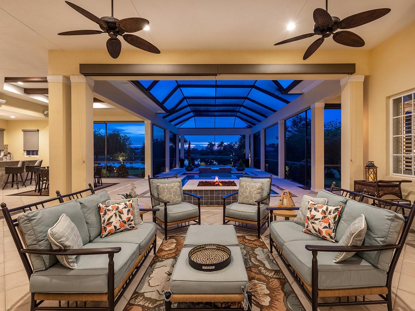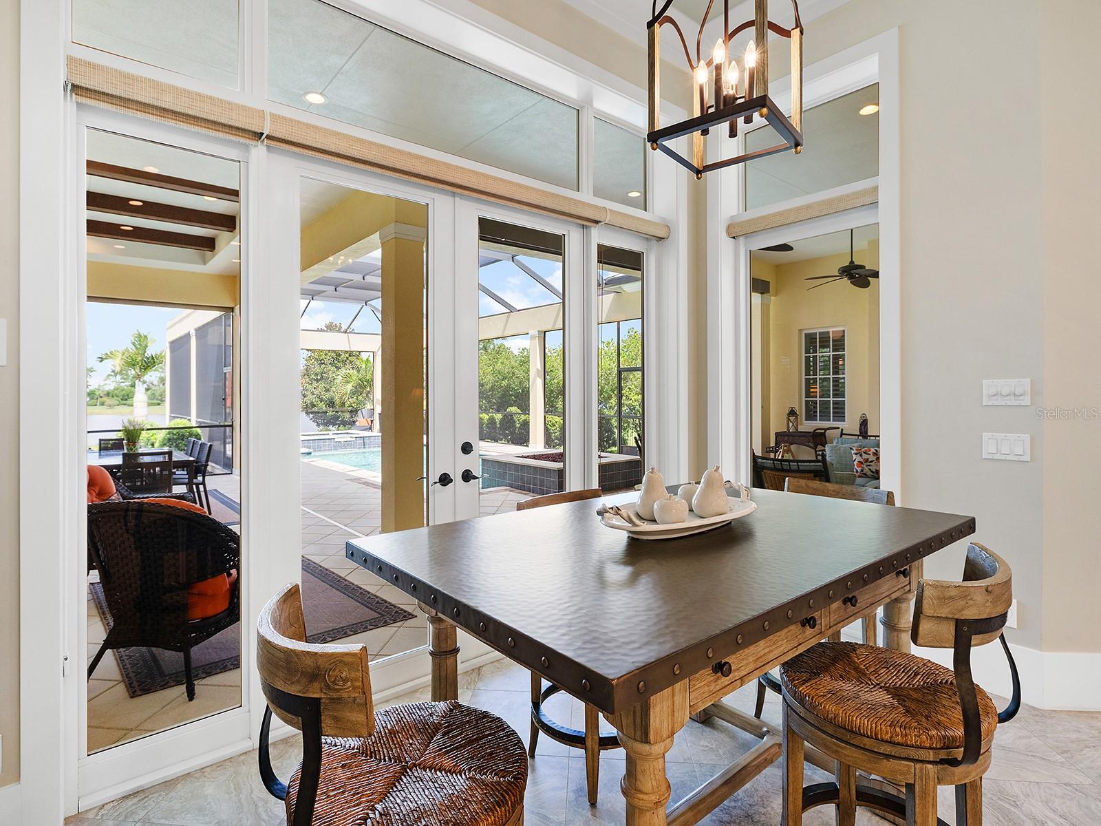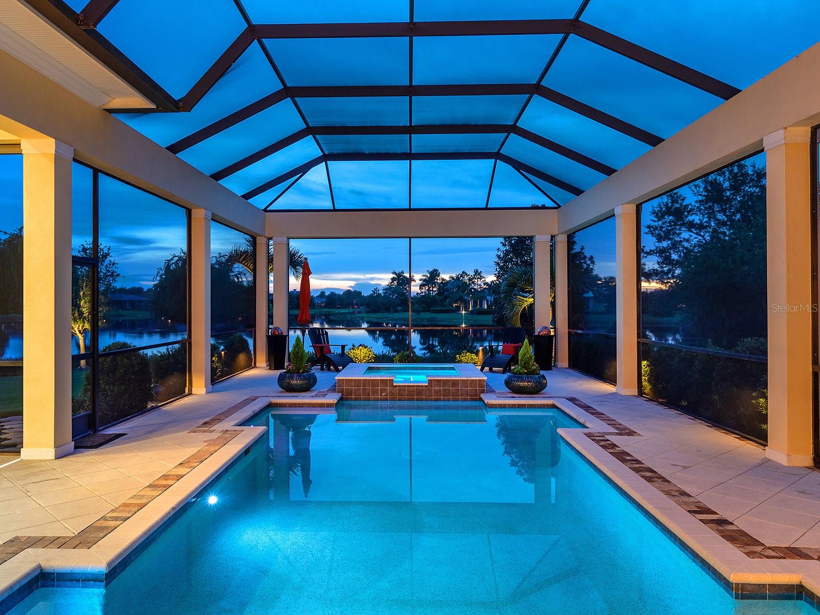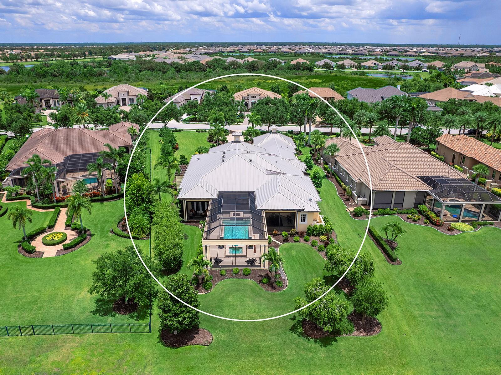 With stunning sunset views over the sparkling lake, this picture-perfect home in The Lake Club is truly a rare find in all of Lakewood Ranch! Built in 2016 is this completely custom home built by award-winning Nutter Custom Construction. Every detail in this residence has been meticulously selected for a luxurious yet functional lifestyle. Situated on 0.76 acres, this spacious lot affords you additional privacy, manicured landscaping, and over 80 feet of lakefront. In addition to the opulent upgrades inside, this home is outfitted with a rare METAL ROOF that offers up to 50 years of life, and IMPACT windows and doors throughout. From the spacious paver driveway surrounded by beautiful landscaping, you’re welcomed home to a charming front porch entry with Caribbean box railing and mahogany front door. The foyer invites you in with volume ceiling and custom painted wall to the open floor plan. The grand great room is truly the heart of the home and showcases vaulted ceilings with hand-stained wood beams, cozy electric fireplace, engineered hardwood flooring, custom built-in shelving, solar tubes for an abundance of natural light, and impact rated French doors to the lanai. Outdoors you’ll be immediately impressed with the western views of the lake, spacious gathering areas, custom ceilings, and colonnade screen enclosure. The heated pool and spa offers the ideal place to gather at one end around the gas firepit; or relax in the spa at the other end lakeside. Enjoy dinners alfresco from the outdoor kitchen expertly equipped with a Lynx grill, beverage refrigerator, and built-in ice chest cooler. Inside the chef will adore preparing meals in the gourmet kitchen complete with solid wood cabinetry including appliance bay and wine rack, quartz counters, central island with seating, and walk-in pantry with shelving. The high-end appliance suite includes a Jenn-Air paneled refrigerator, Wolf built-in microwave and wall oven, KitchenAid warming drawer, Miele dishwasher, and Bosch induction cooktop with flex bridge burners that make cooking a breeze. Dine in the formal dining room with designer chandelier, or in the casual dinette with built-in cabinetry. When you’re ready to end the day in relaxation, retreat to the primary suite with vaulted ceiling, dual custom walk-in closets, separate seating area, and private lanai with remote-controlled shades. Your primary bath is a sanctuary with dual split vanities, limestone tile, walk-in shower with bench, soaking tub, and private courtyard. Guests will enjoy their own luxe accommodations in the second primary bedroom with private en-suite bathroom and walk-in closet that is ideal for long-term guests or could be used as a bonus room; or the two additional guest bedrooms with walk-in closets and jack & jill bathroom. Rounding out this one-of-a-kind residence is a study with custom built-in shelving and desk, laundry room with plentiful storage, mudroom entry with 3 closets, and guest powder bathroom. Don’t forget about the oversized 3-car garage with fans to keep cool, custom storage cabinetry and workbench, and air-conditioned Florida basement perfect for storage. The Lake Club is an exclusive premier, gated community with a Grande Clubhouse, restaurant, pool, tennis, pickleball and more.