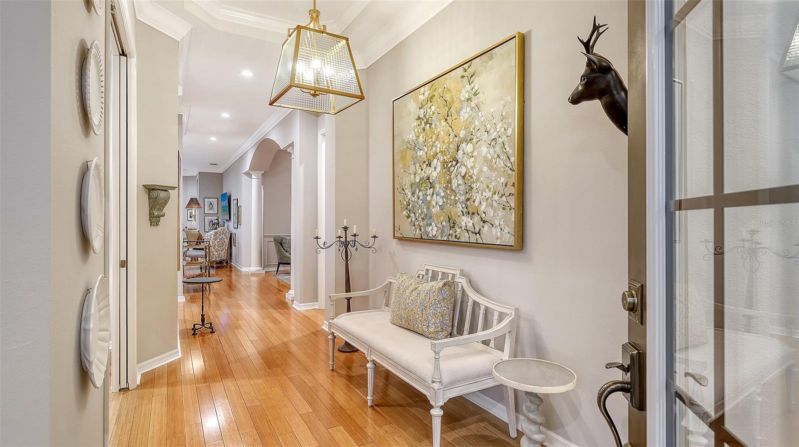 A rare opportunity behind the gates of Lakewood Ranch Country Club, this beautifully reimagined Neal Custom home offers a refined yet effortless lifestyle from the moment you arrive. Tucked within a private courtyard setting, a garden-lined path leads to the entrance, creating a sense of quiet privacy while still being moments from everything Lakewood Ranch has to offer. Inside, natural light fills the open, airy layout, enhanced by soaring ceilings, crown molding, and plantation shutters that add timeless elegance throughout. Fresh interior paint and thoughtfully selected finishes create a warm, inviting atmosphere while maintaining the home’s classic character. Designed for both everyday living and entertaining, the home offers a desirable three-bedroom split layout, generous living spaces, and a gracious dining room that complements the home’s seamless flow. The third bedroom does not currently have a closet, and seller is willing to provide a credit toward closet installation, creating a simple opportunity to tailor the space to your needs. At the heart of the home, the beautifully updated kitchen blends timeless design with modern convenience, featuring Café appliances, quartz countertops, refaced cabinetry, and elegant marble-inspired details—all opening naturally to the main living areas. The living experience extends outdoors, where an expansive covered terrace captures sweeping views of the golf course, lake, and preserve. This peaceful setting offers the perfect backdrop for morning coffee, evening gatherings, or simply enjoying Florida’s natural beauty, with additional yard space along the water enhancing both privacy and livability. Over $100,000 in thoughtful improvements ensure the home lives as beautifully as it presents, including updated bathrooms and new tile throughout key areas. The existing bamboo wood flooring has been intentionally preserved for its durability and warmth, adding character to the home’s refined interior, while a whole-home water purification system further enhances everyday living. Major updates include TRANE A/C (2021), gas water heater (2022), impact glass windows (2018), and a full interior refresh in 2025 with new appliances and washer/dryer—providing true peace of mind. Located within the intimate Presidio enclave, residents enjoy a true lock-and-leave lifestyle with low HOA fees covering complete grounds maintenance, along with access to a private heated pool, spa, and clubhouse just steps away. Ideally positioned near Waterside, Lakewood Ranch Main Street, UTC, Sarasota-Bradenton International Airport, downtown Sarasota, and the Gulf’s renowned beaches, this home also offers optional Country Club membership with access to golf, tennis, fitness, and a vibrant social lifestyle. Few homes combine this level of privacy, views, updates, and low-maintenance living within Lakewood Ranch Country Club—presenting an exceptional opportunity in one of the area’s most sought-after communities. ***Please note that the Lakewood Ranch CDD is included in the property taxes. (For easiest access, please enter through the main security gate at University Parkway and Legacy Boulevard, as GPS may direct to resident-only entrances.)