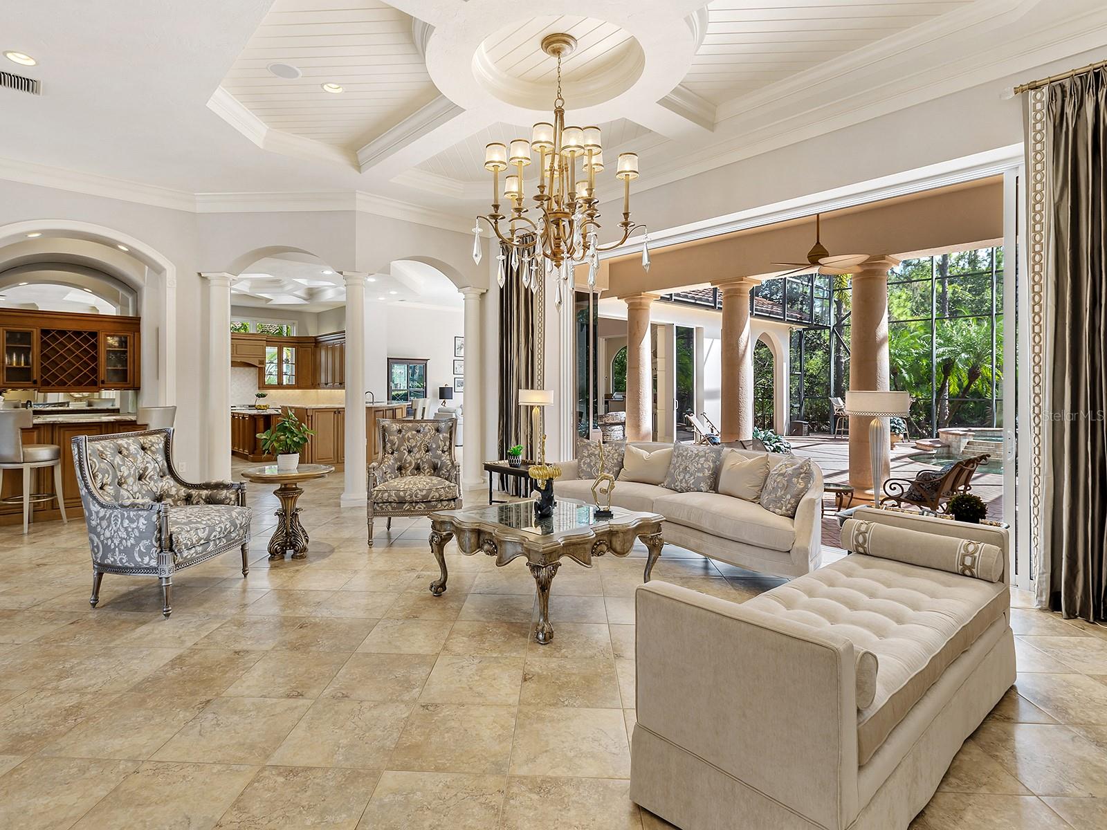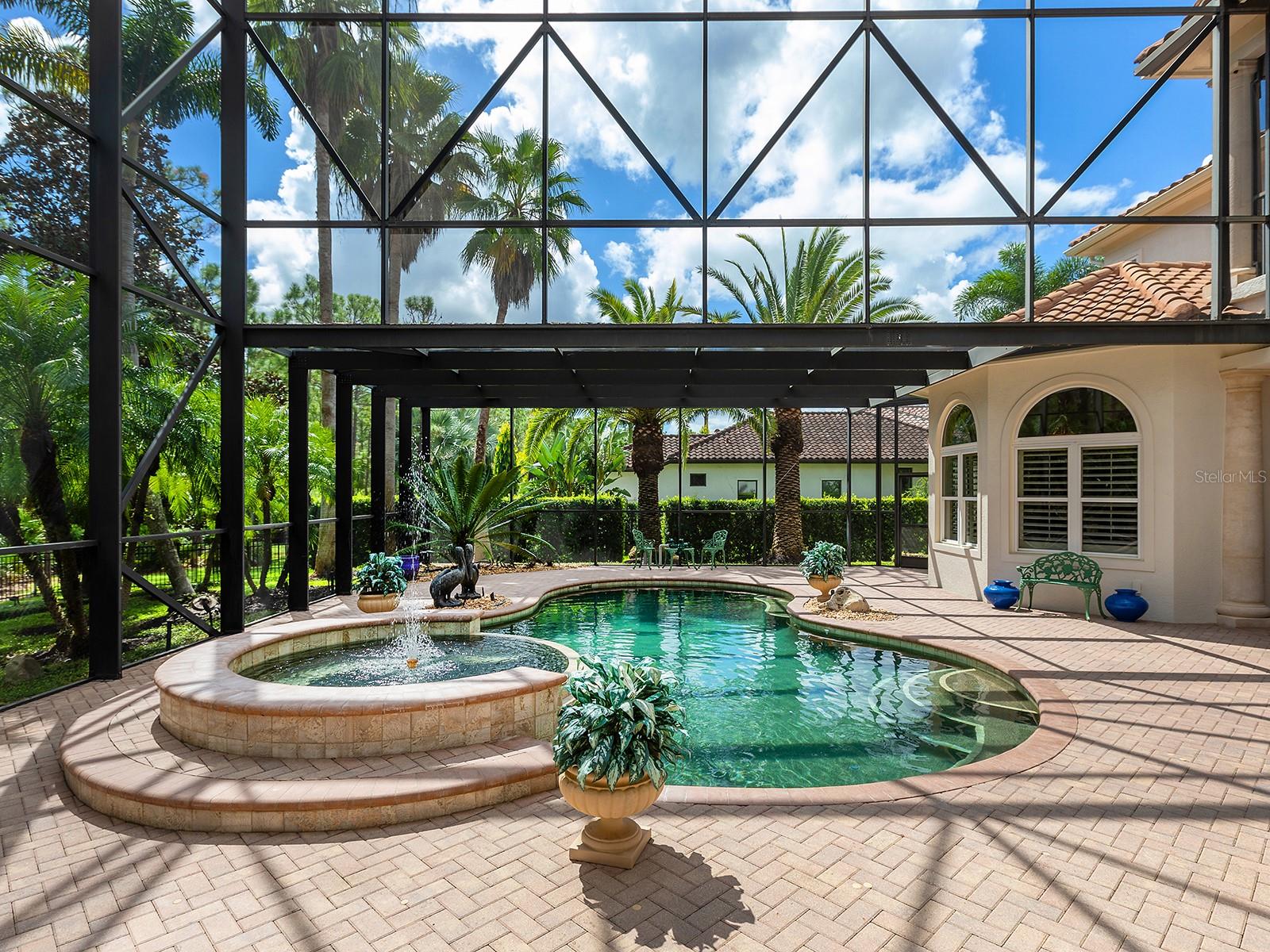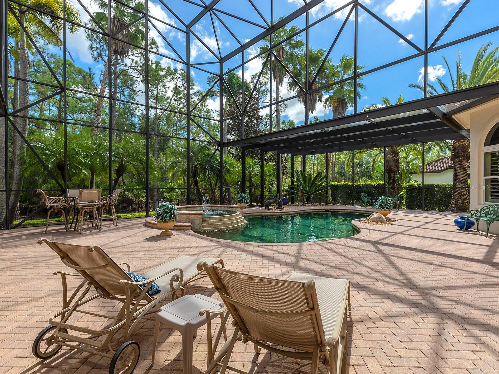 Built by Pruett Homes, this timeless estate embodies exceptional craftsmanship and thoughtful design, offering more than 7,000 square feet of living space on a beautifully landscaped 0.80-acre homesite in The Concession. A circular paver drive with a landscaped island and a barrel tile roof set a grand tone, while a welcoming front porch with stately columns leads to the double glass entry doors. Inside, architectural details include crown moldings, plantation shutters, oversized tile flooring, and soaring ceilings that enhance the home’s open, elegant aesthetic. The foyer introduces a refined entry with column accents and an art niche leading to the formal living and dining rooms. The living room centers on a gorgeous fireplace flanked by built-in shelving and opens through four-panel pocketing sliders to the lanai. A nearby wet bar features dolomite countertops with seating, wine storage, glass cabinetry, and a wine cooler—ideal for entertaining. The dining room showcases a tray ceiling with beams, designer wallpaper, and large picture windows. The enormous kitchen is perfectly designed for cooking and entertaining, highlighted by GE Monogram appliances, including a six-burner gas range with griddle, dual ovens, and a professional-grade refrigerator/freezer. Dolomite counters with bar seating, a center island, custom solid-wood cabinetry, a mother-of-pearl-accented backsplash, and an expansive walk-in pantry combine beauty and function. A breakfast nook with an aquarium window connects seamlessly to the family room, which opens fully to the lanai through dual pocketing sliders. A dedicated office with engineered wood flooring, crown molding, and surround sound provides a quiet workspace. Additional main-level spaces include a laundry room with abundant cabinetry, GE washer and dryer, and folding station, plus a half bath and a pool bath with custom tile finishes. The generous primary suite is privately positioned on the first floor, featuring engineered wood floors, a spacious, elevated seating area overlooking the pool, two oversized walk-in closets with wooden storage, and a spa-inspired bath with a jetted tub, frameless shower, dual vanities, and a makeup station. Upstairs, three expansive guest suites offer walk-in closets, plantation shutters, and en-suite or shared baths with custom tilework. The upper level also includes a spacious game and bonus room with a wet bar, granite counters, refrigerator, and microwave, plus a theater that seats 18 with tiered leather seating and a built-in bar. A large, covered terrace overlooks the pool and lanai, and an additional half bath serves the entertainment area. Outdoor living is equally impressive with a two-story screened lanai, heated saltwater pool and elevated spa with a cascading water feature, an outdoor kitchen with Stirling grill, fridge, sink, and seating, plus multiple covered lounging and dining areas. The fenced yard, landscape lighting, and lush tropical foliage complete the resort-style setting. In addition, four garage spaces—two on each side of the home—one side includes additional golf cart parking, while both feature ceiling fans, epoxy floors, and plantation shutters. Abundant storage throughout the home ensures functionality at every turn. The home also has a whole-house generator. The Concession, home to the PGA Tour World Golf Championship and Senior PGA Championship, is one of the most prestigious golf communities. Note: Windows and doors are NOT impact glass.