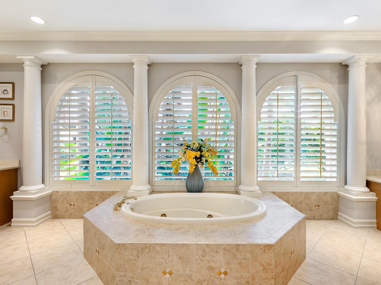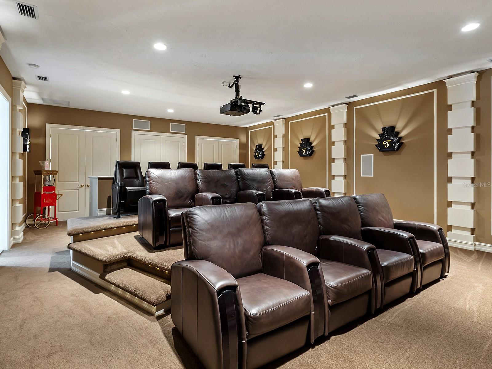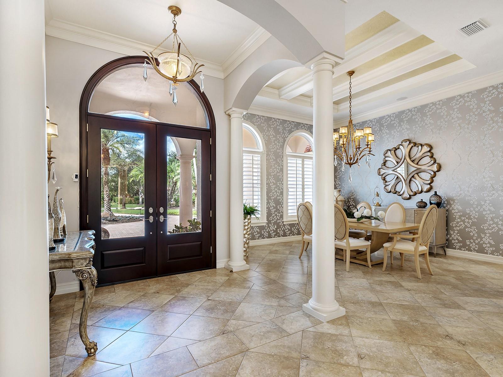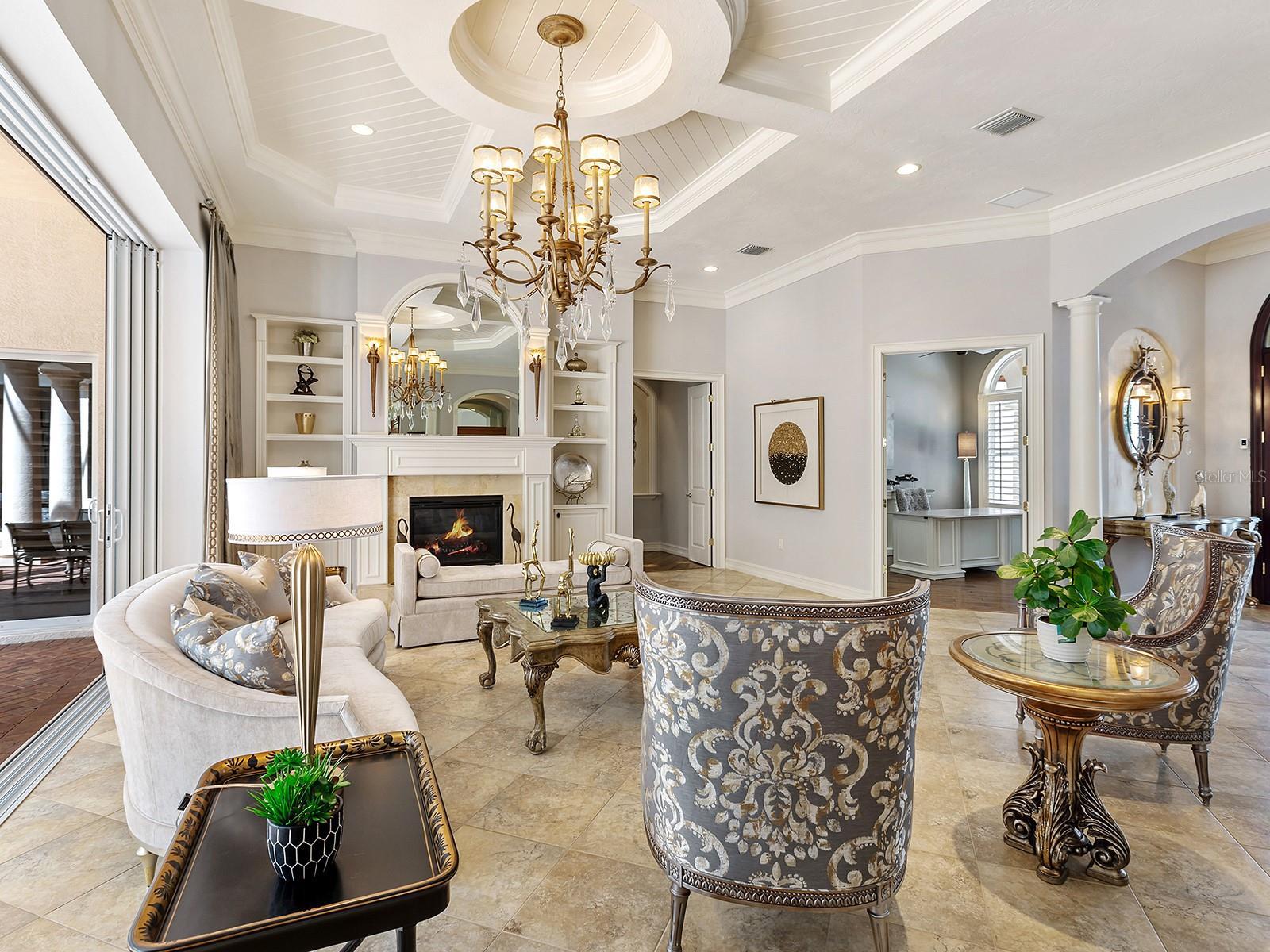 Built by Pruett Homes, this timeless estate embodies exceptional craftsmanship and thoughtful design, offering more than 7,000 square feet of living space on a beautifully landscaped 0.80-acre homesite in The Concession. A circular paver drive with a landscaped island and a barrel tile roof set a grand tone, while a welcoming front porch with stately columns leads to the double glass entry doors. Inside, architectural details include crown moldings, plantation shutters, oversized tile flooring, and soaring ceilings that enhance the home’s open, elegant aesthetic. The foyer introduces a refined entry with column accents and an art niche leading to the formal living and dining rooms. The living room centers on a gorgeous fireplace flanked by built-in shelving and opens through four-panel pocketing sliders to the lanai. A nearby wet bar features dolomite countertops with seating, wine storage, glass cabinetry, and a wine cooler—ideal for entertaining. The dining room showcases a tray ceiling with beams, designer wallpaper, and large picture windows. The enormous kitchen is perfectly designed for cooking and entertaining, highlighted by GE Monogram appliances, including a six-burner gas range with griddle, dual ovens, and a professional-grade refrigerator/freezer. Dolomite counters with bar seating, a center island, custom solid-wood cabinetry, a mother-of-pearl-accented backsplash, and an expansive walk-in pantry combine beauty and function. A breakfast nook with an aquarium window connects seamlessly to the family room, which opens fully to the lanai through dual pocketing sliders. A dedicated office with engineered wood flooring, crown molding, and surround sound provides a quiet workspace. Additional main-level spaces include a laundry room with abundant cabinetry, GE washer and dryer, and folding station, plus a half bath and a pool bath with custom tile finishes. The generous primary suite is privately positioned on the first floor, featuring engineered wood floors, a spacious, elevated seating area overlooking the pool, two oversized walk-in closets with wooden storage, and a spa-inspired bath with a jetted tub, frameless shower, dual vanities, and a makeup station. Upstairs, three expansive guest suites offer walk-in closets, plantation shutters, and en-suite or shared baths with custom tilework. The upper level also includes a spacious game and bonus room with a wet bar, granite counters, refrigerator, and microwave, plus a theater that seats 18 with tiered leather seating and a built-in bar. A large, covered terrace overlooks the pool and lanai, and an additional half bath serves the entertainment area. Outdoor living is equally impressive with a two-story screened lanai, heated saltwater pool and elevated spa with a cascading water feature, an outdoor kitchen with Stirling grill, fridge, sink, and seating, plus multiple covered lounging and dining areas. The fenced yard, landscape lighting, and lush tropical foliage complete the resort-style setting. In addition, four garage spaces—two on each side of the home—one side includes additional golf cart parking, while both feature ceiling fans, epoxy floors, and plantation shutters. Abundant storage throughout the home ensures functionality at every turn. The home also has a whole-house generator. The Concession, home to the PGA Tour World Golf Championship and Senior PGA Championship, is one of the most prestigious golf communities. Note: Windows and doors are NOT impact glass.