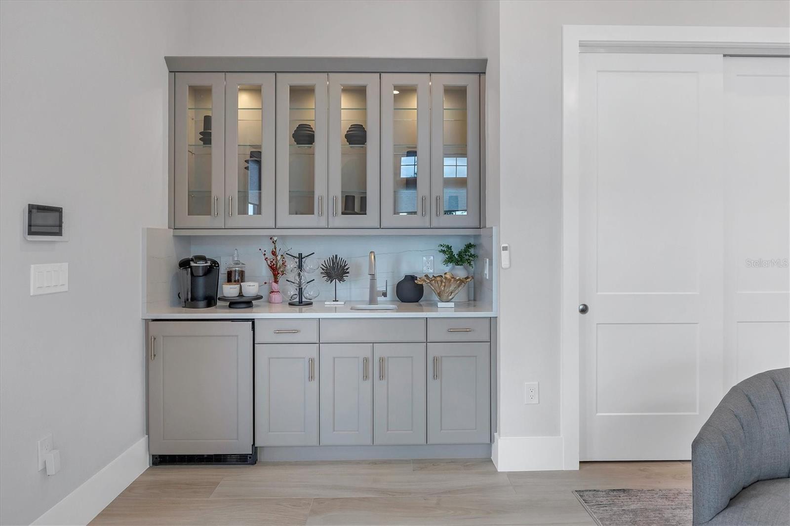 Exquisitely crafted and masterfully presented, 8477 Pavia offers a rare fusion of elevated design, refined comfort, and a former Chandler IV model home with meticulous attention to detail. A custom front door opens to an impressive foyer defined by soaring ceilings and a striking accent wall, setting the tone for the refined living spaces beyond. The living room exudes sophistication with its illuminated architectural ceilings, a media alcove with accent wall, and elegant wood-look tile flooring. The chef’s kitchen is both stylish and functional, featuring a massive central island with hidden storage, high-end stainless steel appliances, abundant white cabinetry, a dry bar with glass uppers and beverage cooler, and a sleek white tile backsplash. An open dining area, lighted ceilings, pocketing sliders, and a walk-in pantry enhance both everyday living and entertaining. A dedicated office offers the perfect work-from-home environment with high ceilings, walls of windows, floating shelves, a built-in workstation, and glass-paneled doors. The bonus room provides exceptional versatility—ideal as a fitness area, family room, or second office—with zero-corner sliders, large windows, and an en-suite full pool bath. Outside, the lanai becomes a true extension of the home, highlighted by a heated saltwater pool with sun shelf, a covered lounge area with gas fire pit, and a fully equipped outdoor kitchen with grill, sink, and vent hood. The primary suite is a private sanctuary with a dedicated alcove entry, two custom walk-in closets, double doors, a lighted tray ceiling, and a spa-like bath featuring dual vanities, a walk-in shower, freestanding tub, linen closet, and water closet. Two additional guest suites in the main home each offer an en-suite bath and walk-in closet. A separate guest casita adds even more flexibility with its own bedroom, sitting area, expansive windows, and full bath with tub/shower combination. Additional highlights include a well-appointed laundry room with ample cabinetry, sink, and Whirlpool appliances, as well as an oversized three-car garage with epoxy flooring and generous storage. Residents enjoy access to a premier amenity center with resort-style pools, a clubhouse, restaurant, state-of-the-art fitness center, tennis, pickleball and basketball courts, a dog park, and a playground. Ideally located minutes from UTC, Waterside Place, Lakewood Ranch, downtown Sarasota, Gulf beaches, Mote Aquarium, Benderson Park, and the Sarasota Polo Fields, this residence offers the perfect blend of elevated luxury and effortless Florida living.