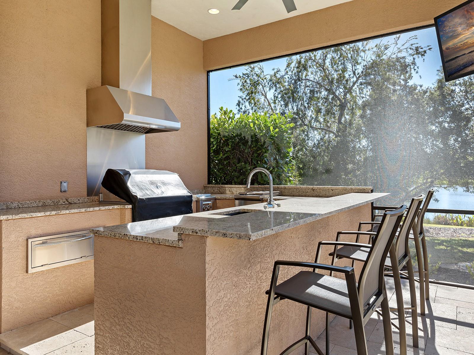 Ready for a completely custom, lakeside lifestyle in one of the premier communities of Lakewood Ranch? Now available in The Lake Club is this custom Todd Johnston residence that is brimming with contemporary style, sparkling lake views, and the little touches throughout the home that make living here a true joy. Located in the original phase of The Lake Club, you’ll arrive home from the gated entrance to streets lined with mature palms and oaks, and you can take advantage of the proximity of the clubhouse and amenities. Boasting over 3,400 SF, this home has a space for every lifestyle, whether you enjoy formal entertaining, casual gatherings, or outdoor get togethers. From the solid double front door, you’re invited into the foyer where you get the first glimpses of the southwestern lake views and custom upgrades including porcelain tile flooring; impact windows and sliders, designer light fixtures, custom feature walls, tray ceilings with sound system, and more. The formal living and dining spaces set the stage for holiday meals and elegant entertaining, or wind down with casual weeknights in the family room and dinette nook. The chef’s kitchen is truly the star of this home showcasing custom slab cabinetry, waterfall stone counters, peninsula seating, and a central island with prep sink, 2 wine refrigerators, and reverse osmosis system. The top-of-the-line appliance suite by Thermador makes cooking a breeze with a 6-burner gas cooktop, warming drawer, dishwasher, refrigerator, built-in steam wall oven, microwave, and your own coffee station with built-in Miele cappuccino machine. The family room is the ideal hang out space with a custom feature wall of art display niches and fireplace, plus two walls of sliding glass doors connecting you to the outdoors. The travertine paver lanai takes center stage with a completely custom pool that is truly a work of art with waterfall, sunshelf, and raised spa that maximizes the lake views. Surrounded by a classic colonnade screen enclosure, the lanai offers two separate covered entertaining areas and custom outdoor kitchen outfitted with stainless steel grill, separate side burner, bar fridge, and your very own pizza oven! Inside the spacious primary suite offers dual views of the lanai and pool, separate seating area, large walk-in closet with his and hers built-ins, and a custom morning bar so you don’t need to leave your bedroom for morning coffee. The en-suite bathroom is truly a spa experience with custom tile walls and floors, jetted soaking tub; vanity with extra storage, large built-in mirrored medicine cabinet, towel warmer, his and her’s private water closets, TV within the mirror and a spacious frameless glass walk-in shower with rain heads, body sprays, and steam. When you crave privacy, retreat to the study with custom leather-look floors and built-in storage cabinetry that is tucked away from the action of the home. There is even a large bonus room with lakes views and French doors to the lanai that offers a versatile space for a media room, hobby room, den, or anything your lifestyle desires. Guests will find comfort in their own spacious bedrooms complete with walk-in closets and en-suite bathrooms; one bathroom also offers additional access as a full pool bath. Completing this impressive residence is a laundry room, and 3-car side-loading garage. The Lake Club is an exclusive premier, gated community with a Grande Clubhouse, restaurant, pool, tennis, pickleball and more.