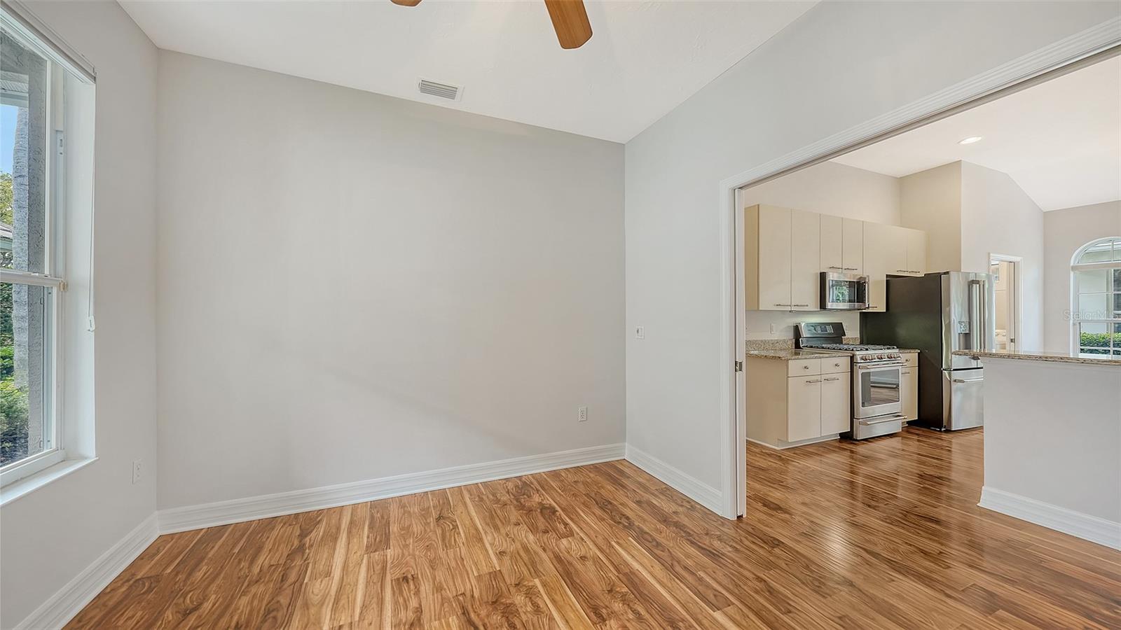 ***NEWLY PAINTED INTERIOR - NEWLY LOWERED PRICE***Enjoy the Florida lifestyle with effortless, 2 bedroom/2 bathroom + Den maintenance-free living in the desirable Muirfield neighborhood of Lakewood Ranch Country Club. This beautifully maintained home features a NEW ROOF and a tranquil preserve view with the golf course visible in the distance. The private, extended brick-paver lanai offers a versatile heated spa-pool, perfect for a refreshing dip or relaxing hydrotherapy, creating an ideal outdoor entertaining area. The spacious owner’s suite includes a tiled sitting area with direct access to the spa-pool, along with a well-appointed en suite featuring dual vanities, a soaking tub, a separate frameless glass shower, and a walk-in closet with custom shelving and luggage storage. Soaring twelve-foot ceilings, architectural niches, transom windows and built-ins enhance the light-filled great room and formal dining area, adding refined designer touches throughout. The kitchen is accented by granite countertops, an island, and eat in dining area, while privacy pocket doors open to a den that can be used for extra living space or a home office. Additional outdoor living space includes a second screened patio, ideal for grilling or relaxing, accessible from the dining room through French doors or via a slider from the dinette. The intimate enclave of just 64 homes also offers a community pool, gathering area, and low HOA fees, completing this exceptional lifestyle opportunity.