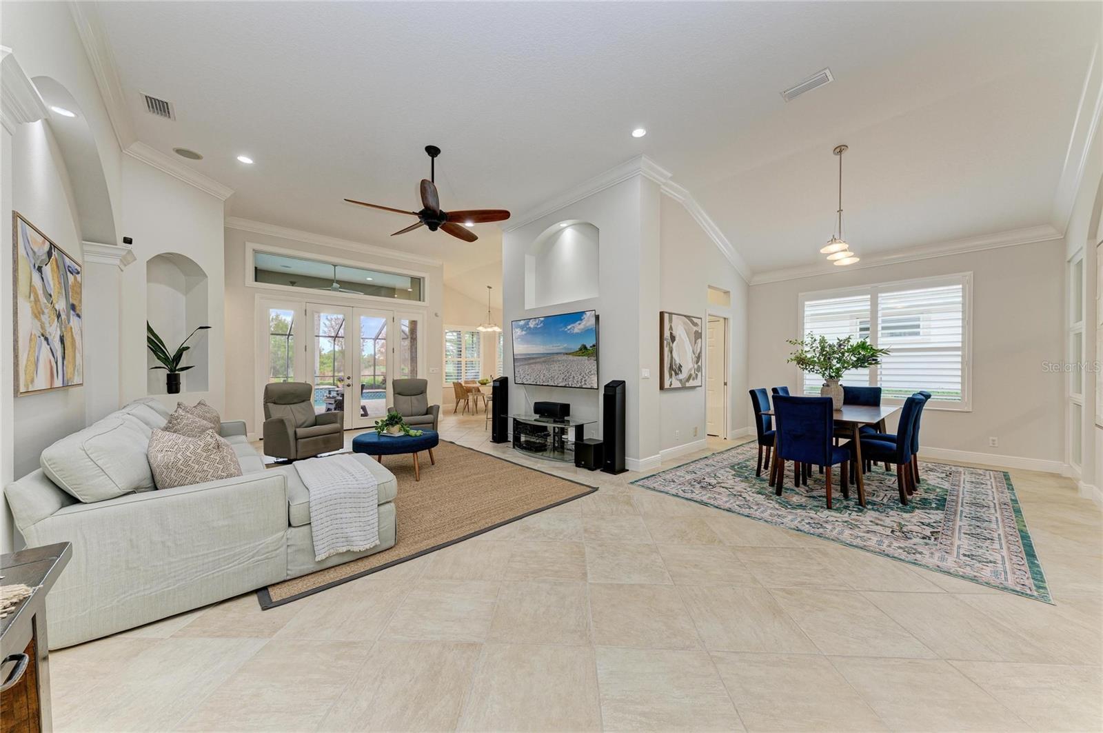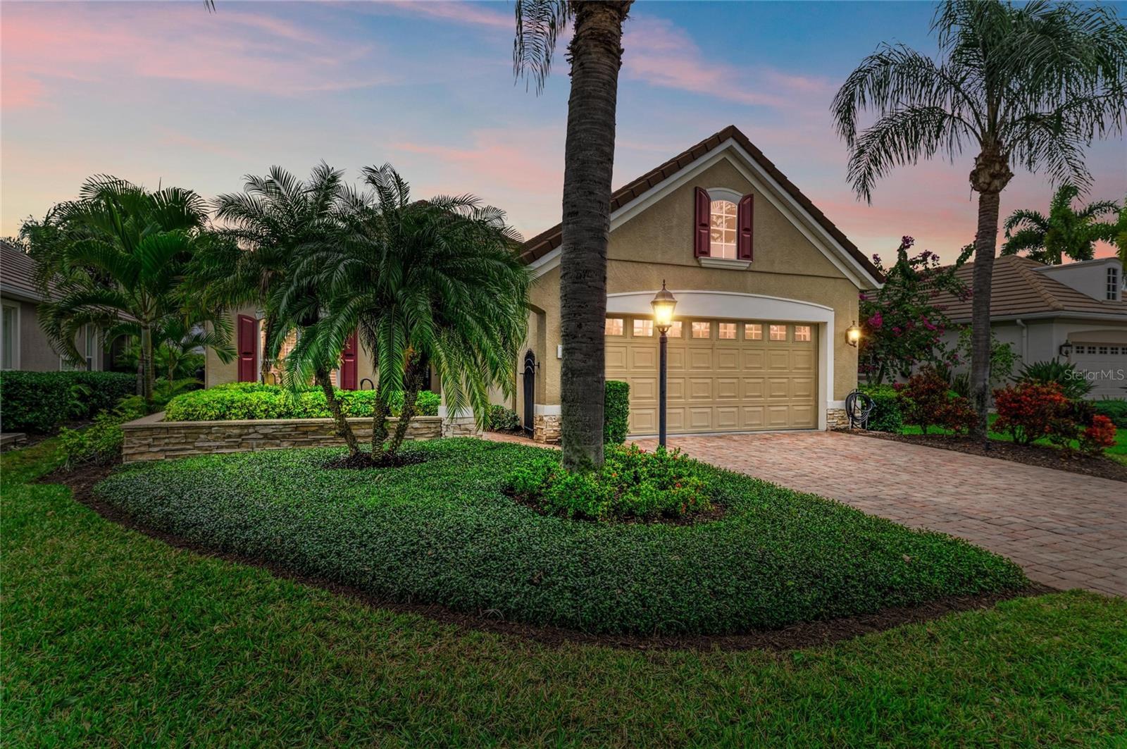 Perfectly positioned at the end of a quiet cul-de-sac, this beautifully updated pool and spa home sits on one of the most coveted lots in Lakewood Ranch Country Club, offering preserve, water, and Kings Dune golf course views. Located in Stone Ridge, one of the closest neighborhoods to the Country Club and golfing amenities, is sought-after due to the proximity. Designed by Neal Communities, the popular Burgundy floor plan showcases a rare, expansive open-air courtyard with a surrounding wall, leading to a beautiful French glass entry door. Inside, a gracious foyer opens to a light-filled Great Room features architectural detailing, soaring 12-foot ceilings, diagonal tile flooring, and transom window above the double glass lanai doors, seamlessly connecting indoor and outdoor living. Formal and casual dining spaces off the kitchen are enhanced by plantation shutters and Lutron lighting, creating an elegant ambiance. The chef’s kitchen, beautifully updated in 2022, is a standout feature showcasing Calcutta Tuscany quartz countertops, custom-painted cabinetry topped with crown molding, and an illuminated glass-front upper cabinet that adds both sophistication and warmth. This refined space features a granite composite sink, glass tile backsplash, gas cooking stove, and stainless steel appliances, including several newer additions. A central vacuum system with an automatic toe-kick dustpan offers effortless convenience. The primary suite is a serene retreat featuring lanai access, a generous sitting area, custom built-in closets with no carpeting, and a lovely en-suite bath with dual vanities, a soaking tub, and a zero-entry walk-in shower. The two guest bedrooms are thoughtfully tucked behind a pocket door, creating a private wing with a shared bath, ideal for guests or family. Outdoor living truly shines with saltwater, gas-heated pool and spa with water feature, outdoor shower, and a rescreened lanai. The lanai is thoughtfully designed with two separate areas, an open space for enjoying the views and a covered entertaining area featuring ceiling speakers and a pre-wired gas line. The well-appointed laundry room offers upper cabinetry, a built-in sink, hanging rack and a top loading washer and dryer. Additional highlights include a whole-house surge protector, retractable screen doors at the front entry and lanai, a sealed roof with transferable warranty (2023), Rinnai recirculating tankless water heater (2023), Kinetico water softener and filtration system (2022), and Trane HVAC with warranty (2019). The extended garage provides space for a golf cart or additional storage and includes attic access with a pull-down ladder and shelving. Country Club membership is optional, with a variety of social, athletic, and golf memberships available, offering access to four championship golf courses, elegant clubhouses, a full-service athletic center, lap pool, fitness facilities, and a vibrant tennis and pickleball community with no wait list. Just minutes from Waterside Place, Lakewood Ranch Main Street, UTC shopping and dining, the Sarasota Polo Club, SRQ Airport, and the world-renowned Gulf Coast beaches. Low HOA fee includes lawn maintenance as an added benefit to this rare opportunity to experience the very best of Florida living.