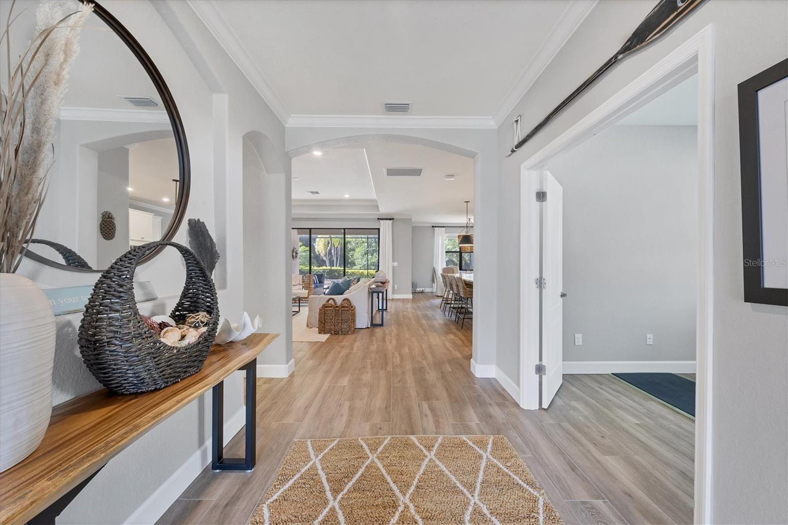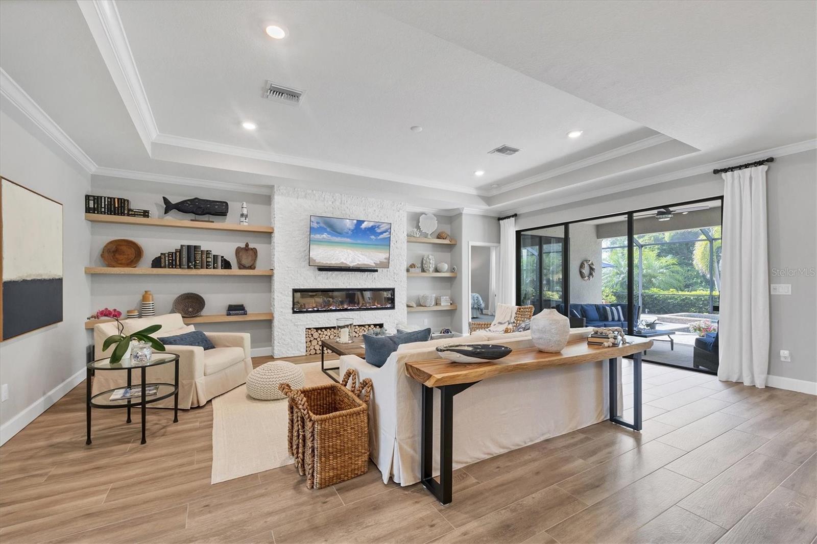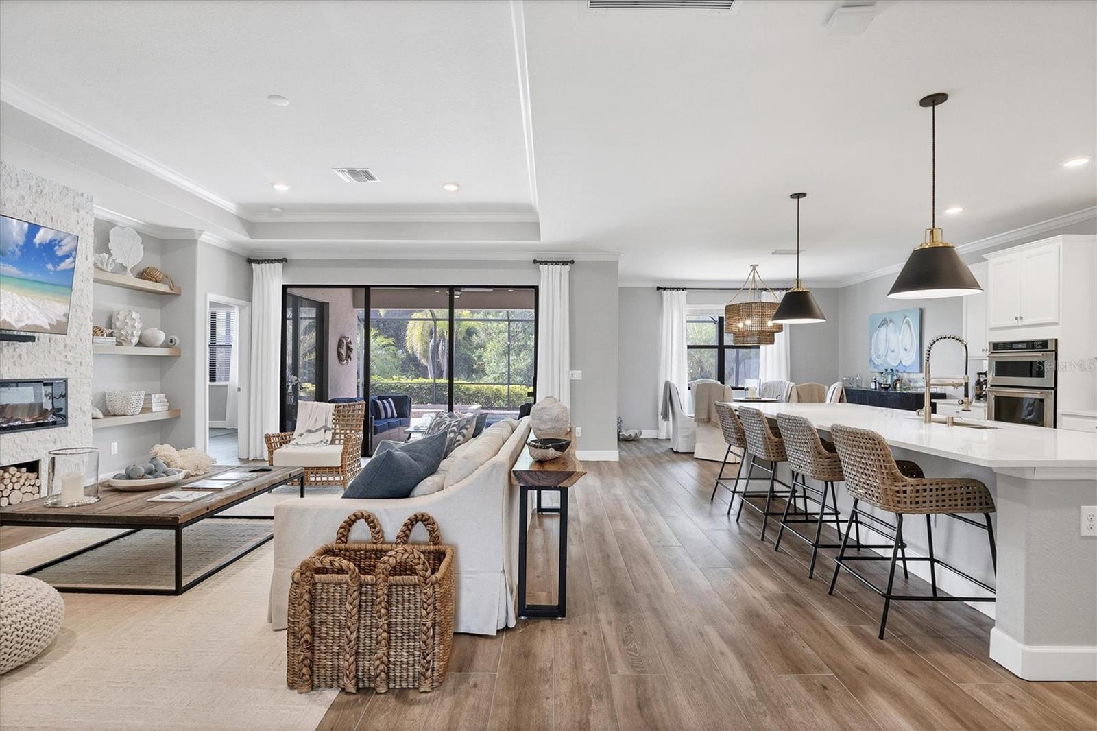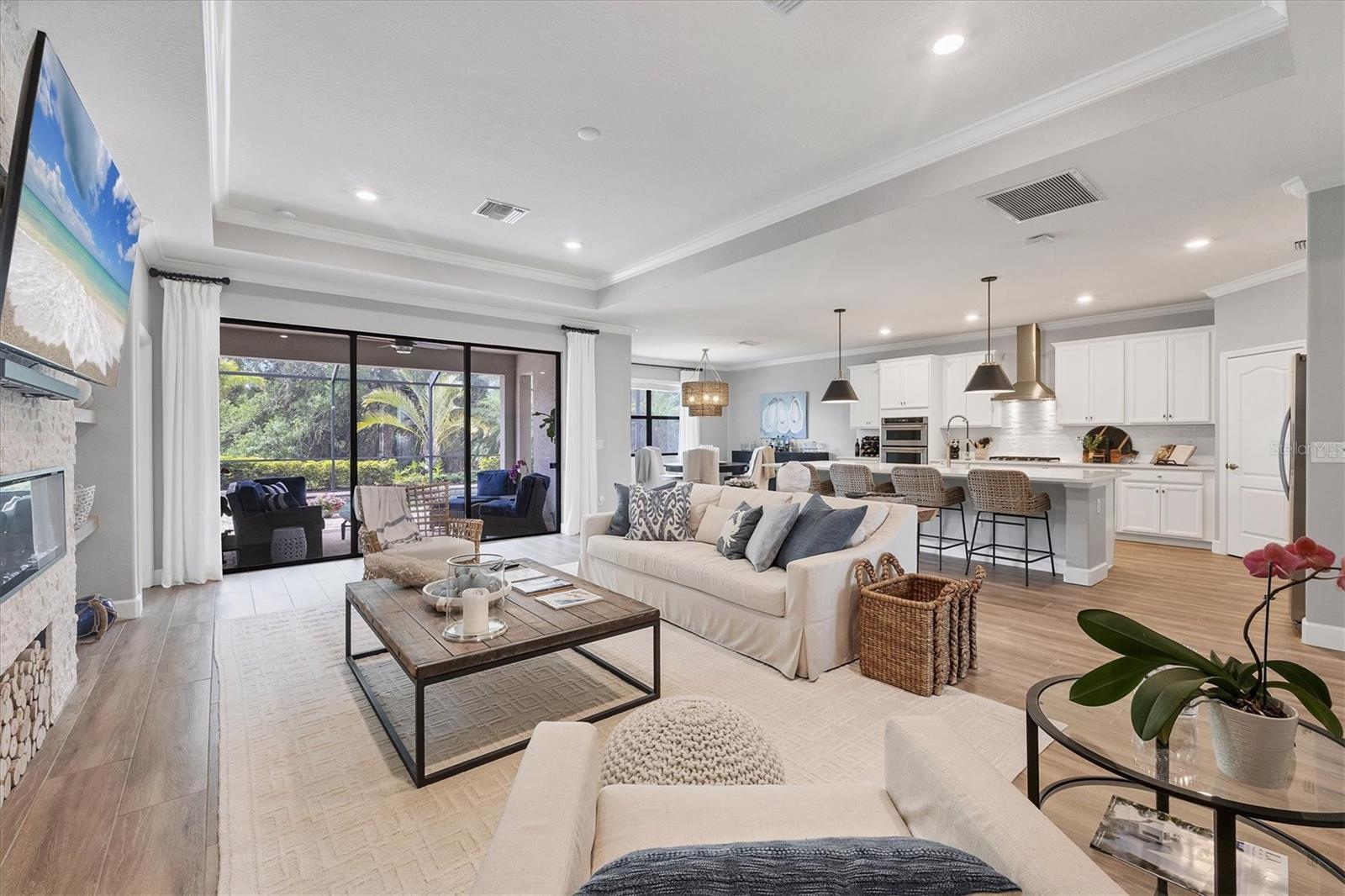 This GORGEOUS 3 bedroom, 3 bath plus den home in the sought after gated community of Polo Run has been tastefully upgraded throughout. Stately double entry front doors open to a sweeping open, airy floor plan that leads to expansive glass sliders revealing a luxurious outdoor gathering area overlooking a large pebble-tec® finished, gas heated pool and spa beyond in a private, tranquil preserve setting. High tray ceilings with crown moldings and upgraded porcelain warm wood-tone plank tile floors run throughout the home exuding elegance and luxury. The heart of this home is the gourmet kitchen with a massive center island with gorgeous white quartz countertops, KitchenAid double wall ovens each with convection capability, a 5-burner gas cooktop with a chic Z-Line stainless-steel hood, designer white tiled backsplash, custom pull-out drawers in all the lower cabinets and a counter depth side-by-side stainless steel refrigerator complete this Chef’s delight! Adjoining the kitchen the spacious family room has a gorgeous custom stacked stone-faced TV wall with a built-in Dimplex 74” fireplace with changing light and heat settings creating a delightful ambiance for entertaining or quiet relaxation. The master bedroom has 2 impressive walk-in closets with custom shelving leading to a spacious ensuite bathroom complete with his and her separate vanities, a soaking tub, large walk-in shower and private water closet. One guest bedroom has an ensuite bathroom offering comfort and privacy for guests. There is a second guest bedroom plus a bonus room that can be a den/office/craft room or currently an exercise/yoga room. The laundry room has a large washer/dryer and sink leading to an oversized 3 car garage with custom overhead storage. Polo Run is a beautifully maintained lifestyle community with an array of amenities including a tastefully decorated clubhouse, impressively equipped exercise room, aerobics room, pickleball, tennis and basketball courts, bocce ball, and playground all overlooking a resort-style heated pool and lovely lake beyond. There is also a dog park and expansive walking trails offering something for residents of all ages. Each home is equipped with solar panels, one of the first solar-powered communities in Lakewood Ranch. Lawn maintenance, irrigation and mulching are included in the low HOA fees allowing time to enjoy all the amenities as well as the thriving master-planned community of Lakewood Ranch, the #1multi-generational community in the U.S. since 2018 with easy access to I-75, nearby metro areas like Tampa and Sarasota, world-class beaches, high-end retail at neighboring University Town Center, 5-star dining as well as favorite locals eateries, weekend markets, abundant entertainment venues, professional sports, cultural attractions and airports. This home is truly one-of-a-kind, meticulously designed exuding warmth, luxury and sophistication in a community that has it all.