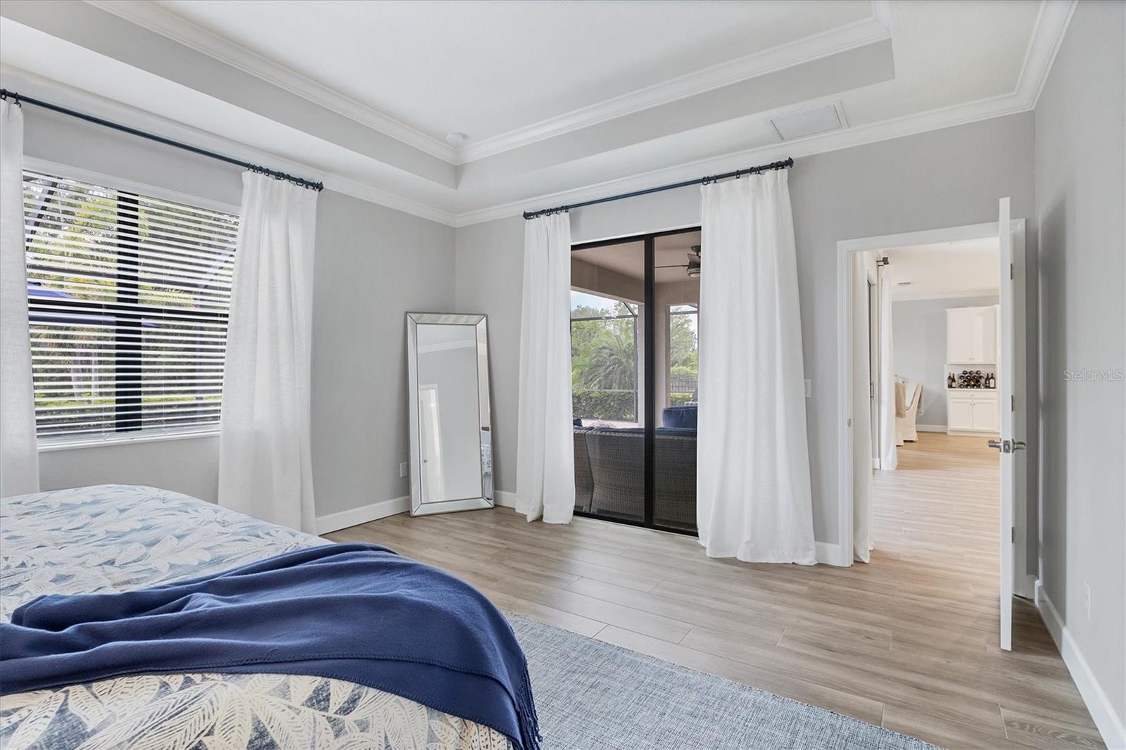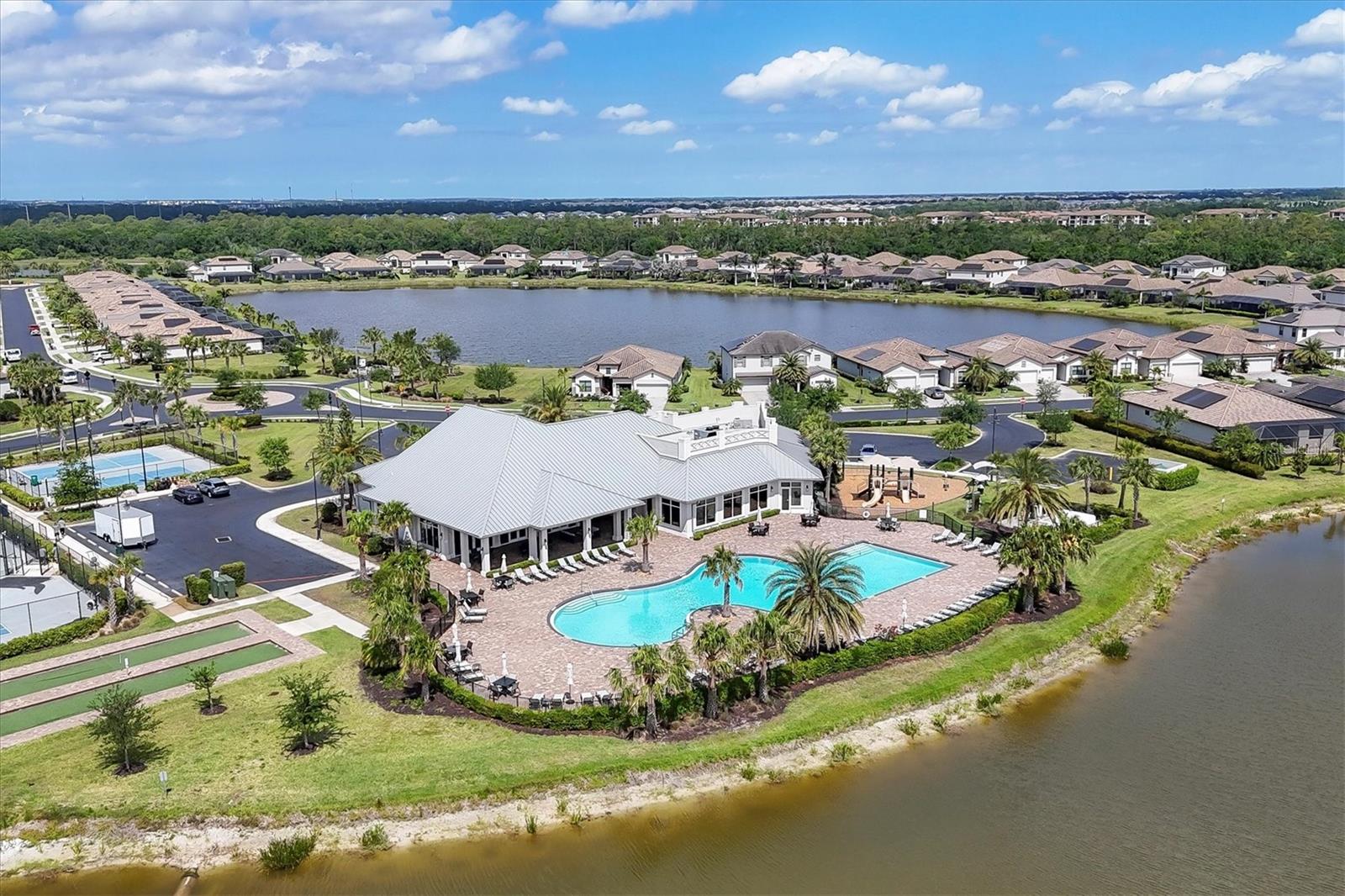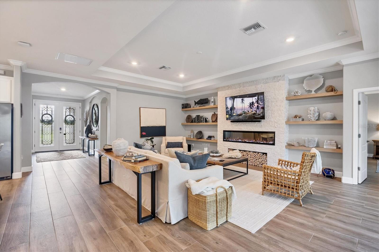 This GORGEOUS 3 bedroom, 3 bath plus den home in the sought after gated community of Polo Run has been tastefully upgraded throughout. Stately double entry front doors open to a sweeping open, airy floor plan that leads to expansive glass sliders revealing a luxurious outdoor gathering area overlooking a large pebble-tec® finished, gas heated pool and spa beyond in a private, tranquil preserve setting. High tray ceilings with crown moldings and upgraded porcelain warm wood-tone plank tile floors run throughout the home exuding elegance and luxury. The heart of this home is the gourmet kitchen with a massive center island with gorgeous white quartz countertops, KitchenAid double wall ovens each with convection capability, a 5-burner gas cooktop with a chic Z-Line stainless-steel hood, designer white tiled backsplash, custom pull-out drawers in all the lower cabinets and a counter depth side-by-side stainless steel refrigerator complete this Chef’s delight! Adjoining the kitchen the spacious family room has a gorgeous custom stacked stone-faced TV wall with a built-in Dimplex 74” fireplace with changing light and heat settings creating a delightful ambiance for entertaining or quiet relaxation. The master bedroom has 2 impressive walk-in closets with custom shelving leading to a spacious ensuite bathroom complete with his and her separate vanities, a soaking tub, large walk-in shower and private water closet. One guest bedroom has an ensuite bathroom offering comfort and privacy for guests. There is a second guest bedroom plus a bonus room that can be a den/office/craft room or currently an exercise/yoga room. The laundry room has a large washer/dryer and sink leading to an oversized 3 car garage with custom overhead storage. Polo Run is a beautifully maintained lifestyle community with an array of amenities including a tastefully decorated clubhouse, impressively equipped exercise room, aerobics room, pickleball, tennis and basketball courts, bocce ball, and playground all overlooking a resort-style heated pool and lovely lake beyond. There is also a dog park and expansive walking trails offering something for residents of all ages. Each home is equipped with solar panels, one of the first solar-powered communities in Lakewood Ranch. Lawn maintenance, irrigation and mulching are included in the low HOA fees allowing time to enjoy all the amenities as well as the thriving master-planned community of Lakewood Ranch, the #1multi-generational community in the U.S. since 2018 with easy access to I-75, nearby metro areas like Tampa and Sarasota, world-class beaches, high-end retail at neighboring University Town Center, 5-star dining as well as favorite locals eateries, weekend markets, abundant entertainment venues, professional sports, cultural attractions and airports. This home is truly one-of-a-kind, meticulously designed exuding warmth, luxury and sophistication in a community that has it all.