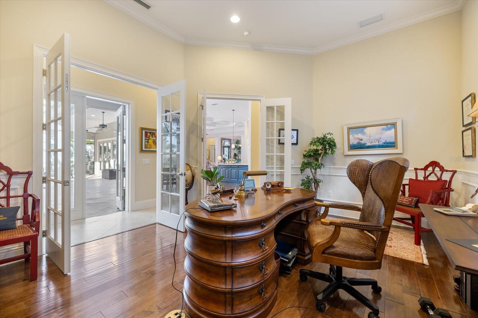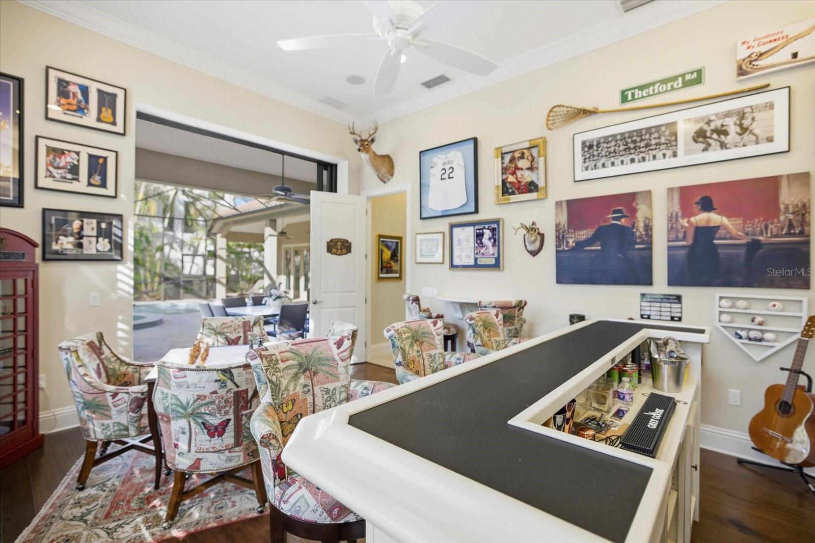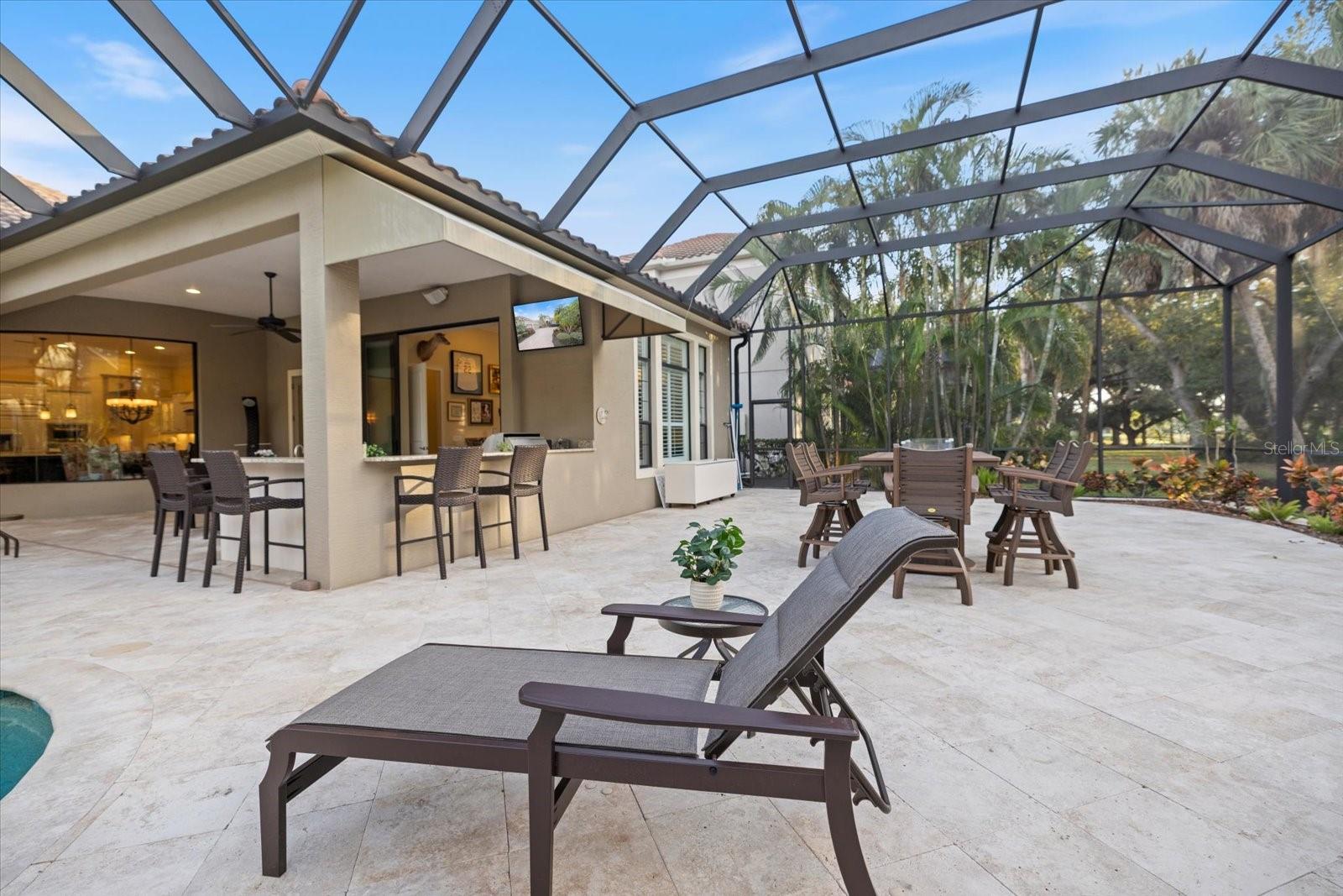 This stunning residence, located in Lakewood Ranch Country Club, perfectly blends luxury, comfort, and functionality. This meticulously designed home offers 3,698 square feet of living space under air, featuring 3 bedrooms, 3 baths, an office, and a bonus room. With an additional 690 square feet of covered lanai and nearly 3,000 square feet of screened-in outdoor living space, this home is ideal for entertaining and enjoying Florida’s beautiful weather. Imagine relaxing on the lanai, watching breathtaking sunsets over the golf course, or hosting unforgettable gatherings in this thoughtfully designed space. From the moment you arrive, the home’s grand entry makes a statement with oversized double iron doors featuring impact glass and a transom above, complemented by decorative tile flooring. Inside, the attention to detail is evident with crown molding, plantation shutters, and decorative wall and ceiling treatments throughout. Engineered hardwood and tile flooring flow seamlessly through the home, while custom built-in closets and cabinetry provide both style and functionality. The heart of the home is the chef’s kitchen, which boasts an oversized island with quartz countertops, GE Monogram appliances, including a six-burner gas stove, microwave, oven, refrigerator, and dishwasher with cabinet panels. A custom wooden hood, glass cabinets, marble backsplash, and an aquarium glass window in the eat-in kitchen add to the elegance. Pendant lighting creates a warm and inviting ambiance, making this space perfect for both cooking and gathering. The living room is equally impressive, featuring tongue-and-groove wall treatments, coffered ceilings, recessed lighting, and pocket sliding glass doors that open to the expansive lanai. The dining room is a refined space with a decorative mirror wall, tray ceiling, chandelier, and a dry bar complete with a wine fridge and glass doors. The primary suite is a private retreat with a vestibule entry, dual walk-in closets with custom built-ins, a coffered ceiling with tongue-and-groove detailing, and French doors with clear impact glass that lead to the lanai. The spa-like primary bath offers dual split vanities with quartz countertops, a tub with wood surround, a walk-in shower with tile to the ceiling, and ample storage with a linen closet and water closet. Step outside to your private oasis, where the saltwater pool with a fountain and spa is perfectly situated to take in the serene golf course views. The oversized covered lanai, complete with ceiling fans, provides a comfortable space to relax or entertain, while the outdoor kitchen, featuring a grill, sink, beverage fridge, and bar, makes hosting a breeze. Whether you’re enjoying a quiet evening watching the sunset or entertaining friends and family, this outdoor space is truly exceptional. The oversized 3-car garage is a standout feature, offering high ceilings, custom cabinets, a mini-split system for climate control, and speckled epoxy flooring. Additional highlights of the home include landscape lighting, stem wall construction, and decorative molding throughout. Every detail of this home has been carefully considered to provide a luxurious and welcoming living experience.