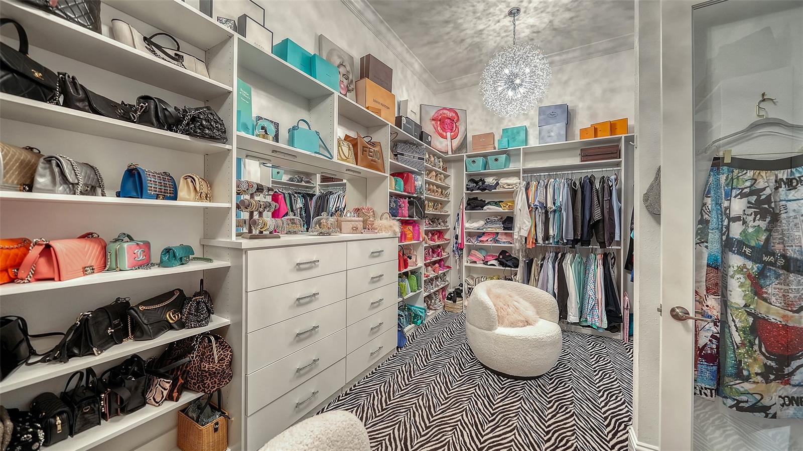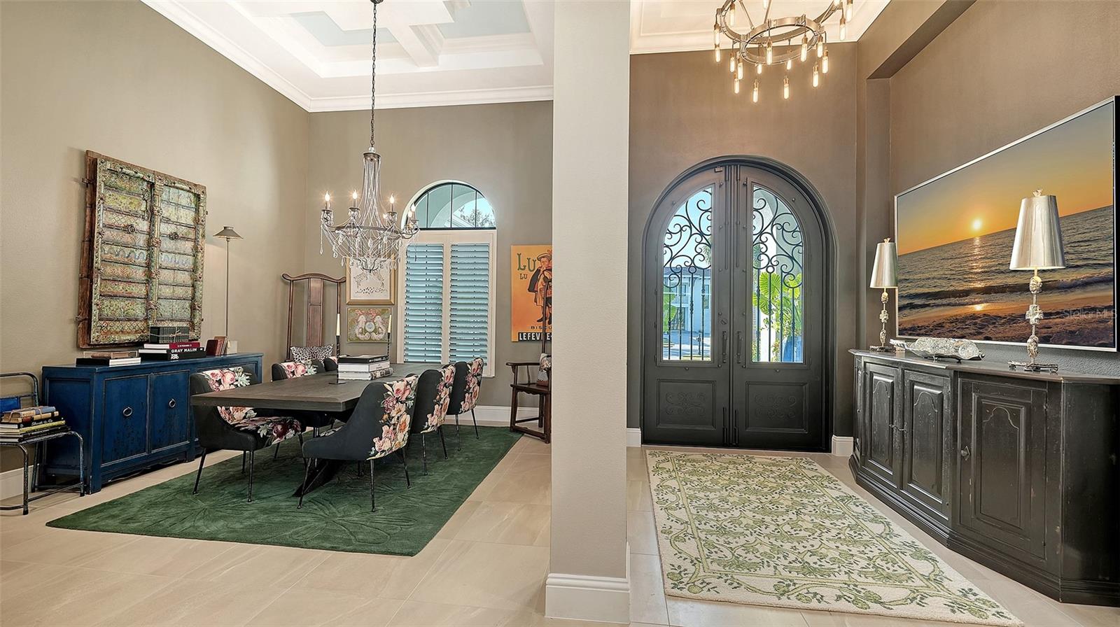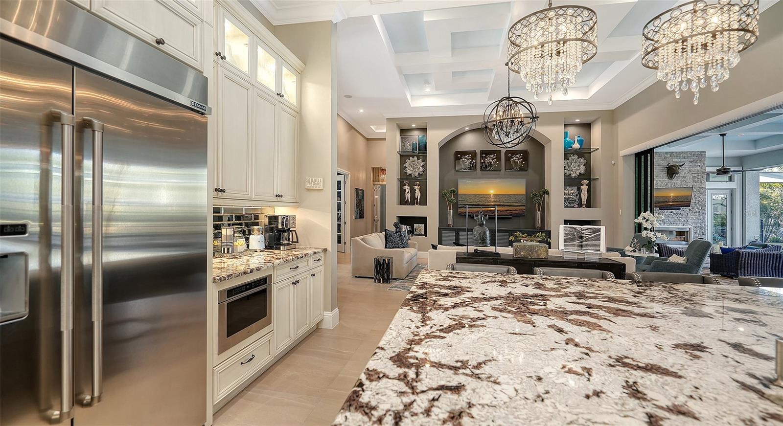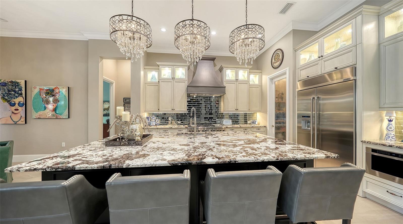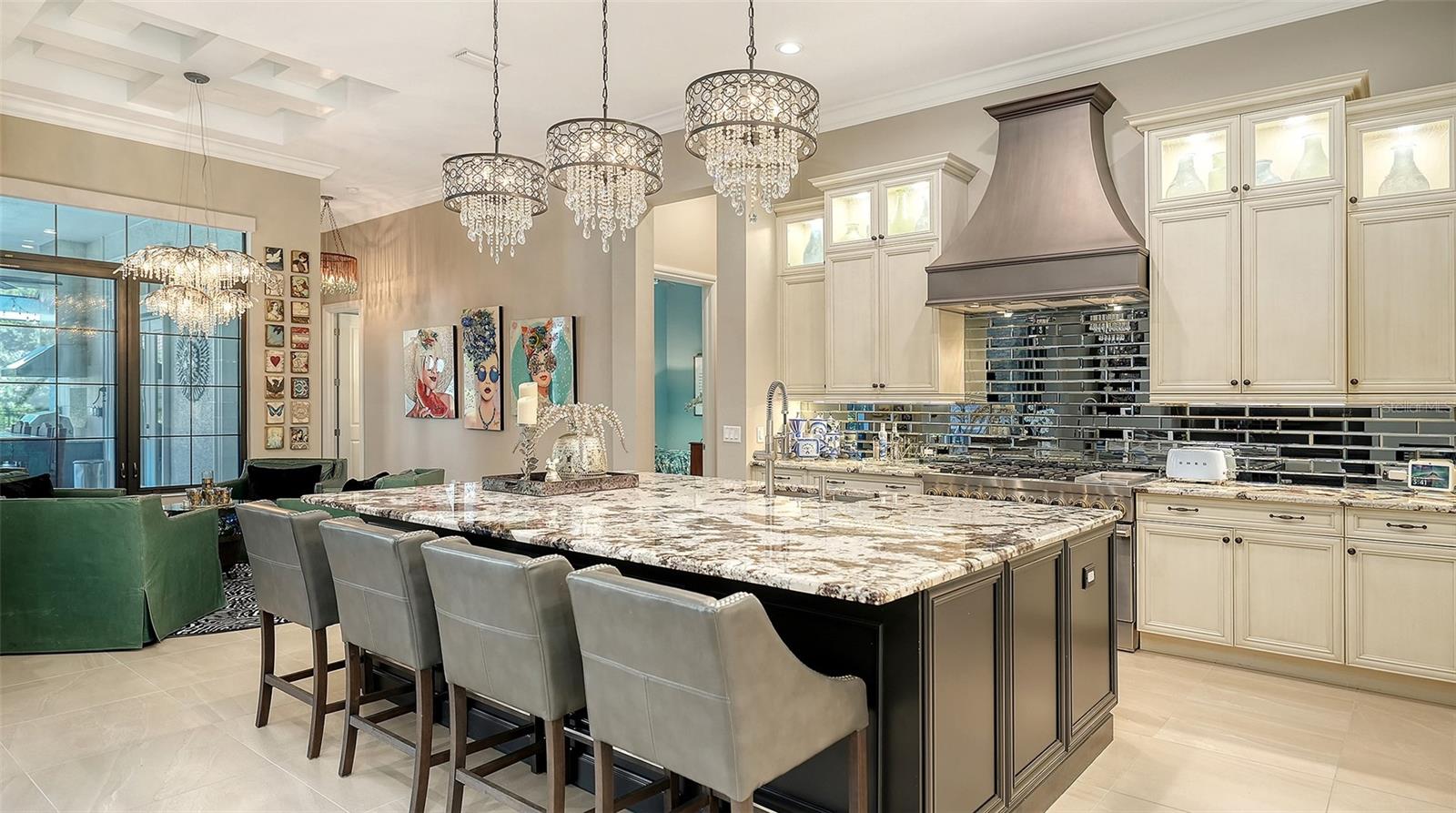 Exquisitely customized Stock Signature residence set on an expansive, ultra-private two-thirds acre homesite within the prestigious, guard-gated enclave of The Lake Club. Architecturally distinctive and masterfully curated, this 3-bedroom, 4.5-bath estate showcases exceptional craftsmanship, designer finishes, and an extensive collection of recent high-end upgrades. The resort-inspired grounds are newly landscaped and thoughtfully designed with aluminum fencing, specialty plantings, ambient landscape lighting, and a full irrigation system, offering a tranquil, secluded setting. Hurricane-impact windows and sliding doors, paired with a bespoke solid iron entry door, provide both refined elegance and superior security. The panoramic pool enclosure is enhanced with café lighting, programmable LED pool and spa illumination, and a fully appointed outdoor kitchen with beverage cooler and sink, creating an ideal environment for sophisticated alfresco entertaining. Interiors are defined by dramatic architectural ceiling treatments, custom millwork, designer chandeliers, rich crown molding, recessed lighting, and thoughtfully designed window treatments. The entire residence has been freshly repainted inside and out, presenting a pristine and flawless offering. The gourmet kitchen is a showpiece, featuring illuminated upper cabinetry, a striking smoked mirror glass backsplash, custom range hood, seamless one-piece granite island, updated sink and faucet, refined hardware, under-cabinet and pendant lighting, and newly refinished cabinetry. Living and entertaining spaces are enriched with custom crafted built-ins, tailored lighting, plantation shutters in the dining room, plush new carpeting in guest suites, and two private executive offices with custom cabinetry and French doors. The versatile bonus room offers elegant flexibility as a media room or additional guest suite. The sumptuous primary suite includes a reimagined, expanded couture closet with custom cabinetry, new carpeting, glass entry doors, and designer lighting. The spa-inspired primary bath boasts new quartz countertops, dual sinks, upgraded fixtures, illuminated custom mirrors, and artfully updated tile. A dramatic, designer powder room provides a striking statement of luxury. Notable enhancements include a whole-house water softener and filtration system and a whole-house Kohler generator. Residents of The Lake Club enjoy a world-class lifestyle with a grand clubhouse, fine dining and bar, two resort-style pools, state-of-the-art fitness center, Har-Tru tennis courts, pickleball, fishing, and scenic walking trails. Ideally positioned in Lakewood Ranch’s most exclusive neighborhood, this exceptional estate is moments from premier shopping, dining, top-rated schools, and the Gulf Coast’s renowned beaches.