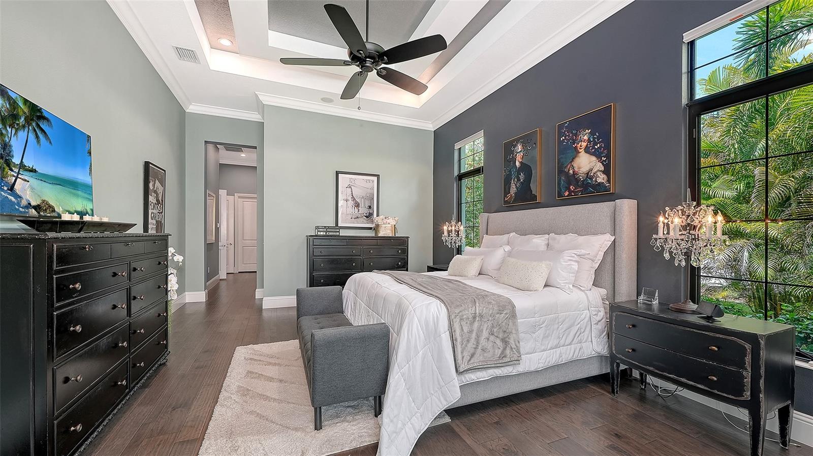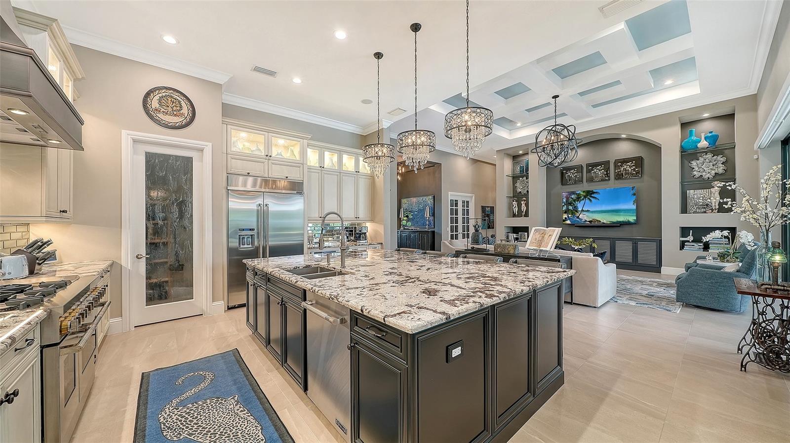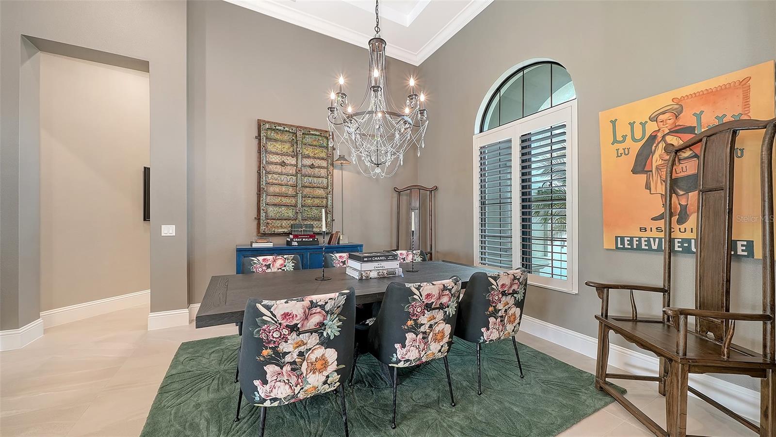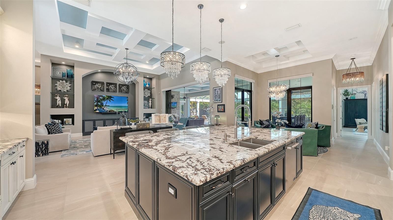 Exquisitely customized Stock Signature residence set on an expansive, ultra-private two-thirds acre homesite within the prestigious, guard-gated enclave of The Lake Club. Architecturally distinctive and masterfully curated, this 3-bedroom, 4.5-bath estate showcases exceptional craftsmanship, designer finishes, and an extensive collection of recent high-end upgrades. The resort-inspired grounds are newly landscaped and thoughtfully designed with aluminum fencing, specialty plantings, ambient landscape lighting, and a full irrigation system, offering a tranquil, secluded setting. Hurricane-impact windows and sliding doors, paired with a bespoke solid iron entry door, provide both refined elegance and superior security. The panoramic pool enclosure showcases the resort-style saltwater pool and spa, enhanced with café lighting, programmable LED pool and spa illumination, and a fully appointed outdoor kitchen with beverage cooler and sink, creating an ideal environment for sophisticated alfresco entertaining. Interiors are defined by dramatic architectural ceiling treatments, custom millwork, designer chandeliers, rich crown molding, recessed lighting, and thoughtfully designed window treatments. The entire residence has been freshly repainted inside and out, presenting a pristine and flawless offering. The gourmet kitchen is a showpiece, featuring illuminated upper cabinetry, a striking smoked mirror glass backsplash, custom range hood, seamless one-piece granite island, updated sink and faucet, refined hardware, under-cabinet and pendant lighting, and newly refinished cabinetry. Living and entertaining spaces are enriched with custom crafted built-ins, tailored lighting, plantation shutters in the dining room, plush new carpeting in guest suites, and two private executive offices with custom cabinetry and French doors. The versatile bonus room offers elegant flexibility as a media room or additional guest suite. The sumptuous primary suite includes a reimagined, expanded couture closet with custom cabinetry, new carpeting, glass entry doors, and designer lighting. The spa-inspired primary bath boasts new quartz countertops, dual sinks, upgraded fixtures, illuminated custom mirrors, and artfully updated tile. A dramatic, designer powder room provides a striking statement of luxury. Notable enhancements include a whole-house water softener and filtration system, a whole-house Kohler generator and an epoxy floor coated 4-car garage! Residents of The Lake Club enjoy a world-class lifestyle with a grand clubhouse, fine dining and bar, two resort-style pools, state-of-the-art fitness center, Har-Tru tennis courts, pickleball, fishing, and scenic walking trails. Ideally positioned in Lakewood Ranch’s most exclusive neighborhood, this exceptional estate is moments from premier shopping, dining, top-rated schools, and the Gulf Coast’s renowned beaches.