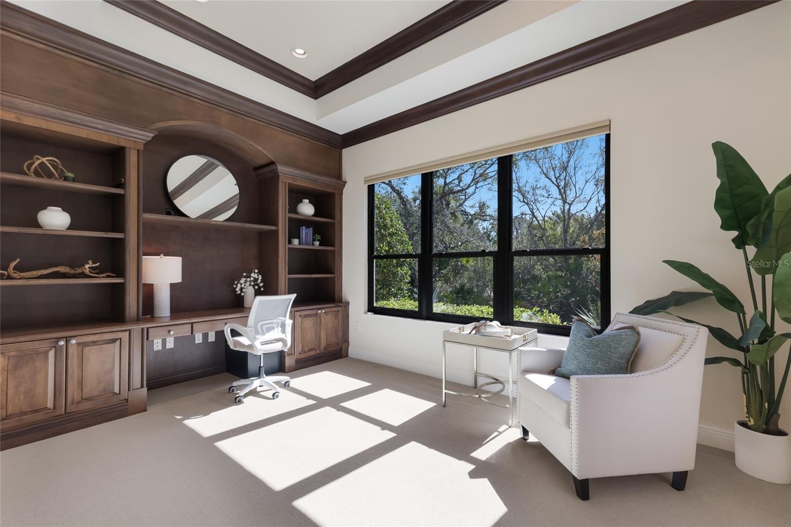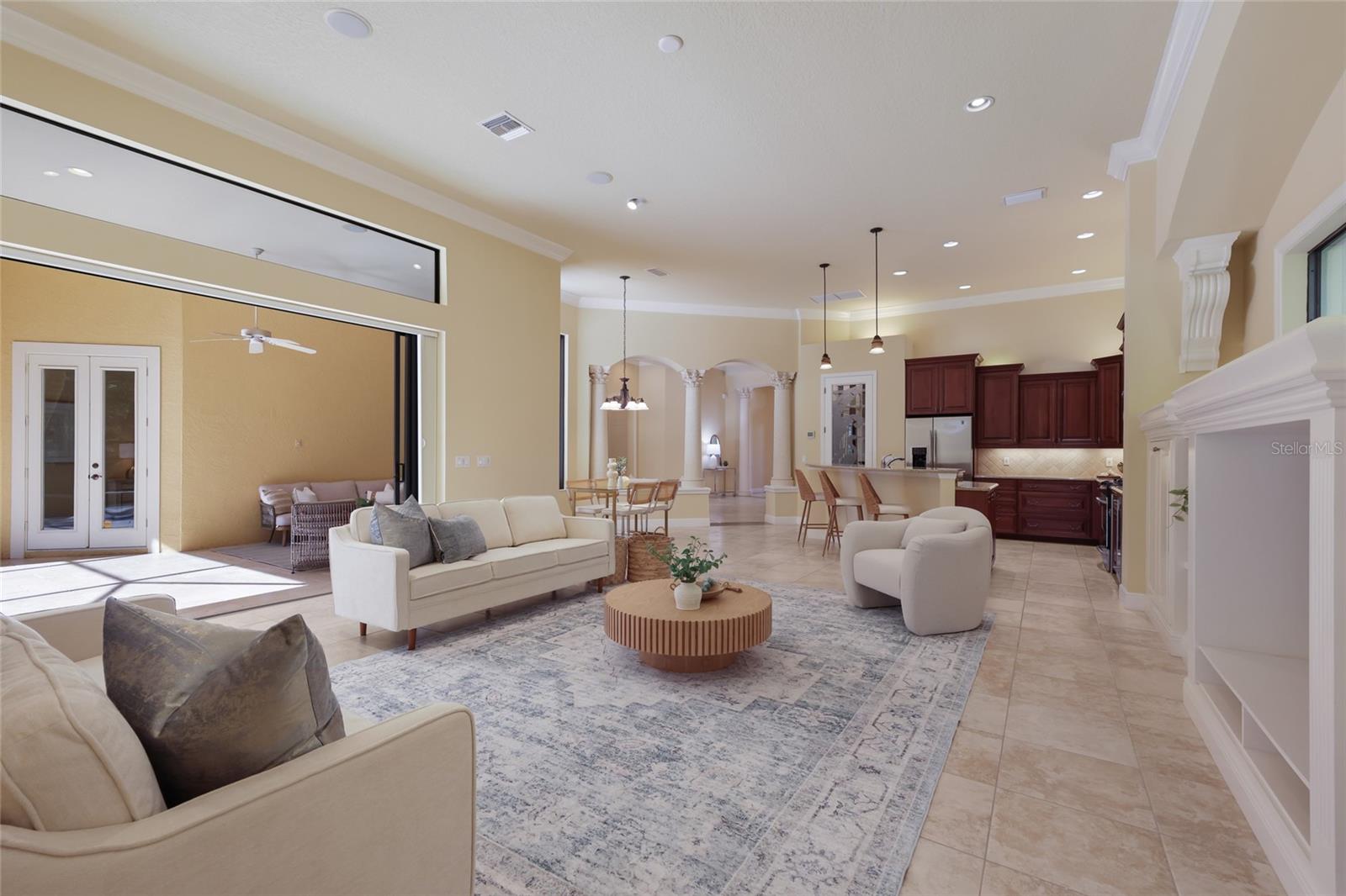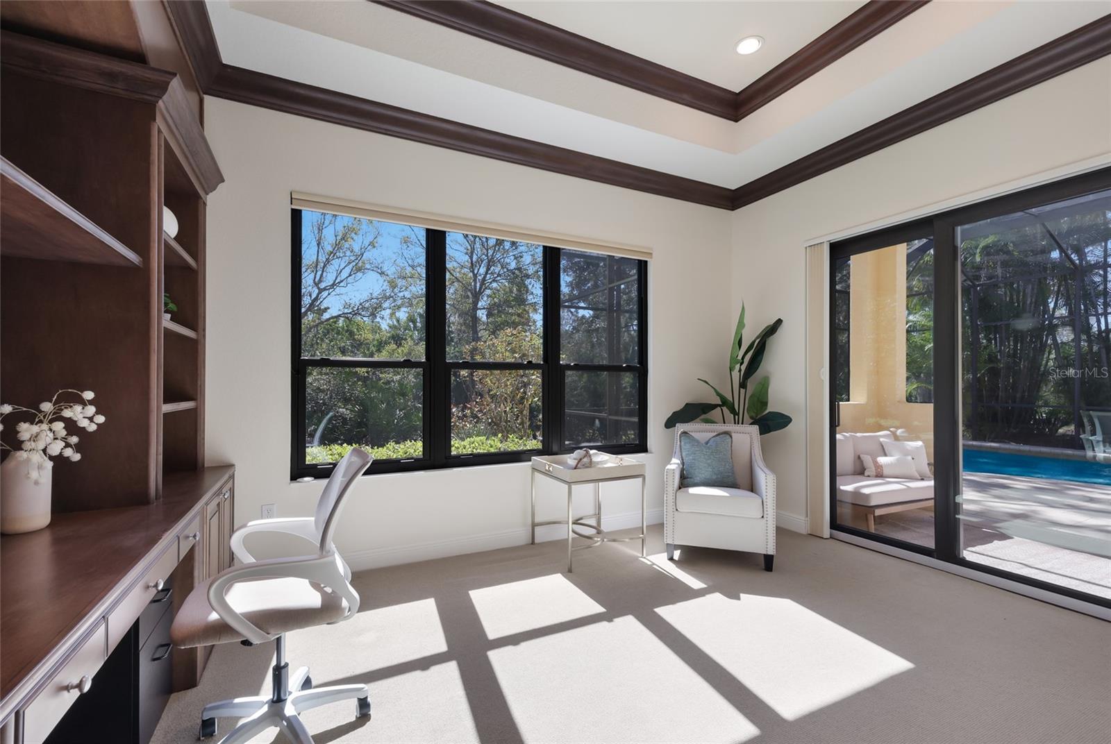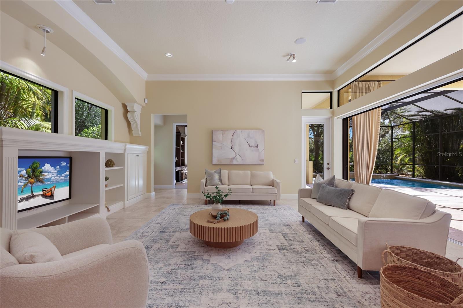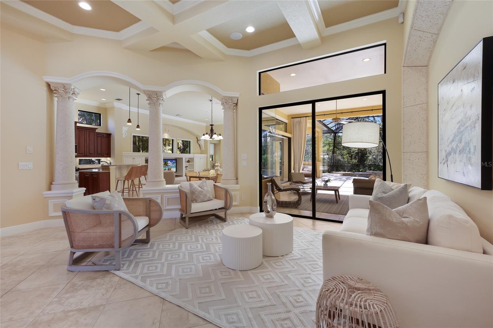 Situated on a lushly private and open south-facing preserve setting in The Country Club of Lakewood Ranch, this one-story three bedroom plus den residence showcases elegant architectural detailing throughout, volume coffered designer ceilings, a combination of IMPACT windows/sliders and hurricane protection throughout, and even a GENERATOR. Enlarged by four feet from Neal Signature’s original Salerno floor plan offering 2,805 square feet of one-story living with an inviting lanai, abundant under cover entertainment spaces, a large heated pool, travertine decking, and pre-plumbed for an outdoor kitchen. Seamlessly connecting this resort-styled lanai to the oversized great room, living room, kitchen and den are glass doors that reveal a large open living concept with voluminous designer ceilings, large scale windows, crown moldings, corinthian columns and built-in details. Chefs will delight in the well appointed kitchen with sprawling counters, wood cabinetry, stainless steel appliances, wine fridge, a large walk-in pantry, an oversized breakfast nook area, and a light-filled formal dining room. Relax and unwind in the elegant owner’s retreat offering two walk-in closets, direct lanai access, wood flooring, remote window coverings, and a spa-like bath with a dual sink vanity, large soaking tub, invigorating shower and separate water closet. Guests will be right at home in this split bedroom floorplan with two additional guest suites with plantation shutters, newly installed carpeting, and centered by a full bath. Additionally this fine residence offers a privately situated den with built-in office, double tray ceilings, plantation shutters, and the home’s third full bath strategically positioned with direct access off lanai doubling as the home’s pool bath. Other notable highlights of this all encompassing 3,773 total square foot residence in the gated and maintenance-included enclave of Silverwood includes, GENERATOR, a combination of hurricane enclosures and impact windows/slider, 2024 and 2019 AC units, a large laundry room with sink and cabinetry, 8’ interior doors, a 2024 pool heater, and a two-car garage. Within the #1 top-selling master-planned community Lakewood Ranch, known for its vibrant lifestyle and proximity to dining, shopping, polo, community events, etc. PLUS non-mandatory membership opportunities to become a member of Lakewood Ranch Golf & Country Club, which include four 18-hole championship golf courses, tennis, state-of-the-art Fitness center, clubhouses, junior Olympic-sized pool, pickleball and more.