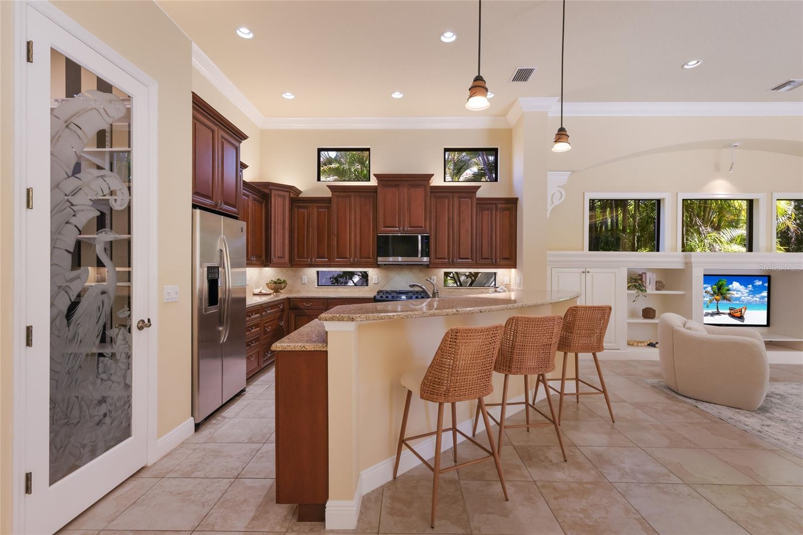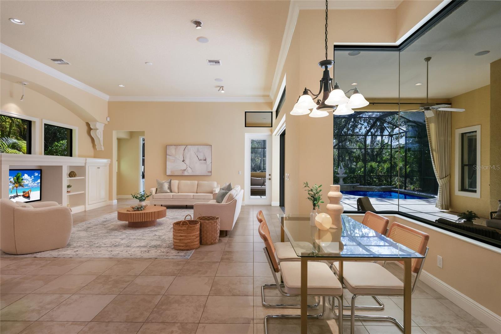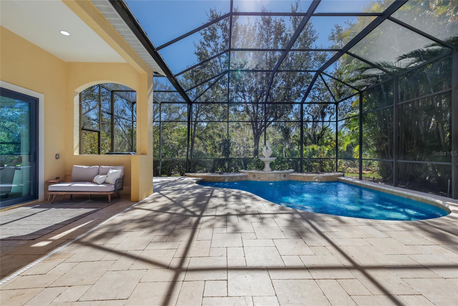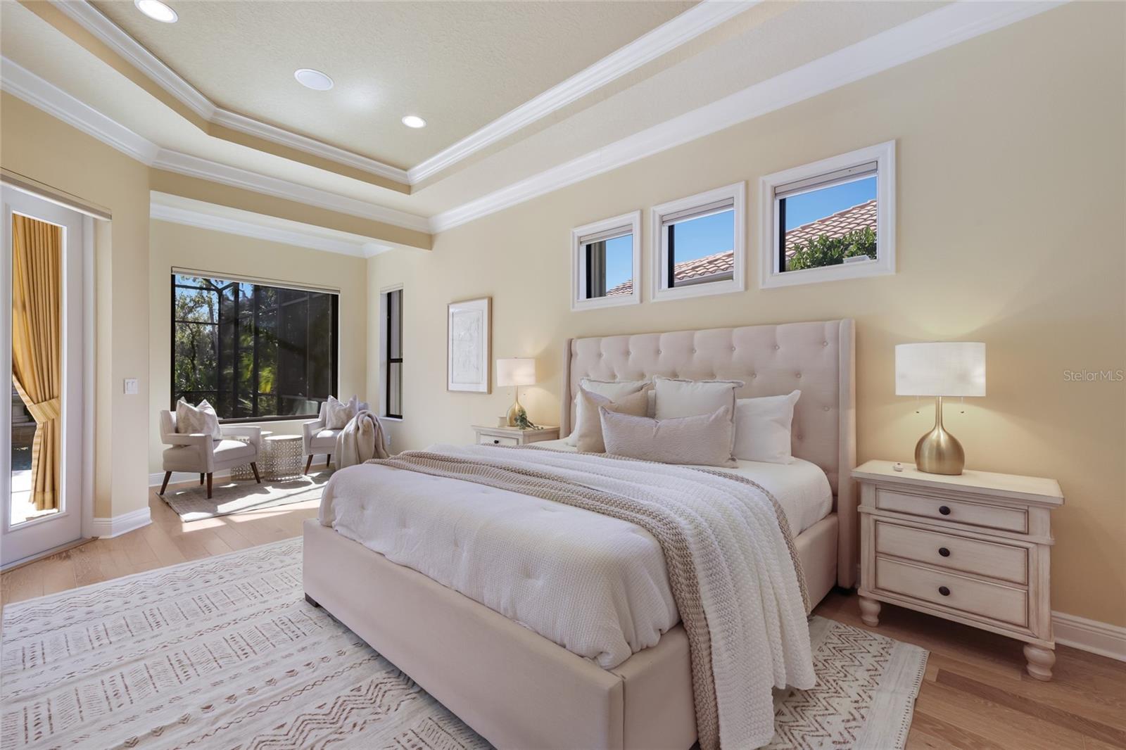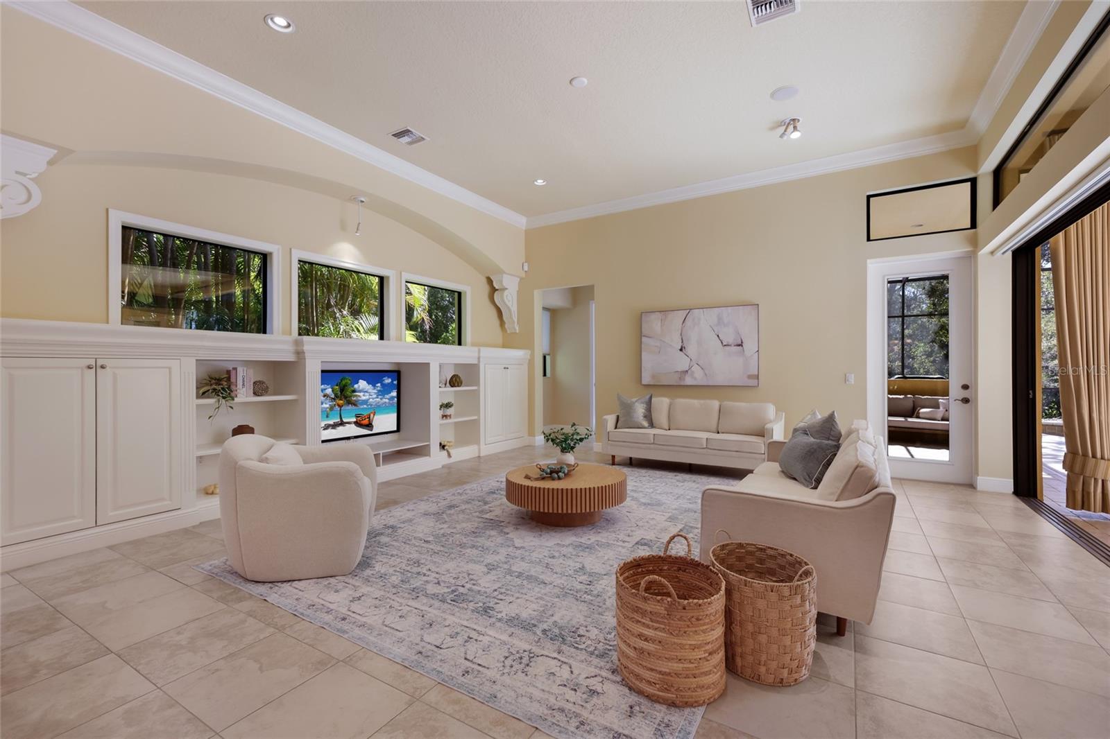 Situated on a lushly private and open south-facing preserve setting in The Country Club of Lakewood Ranch, this one-story three bedroom plus den residence showcases elegant architectural detailing throughout, volume coffered designer ceilings, a combination of IMPACT windows/sliders and hurricane protection throughout, and even a GENERATOR. Enlarged by four feet from Neal Signature’s original Salerno floor plan offering 2,805 square feet of one-story living with an inviting lanai, abundant under cover entertainment spaces, a large heated pool, travertine decking, and pre-plumbed for an outdoor kitchen. Seamlessly connecting this resort-styled lanai to the oversized great room, living room, kitchen and den are glass doors that reveal a large open living concept with voluminous designer ceilings, large scale windows, crown moldings, corinthian columns and built-in details. Chefs will delight in the well appointed kitchen with sprawling counters, wood cabinetry, stainless steel appliances, wine fridge, a large walk-in pantry, an oversized breakfast nook area, and a light-filled formal dining room. Relax and unwind in the elegant owner’s retreat offering two walk-in closets, direct lanai access, wood flooring, remote window coverings, and a spa-like bath with a dual sink vanity, large soaking tub, invigorating shower and separate water closet. Guests will be right at home in this split bedroom floorplan with two additional guest suites with plantation shutters, newly installed carpeting, and centered by a full bath. Additionally this fine residence offers a privately situated den with built-in office, double tray ceilings, plantation shutters, and the home’s third full bath strategically positioned with direct access off lanai doubling as the home’s pool bath. Other notable highlights of this all encompassing 3,773 total square foot residence in the gated and maintenance-included enclave of Silverwood includes, GENERATOR, a combination of hurricane enclosures and impact windows/slider, 2024 and 2019 AC units, a large laundry room with sink and cabinetry, 8’ interior doors, a 2024 pool heater, and a two-car garage. Within the #1 top-selling master-planned community Lakewood Ranch, known for its vibrant lifestyle and proximity to dining, shopping, polo, community events, etc. PLUS non-mandatory membership opportunities to become a member of Lakewood Ranch Golf & Country Club, which include four 18-hole championship golf courses, tennis, state-of-the-art Fitness center, clubhouses, junior Olympic-sized pool, pickleball and more.