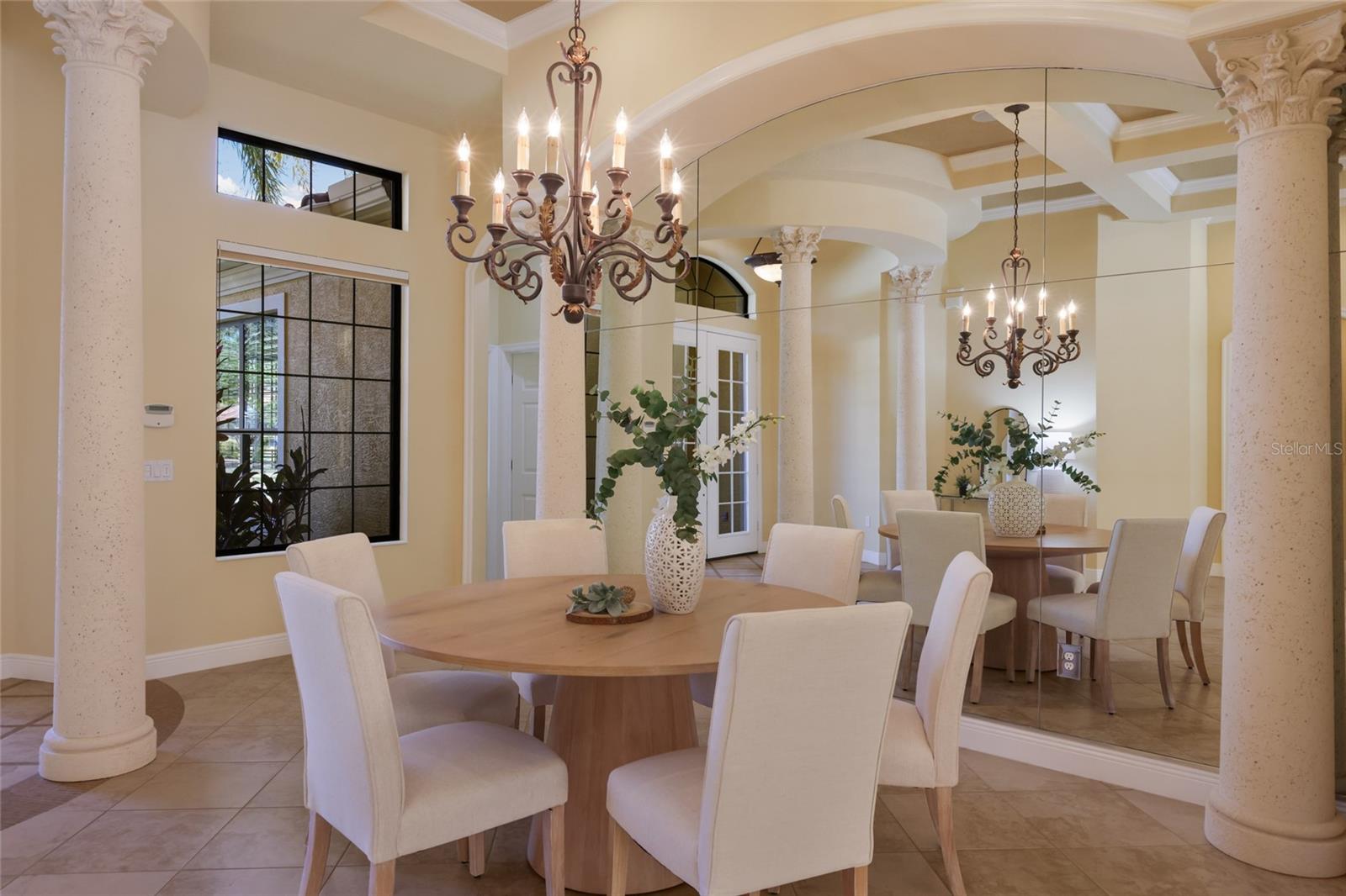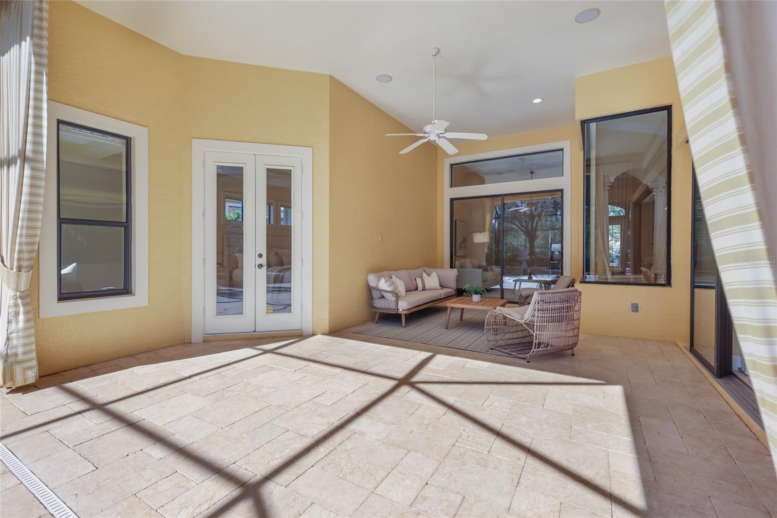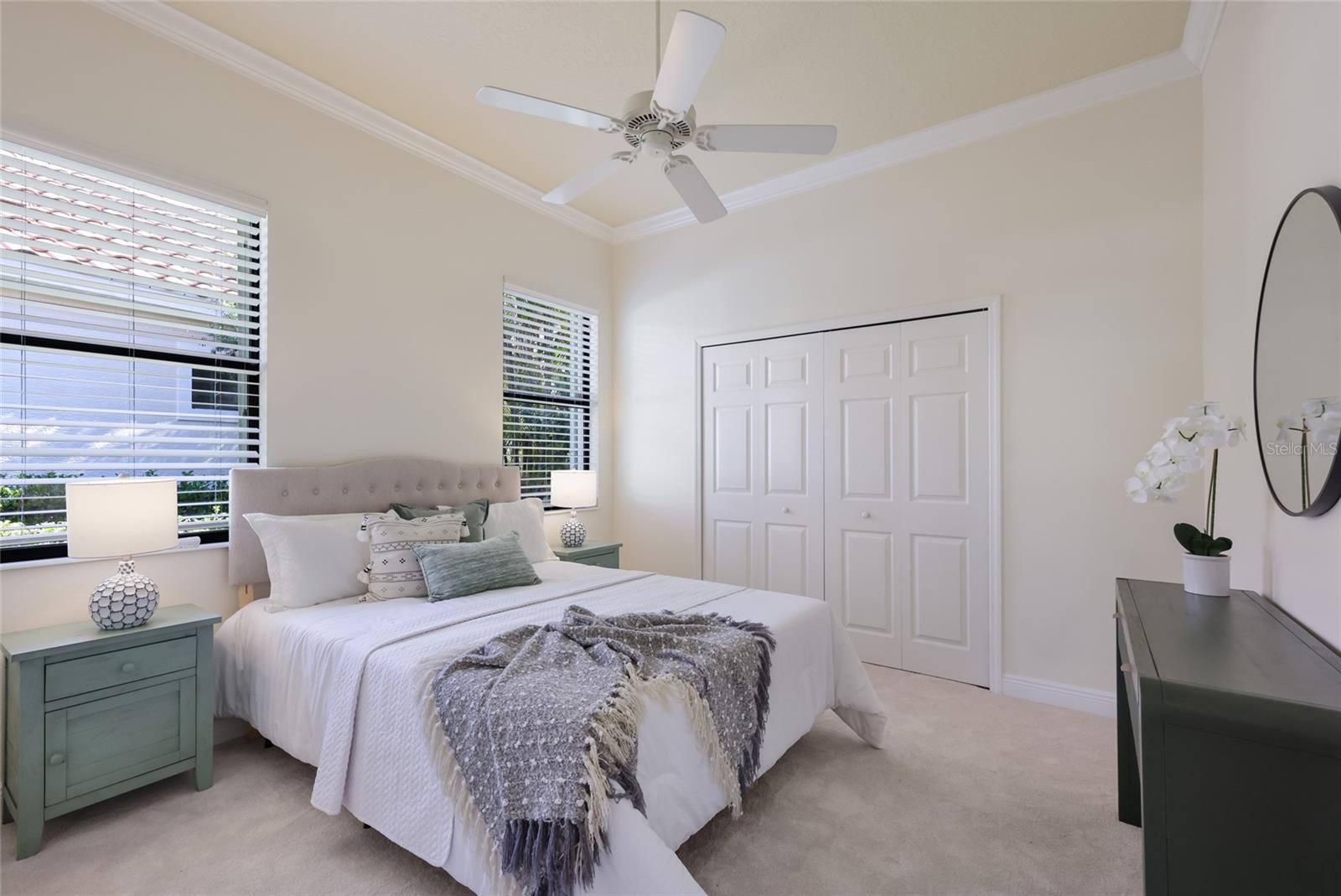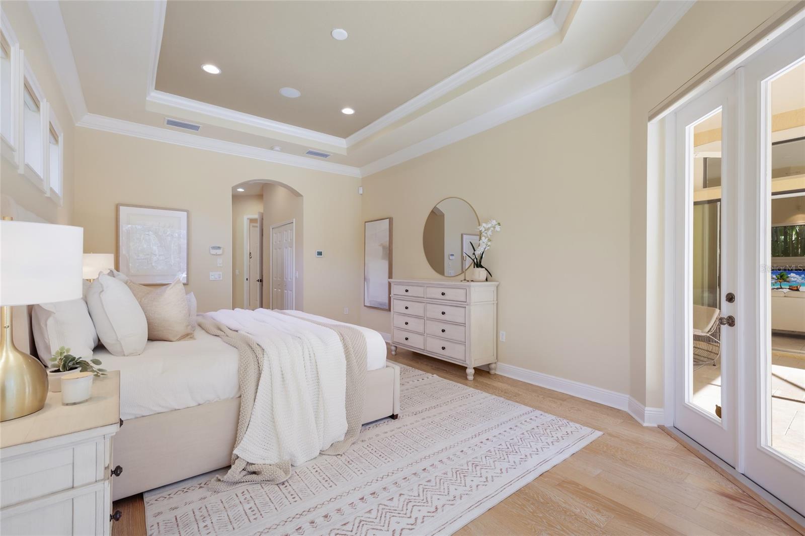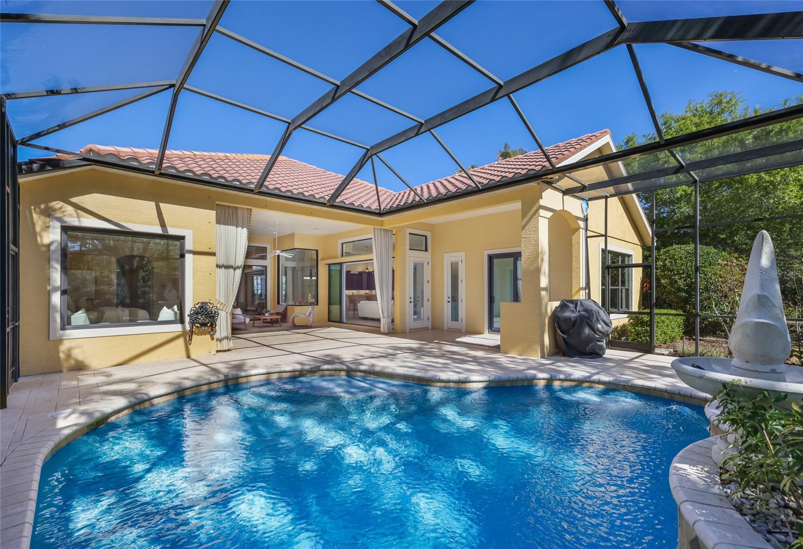 Situated on a lushly private and open south-facing preserve setting in The Country Club of Lakewood Ranch, this one-story three bedroom plus den residence showcases elegant architectural detailing throughout, volume coffered designer ceilings, a combination of IMPACT windows/sliders and hurricane protection throughout, and even a GENERATOR. Enlarged by four feet from Neal Signature’s original Salerno floor plan offering 2,805 square feet of one-story living with an inviting lanai, abundant under cover entertainment spaces, a large heated pool, travertine decking, and pre-plumbed for an outdoor kitchen. Seamlessly connecting this resort-styled lanai to the oversized great room, living room, kitchen and den are glass doors that reveal a large open living concept with voluminous designer ceilings, large scale windows, crown moldings, corinthian columns and built-in details. Chefs will delight in the well appointed kitchen with sprawling counters, wood cabinetry, stainless steel appliances, wine fridge, a large walk-in pantry, an oversized breakfast nook area, and a light-filled formal dining room. Relax and unwind in the elegant owner’s retreat offering two walk-in closets, direct lanai access, wood flooring, remote window coverings, and a spa-like bath with a dual sink vanity, large soaking tub, invigorating shower and separate water closet. Guests will be right at home in this split bedroom floorplan with two additional guest suites with plantation shutters, newly installed carpeting, and centered by a full bath. Additionally this fine residence offers a privately situated den with built-in office, double tray ceilings, plantation shutters, and the home’s third full bath strategically positioned with direct access off lanai doubling as the home’s pool bath. Other notable highlights of this all encompassing 3,773 total square foot residence in the gated and maintenance-included enclave of Silverwood includes, GENERATOR, a combination of hurricane enclosures and impact windows/slider, 2024 and 2019 AC units, a large laundry room with sink and cabinetry, 8’ interior doors, a 2024 pool heater, and a two-car garage. Within the #1 top-selling master-planned community Lakewood Ranch, known for its vibrant lifestyle and proximity to dining, shopping, polo, community events, etc. PLUS non-mandatory membership opportunities to become a member of Lakewood Ranch Golf & Country Club, which include four 18-hole championship golf courses, tennis, state-of-the-art Fitness center, clubhouses, junior Olympic-sized pool, pickleball and more.