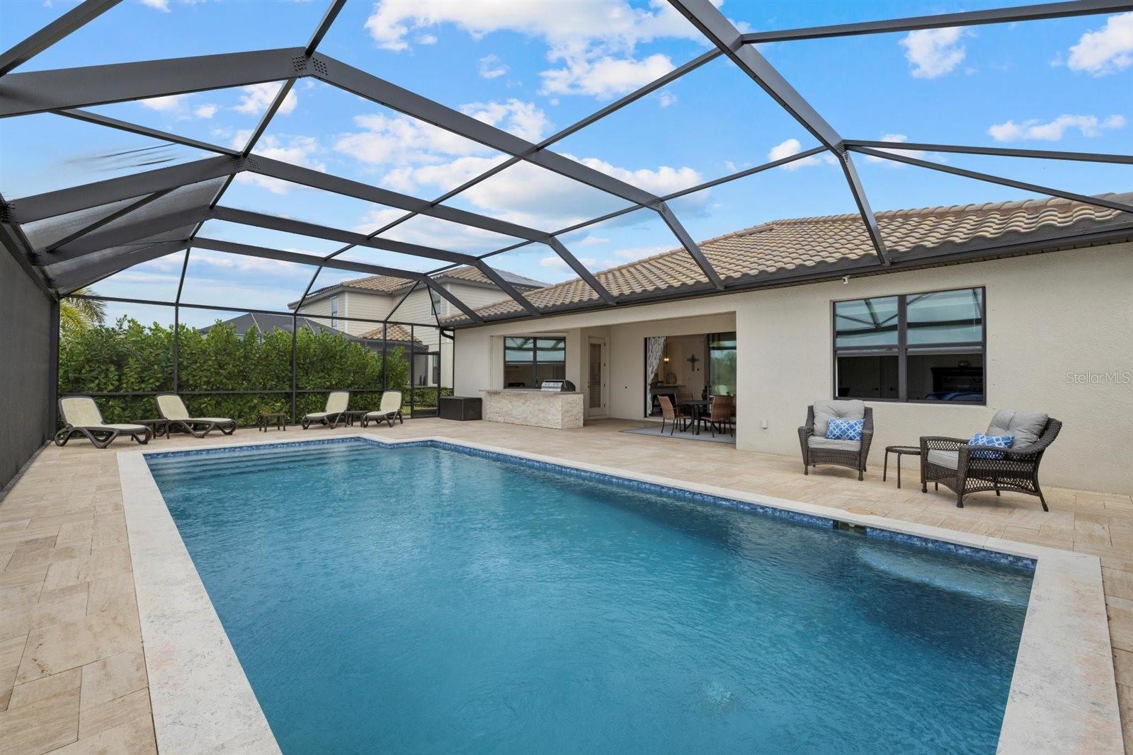 Experience the ultimate backyard paradise in this 4-bedroom, 2-bath home in Polo Run, Lakewood Ranch’s only solar-powered gated community. Spanning 2,268 sq. ft., this home seamlessly blends modern elegance with eco-friendly living—but it’s the outdoor space that truly steals the show. Step outside to your private resort-style oasis, where a custom saltwater pool glistens against the backdrop of one of the largest lakes in Lakewood Ranch. The expansive travertine lanai offers unmatched privacy, creating the perfect setting for relaxation and entertainment. Host unforgettable gatherings in the fully equipped outdoor kitchen, then unwind as you take in spectacular sunsets over the water. Inside, the open-concept layout features a gourmet kitchen with granite countertops and a spacious island, flowing effortlessly into the living and dining areas. The primary suite is a serene retreat with a spa-like en-suite bath and a generous walk-in closet. Polo Run offers resort-style amenities, including a heated pool, fitness center, tennis, pickleball, basketball, playground, clubhouse, and dog park. Just minutes from Waterside Place, UTC, golf courses, and world-class beaches, this home offers the ultimate Florida lifestyle. Don’t miss this rare opportunity—schedule your private showing today!