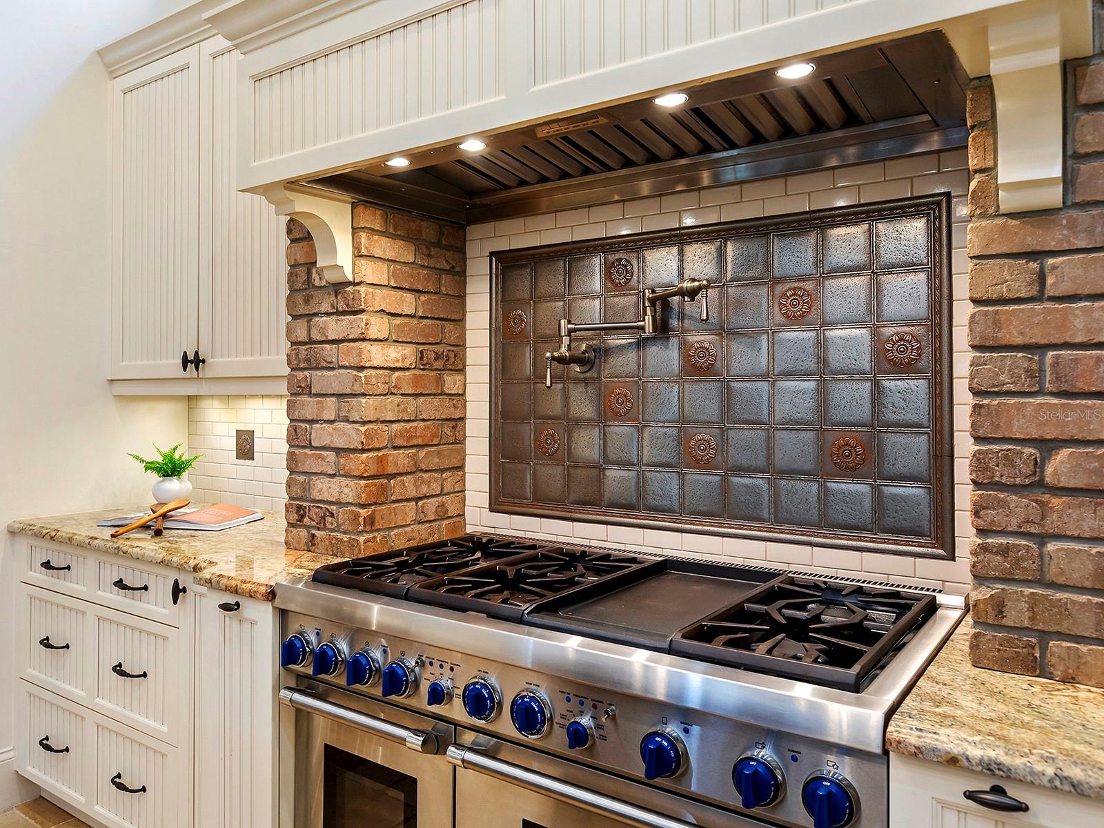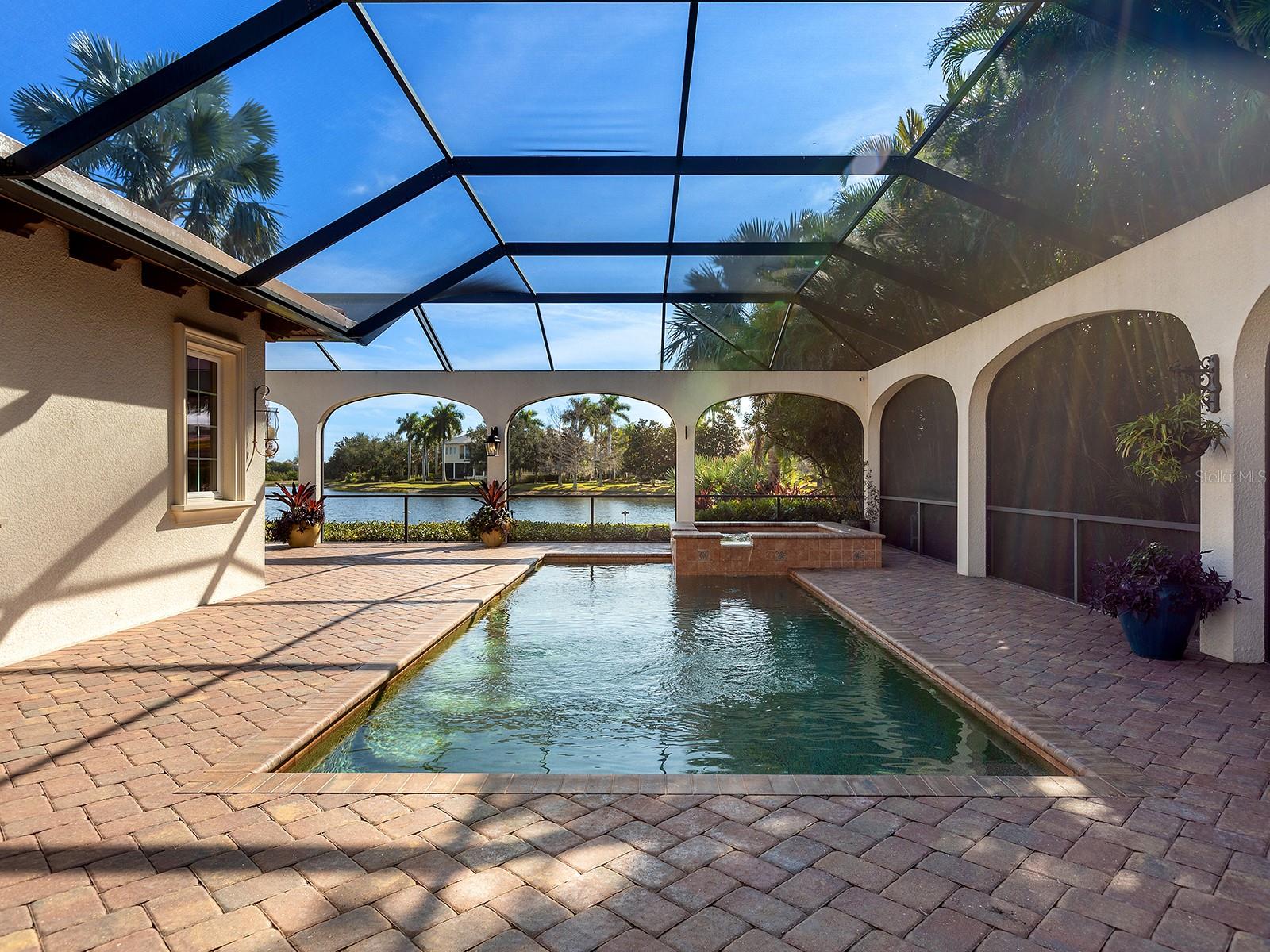 Set within The Lake Club at Lakewood Ranch, this home offers thoughtfully designed indoor–outdoor living, introduced by a gated courtyard entry, paver drive, paver walkways, landscaped grounds, exterior lanterns, and a landscaped front island. Travertine flooring spans the main living areas, with engineered wood floors throughout all bedrooms. A glass front door opens to a foyer with grasscloth wallcovering, while center-pocketing impact-rated sliders connect the great room directly to the lanai. The great room features plaster-textured walls, crown molding, brick archways, soaring 18-foot ceilings with exposed beams, abundant natural light, and motorized shades. The kitchen centers around an oversized island with extended breakfast bar seating and includes a Thermador appliance suite with a paneled refrigerator and freezer, a gas cooktop with griddle, double ovens, a warming drawer, a microwave, a paneled Bosch dishwasher, and a U-Line wine cooler. Additional features include granite countertops, a coffee bar, pot filler, decorative backsplash framed by wood and brick, custom pantries, and upgraded lighting, with the dining area positioned nicely between the kitchen and family room, making it ideal for entertaining. The primary wing features French doors to the lanai and is adorned with walls of windows overlooking the pool, fire pit, and lake. Additionally, this primary suite is appointed with crown molding, designer draperies, and motorized blinds. The luxurious bath offers separate granite vanities, a floor-to-ceiling tiled walk-in shower, a sunken soaking tub framed by windows, and a private water closet. The expansive custom closet includes built-ins, a center island with locking drawers, an integrated hamper, and a chandelier. Both guest bedrooms are en-suite. One guest bedroom is equipped with a double-door entry and a custom Murphy bed, and the other offers a built-in closet, granite vanity, and a walk-in shower with ceiling-height tile and a window. Interior features also include a half bath with a brick archway and linen storage, hallway storage, and a laundry room that includes granite counters, ample cabinetry, a sink, a window, and trim detailing. The lanai features a heated saltwater pool and spa with a Pentair heater, paver decking, exposed ceiling beams, dual ceiling fans with lighting, motorized shades, remote-controlled awnings, and brick archways. A linear electric fireplace finished in Crema Marfil marble with built-in bench seating and a gas fire pit overlooking the lake. The outdoor kitchen includes granite countertops, a sink, hood, and complementary brick and Crema Marfil finishes. FGBC-certified for energy efficiency and comfort, this smart home features Icynene spray-foam insulation, LED lighting, tankless gas water heater, whole-house generator, EV charger, whole-house water filtration with reverse osmosis, and Control4 and Sonos whole-home audio. Smart controls manage security, cameras, thermostat, garage doors, motorized blinds, and water heater, while the epoxy-finished garage includes EV and generator hookups. Located in The Lake Club’s maintenance-free section with pool care and landscaping included, residents also enjoy resort-style amenities such as a clubhouse, pool, fitness center, tennis and pickleball courts, dining, social events, and scenic lakes for kayaking and fishing, just minutes from top-rated schools, shopping, dining, and Sarasota’s beaches.