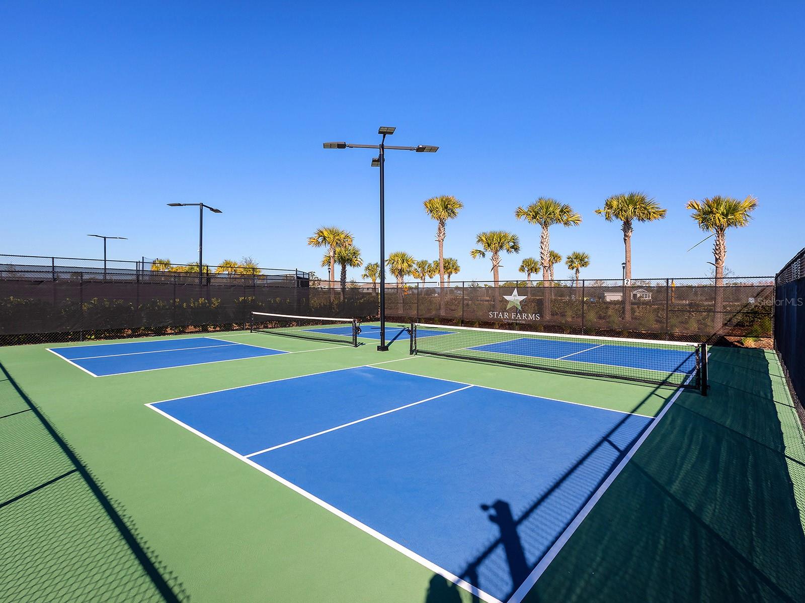 Positioned on a generous homesite within Star Farms, 4218 Butte Trail is a completely customized 2024 Arthur Rutenberg residence with breathtaking sunset, lake, and preserve views. Spanning approximately 6,488 square feet under air, offering 4 bedrooms, 5 full baths, and 2 half baths, thoughtfully designed for both everyday living and large-scale entertaining. Grand iron double-entry doors with frosted glass and soaring transom windows open to a light-filled foyer, flowing seamlessly into the great room, office, and formal dining room. The great room showcases a double tray ceiling, recessed lighting, a striking media wall with modern white tile and a linear fireplace, and walls of sliders opening to the pool and water beyond, while a dedicated gym with sauna, en-suite bath, and oversized windows creates a private wellness retreat. At the heart of the home, the chef’s kitchen features espresso ceiling beams, a large center island, KitchenCraft® cabinetry, powder-blue glass subway tile to the ceiling, and premium appliances including Sub-Zero refrigeration, Wolf double wall ovens, Wolf induction cooktop and hood, Cove dishwasher, and Wolf microwave, along with a Moen faucet and Blanco undermount sink. A spacious walk-in pantry offers custom shelving, generous counters, and a secondary café refrigerator, while reverse osmosis is conveniently located at the main kitchen sink. Nearby, the breakfast nook opens via zero-corner sliders to outdoor dining. The formal dining room connects to a glass-enclosed wine room and butler’s pantry with a wine cooler and glass-paneled cabinetry, while the private office impresses with soaring ceilings, statement chandeliers, plantation-shuttered windows, and frosted pocket sliders. The primary suite is a tranquil retreat with triple tray ceiling, five sunlit windows, custom walk-in closets (one with center island), and a spa-inspired bath featuring a freestanding Kallista soaking tub, dual vanities with makeup area, oversized glass shower with rainfall feature, steam capability, and private water closet. Upstairs, a wide staircase leads to two guest suites with en-suite baths and a large bonus room with a wet bar, refrigerated drawers, tray ceiling, zero-corner sliders, and sweeping lake and preserve views, opening to a covered terrace with tongue-and-groove ceiling and wood-look tile flooring. Outdoor living rivals a private resort with a screened lanai featuring tongue and groove ceilings, recessed lighting, dual ceiling fans, dining and lounge areas, an outdoor linear fireplace, a swim-up counter, and a fully equipped outdoor kitchen with a Wolf grill, sink, and refrigerator. The infinity-edge pool and spa are surrounded by expansive paver decking with multiple seating areas, a discreet dog run, and dedicated pool storage overlooking peaceful water views. Additional highlights include plantation shutters, Hunter Douglas remote shades, abundant storage, a whole-home generator, a whole-home water filtration & conditioning system, security cameras, a tankless water heater, epoxy-finished garages with separate two-car bays, overhead lighting, and wiring for four EV charging stations. Residents enjoy Star Farms’ resort-style amenity centers with pools, fitness facilities, pickleball and tennis courts, dog parks, and scenic walking paths. Star Farms is ideally located near world-class beaches, championship golf, premier medical facilities, and an array of shopping and dining.