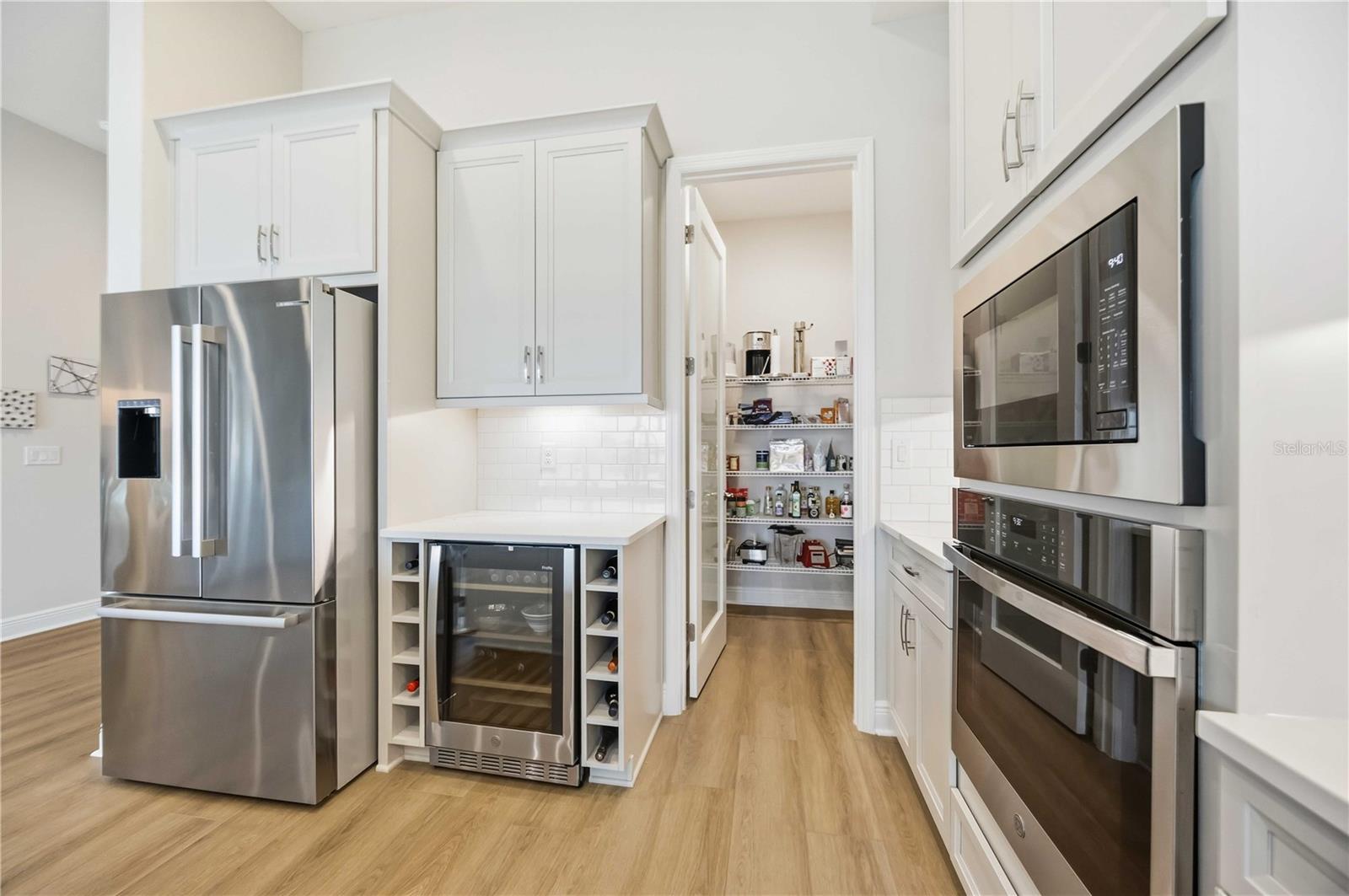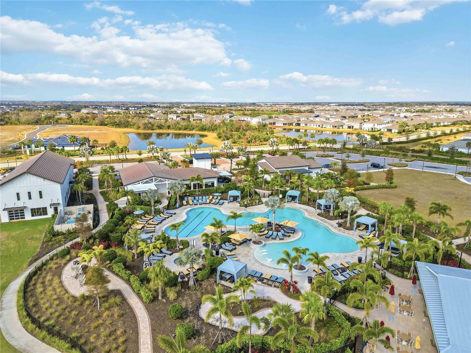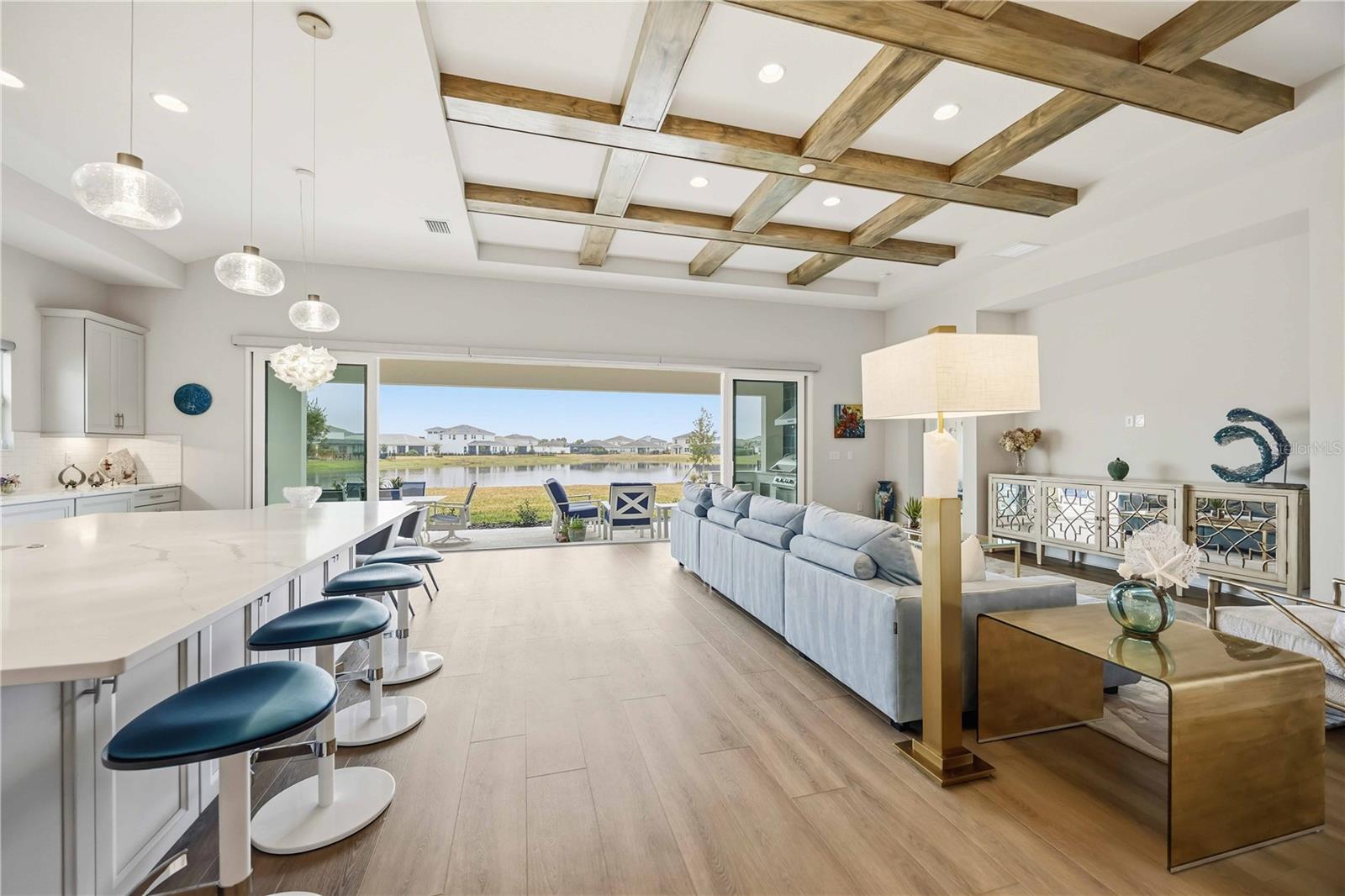 Impeccably maintained Bayport II model by Homes by WestBay, completed October 27, 2025, and now offered as a luxury resale in the highly sought-after Star Farms community of Lakewood Ranch. this move-in ready waterfront residence offers the look and feel of new construction with extensive designer enhancements already in place—and just a two-minute walk to the Palm Bar restaurant for effortless resort-style dining and socializing. The open-concept floor plan features luxury vinyl plank flooring and a gourmet kitchen with quartz countertops, Italian fixtures, apron-front sink, frosted glass pantry door, custom cabinetry, built-in wine cabinet and GE beverage center, Bosch refrigerator, GE Profile 36-inch cooktop, dishwasher, and Moen disposal—perfect for both everyday living and upscale entertaining. The primary suite serves as a private retreat with a spa-inspired bath featuring a dual shower heads, stand-alone soaking tub, dedicated vanity space, and an enhanced custom walk-in closet with built-in drawers, additional cabinetry, clothes hamper and shelving for optimal organization. Three additional bedrooms provide exceptional flexibility for multi-generational living or guests all with walk in closets and with two offering private en-suite baths. French doors highlight the flex/dining room, while the upstairs bonus room—pre-plumbed for a future wet bar—adds valuable additional living and entertaining space. Laundry room equipped with Electrolux washer, dryer and sink. Outdoor living is elevated with a fully equipped outdoor kitchen featuring built-in grill, side grill, hood, sink, integrated trash receptacle, cabinetry, and shelving. Electric and gas lines are already installed for a future pool and spa, making this home truly pool-ready while enjoying peaceful water views. Additional luxury features include all impact windows, custom blinds and window treatments throughout, 8-foot interior doors, plumbing for a water softener, and refined finishes reflecting WestBay’s superior craftsmanship and attention to detail. Located in Star Farms, a gated, resort-style community, residents enjoy multiple pools, fitness centers, clubhouse, pickleball and tennis courts, walking trails, and an active social lifestyle. Conveniently located near top-rated schools, shopping, dining, golf, and everything Lakewood Ranch has to offer. A rare opportunity to own a highly upgraded, nearly new WestBay Bayport II waterfront home with gourmet kitchen, bonus room, impact windows, custom closet system, and pool-ready lot in one of Lakewood Ranch’s premier communities.