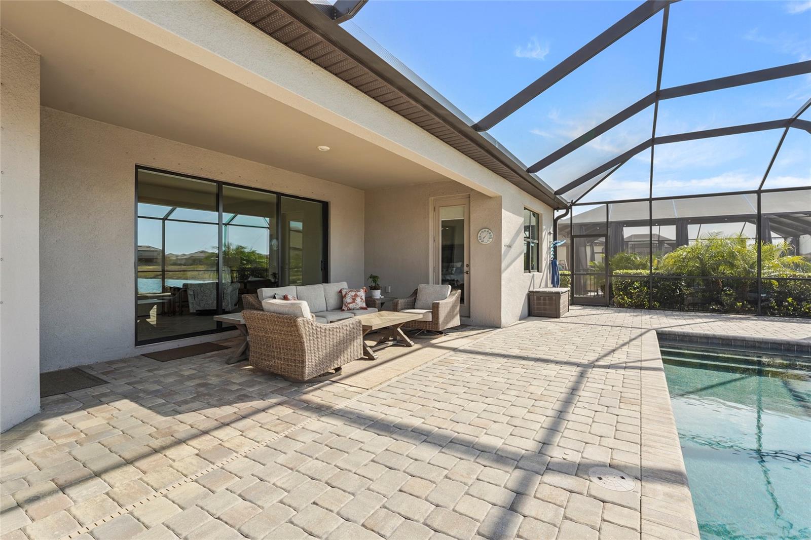 Welcome to this beautifully like-new, barely lived-in 4-bedroom, 2-bath home in the highly desirable Lorraine Lakes community. Offering 2,239 square feet of thoughtfully designed living space, this residence blends comfort, style, and an incredible long lake view that truly sets it apart. From the moment you arrive, the paver driveway and tile roof create impressive curb appeal. Inside, you’ll find a bright, open-concept layout perfect for everyday living and entertaining. The spacious living and dining areas flow seamlessly into the modern kitchen, which features new appliances, an upgraded dishwasher, gorgeous finishes throughout, and a charming café area just off the kitchen—ideal for casual dining or morning coffee with a view. The primary suite is a true retreat, highlighted by a luxurious super shower and granite countertops in the bathroom. Three additional bedrooms provide flexibility for family, guests, or a home office. Step outside to your expansive screened lanai and take in the peaceful, long water view and beautiful sunsets. Relax in your private pool and spa, where the hot tub spills beautifully into the pool—creating the ultimate Florida outdoor living experience. Fences are allowed, offering added versatility for pets or added privacy. Additional upgrades include a tankless water heater, painted 3-car garage with ample storage, and numerous thoughtful enhancements throughout the home. Located in the gated community of Lorraine Lakes, residents enjoy resort-style amenities including a state-of-the-art fitness center, tennis and pickleball courts, indoor basketball, walking trails, bocce ball courts, and a full-service restaurant and bar—delivering an unmatched lifestyle experience right within your neighborhood. This home perfectly captures the Florida lifestyle—luxurious, active, and centered around stunning water views. Select, newly acquired furnishings may be offered separately.