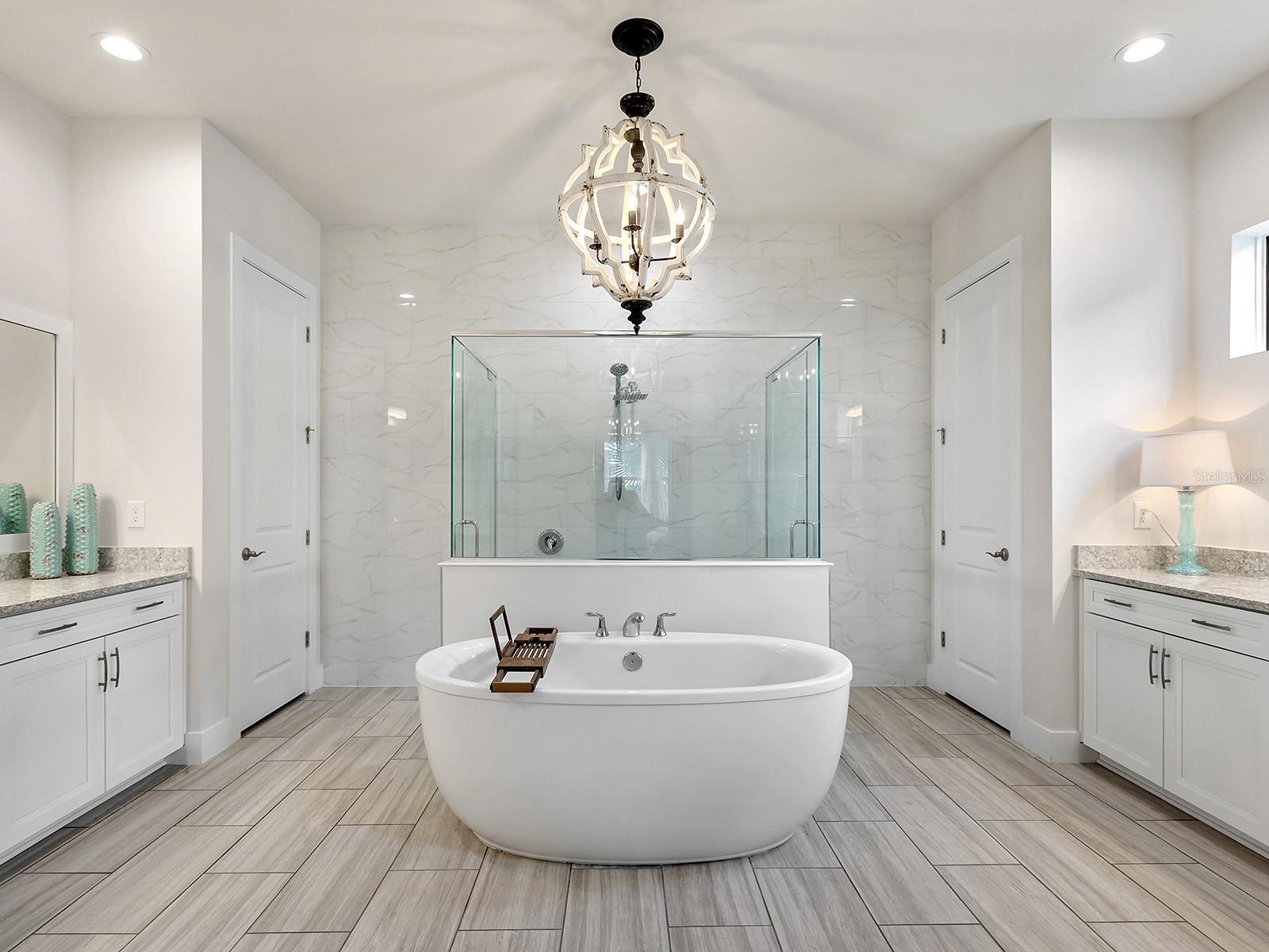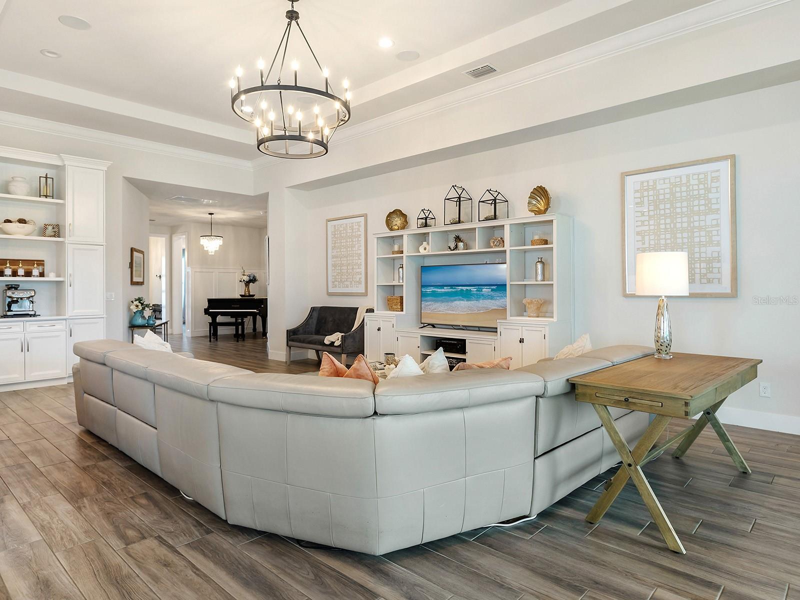 Thoughtfully upgraded beyond its original specifications, this 2022-built Carver floorplan by Toll Brothers presents a refined residence designed for both everyday comfort and elevated entertaining. With 3 bedrooms, 3 full baths, and 1 half bath, the residence is unified by wood-look plank tile flooring throughout, crown molding and custom trim in multiple rooms, designer lighting selections, dimmer switches, and automatic lighting in key areas, including the garage, kitchen, pantry, office, and primary closet. A two car extra-large garage with room for golf cart, surround sound in the great room and lanai, and manicured landscaping with mature plantings further enhance the home’s polished presentation. A covered front porch, accented by custom trim, leads to the glass-paneled front door. Inside, the spacious foyer opens to a versatile open space framed by custom-trimmed walls before unfolding into the main living areas. The great room is open and expansive with in-ceiling surround sound speakers and a custom entertainment wall. Large sliding glass doors draw in natural light and create a seamless connection to the outdoor living space. The kitchen reflects extensive upgrades, highlighted by white shaker cabinetry extending to the ceiling with crown molding, brushed brass hardware, quartz countertops, under-cabinet lighting, a white geometric tile backsplash, and a walk-in pantry. A suite of KitchenAid stainless steel appliances includes double wall ovens, a vent hood, a refrigerator, a dishwasher, a microwave drawer within the island, and a five-burner gas cooktop. The oversized island with seating and storage anchors the space, while the kitchen is complete with a custom-built-in coffee bar with open shelving. Adjacent to the kitchen, the dining area opens to the kitchen and boasts two large windows with designer draperies and sliding glass doors to the lanai. The office, enclosed by double French doors, is generously sized and very private. The half bath is appointed with a pedestal sink, mirror and is centrally located for guests. The primary suite features a spacious sitting area with large windows and designer draperies, complete with an oversized walk-in closet. The primary bath is expansive, offering dual vanities with granite countertops and ample storage, a built-in makeup vanity, transom windows for natural light, a freestanding soaking tub with wall-mounted filler, a large walk-in shower with seamless glass and floor-to-ceiling tile, and a private water closet. Guest Suite 1 includes a wall closet and en-suite bath with a single vanity, solid surface countertop, large mirror with three-light fixture, tub and shower combination with tile surround, window, and tile flooring. Guest Suite 2 includes a walk-in closet and en-suite bath with a single vanity, solid surface countertop, large mirror with four-light fixture, tub and shower combination with tile surround, window, and tile flooring. The fully covered and screened lanai features paver flooring, recessed lighting, and in-ceiling speakers, with space for dining and seating. The backyard is spacious with room to add a pool if desired. The Isles at Lakewood Ranch offers a resort-style pool, clubhouse, fitness center, tennis, pickleball, basketball, a fishing pond and dog park. Minutes from UTC, Waterside Place, LWR Main Street, Gulf beaches, Mote Aquarium, and the Sarasota Polo Fields, this home blends modern elegance and effortless Florida living.